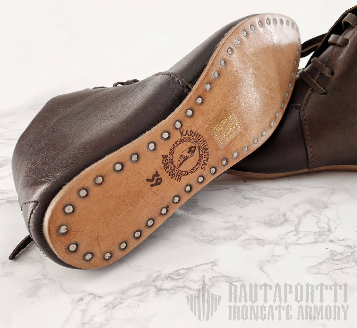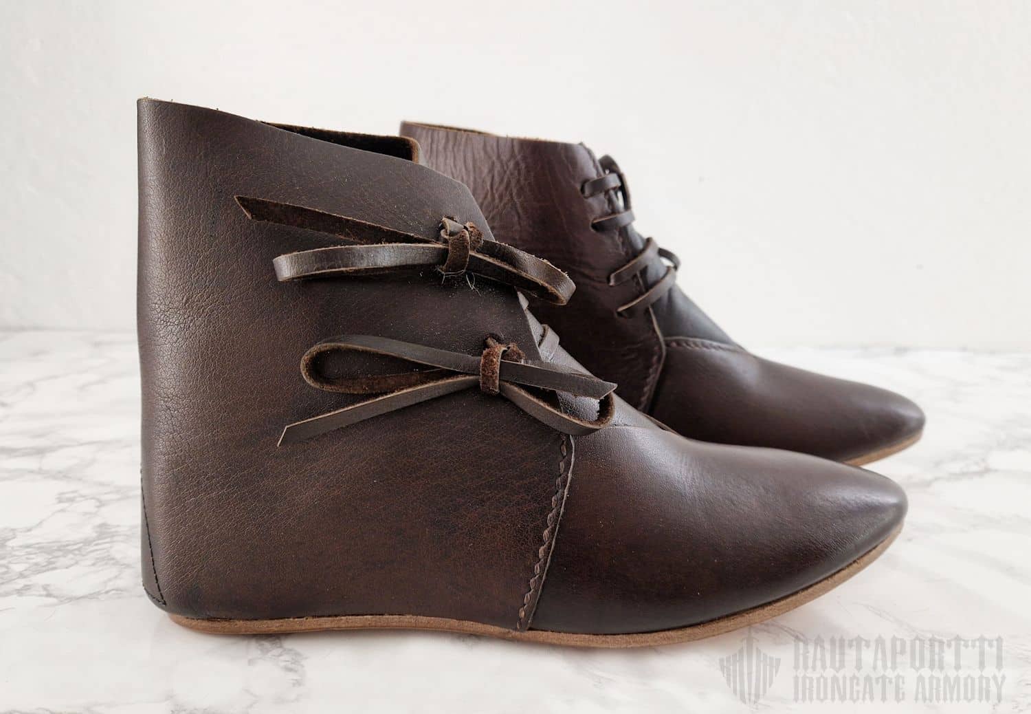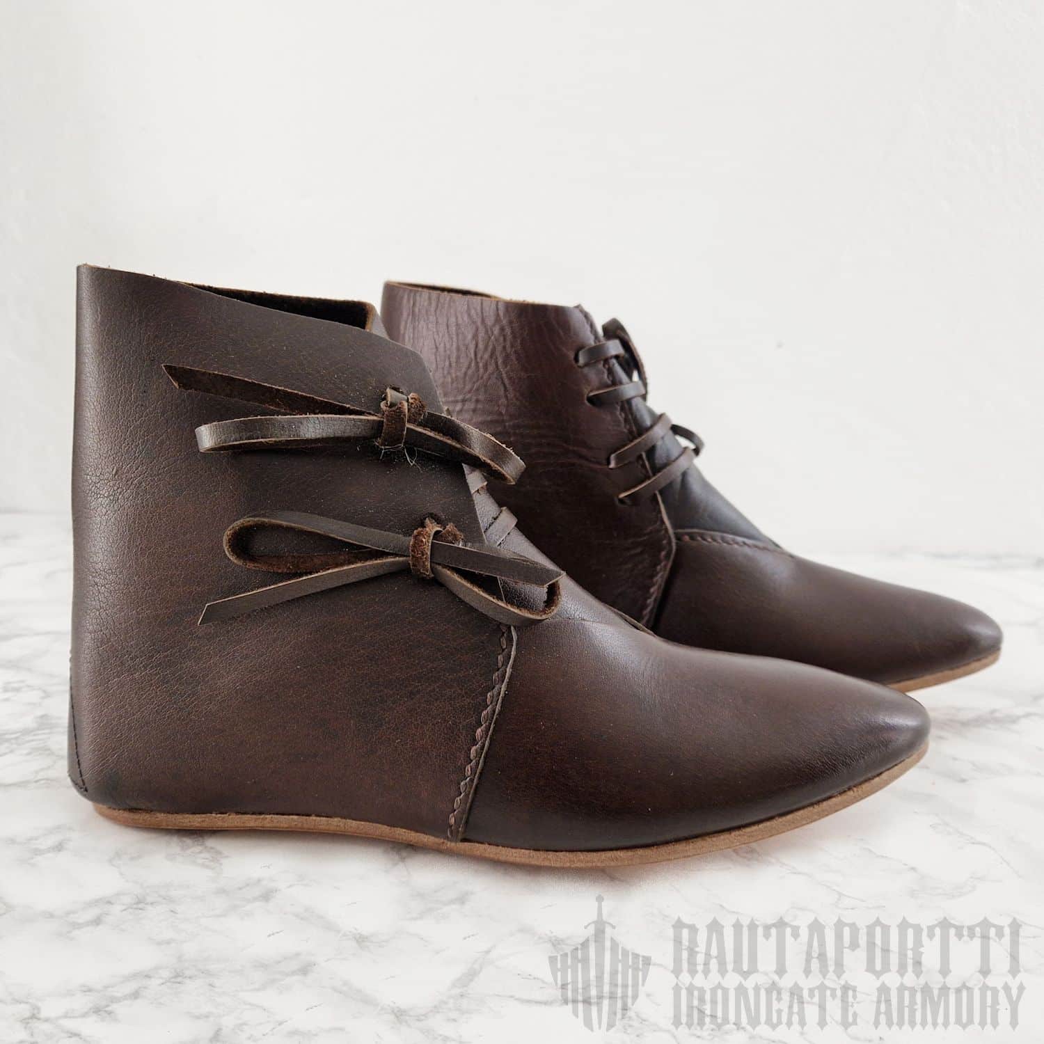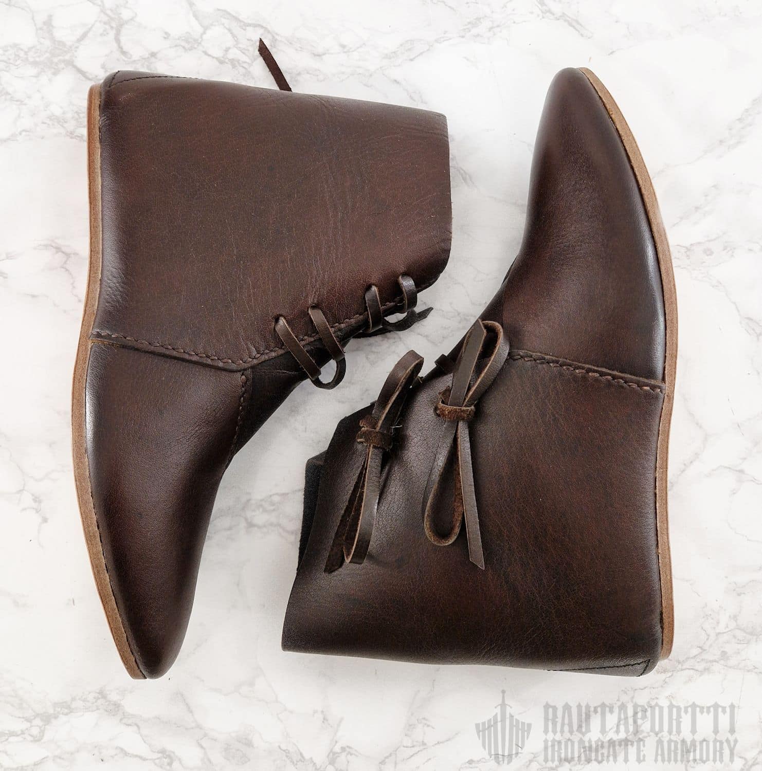Step back in time with these 14th-century ankle shoes, a classic style worn throughout medieval Europe. With their ankle-height design, these shoes were a popular choice for everyday wear during the Middle Ages. These shoes have two leather laces for a secure fit. They are crafted from full leather for durability and historical accuracy. The nailed leather sole ensures both longevity and authenticity.