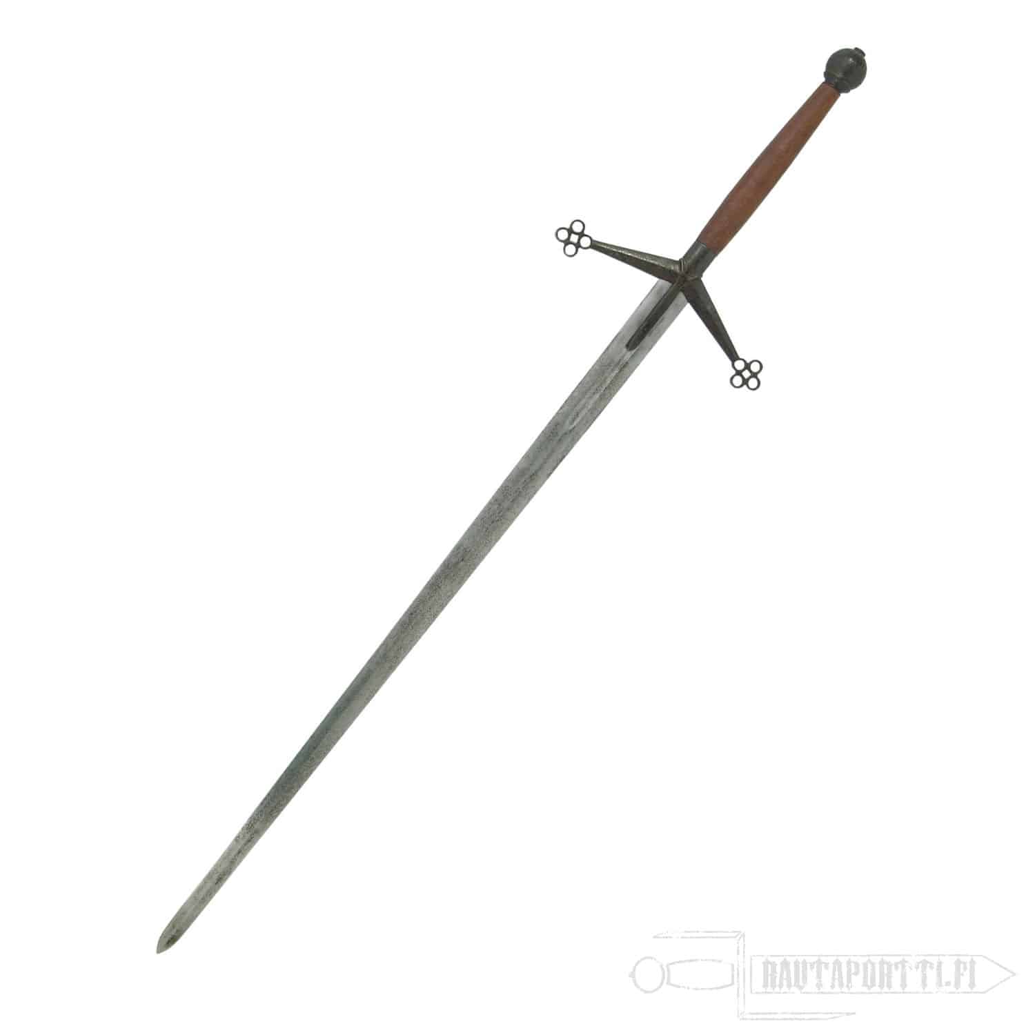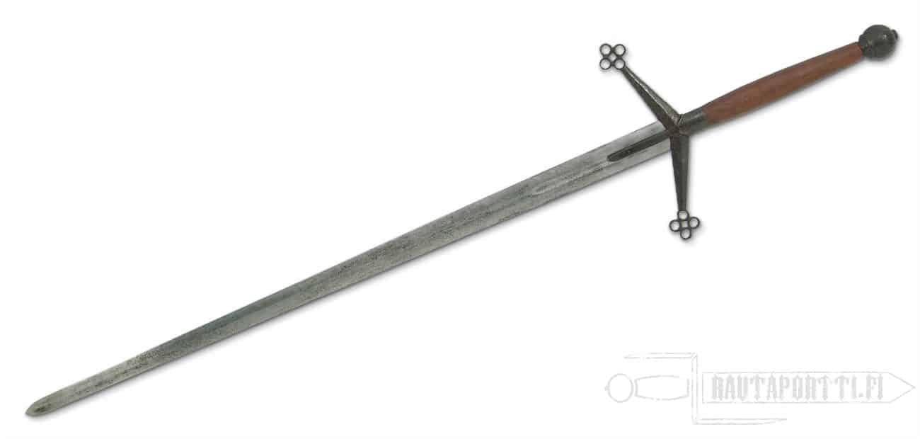 Mainstay of the Highland warriors of the late 15th and 16th centuries, the Claymore had a uniquely styled hilt that sets it apart from other great swords of the period. Typically of two hander length, this versatile weapon could deliver great sweeping slashes or powerful thrusts. Replicated from a surviving museum piece the Hanwei Claymore is classic in its design, with distinctive sloping quillons terminating in quatrefoils and a high-collared quillon block with langets following the blade fuller. The leather-covered grip is topped by a globate pommel. This sword has an antiqued finish, closely replicating that of the original museum piece. Scabbard not included.
