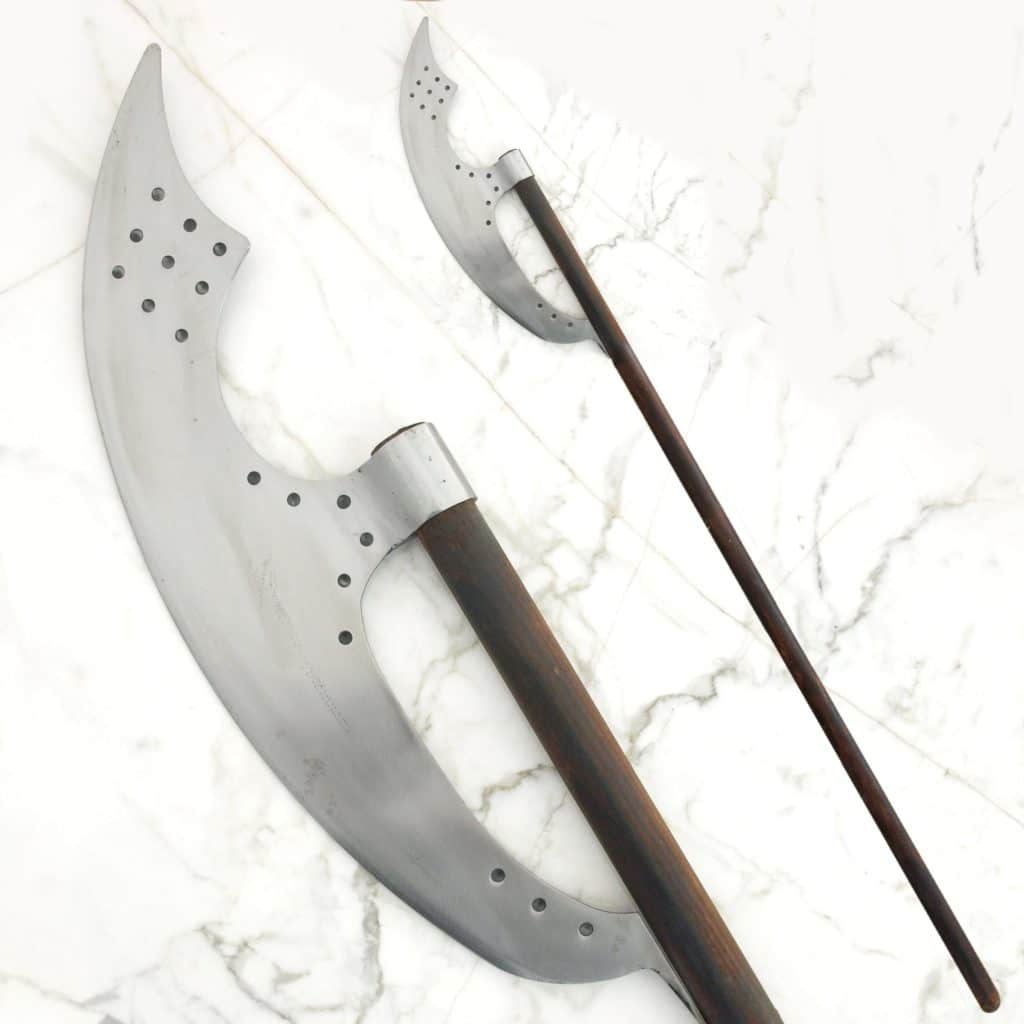 Bardiche (also called Berdiche) is a two handed pole weapon that normally had a heavy and large steel head/blade. The first bardiches were used in the late 14th century, the weapon came a bit more common during 15th century and it was at its most popular during the 16th and 17th centuries. The bardiche was mainly a slavic weapon, used in eastern Europe and Russia, but it was also used in Scandinavia, Germany, Switzerland, as well as around Turkey and in the Middle East. The bardiche developed from the large two handed danish axe favoured by the vikings. The transitional weapon between the dane axe and the bardiche was the Sparth axe, which was very similar to the bardiche and was already in use during the 1250’s.