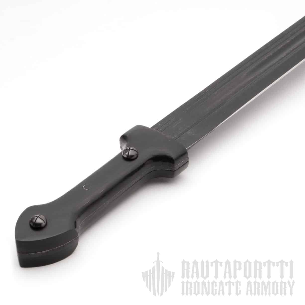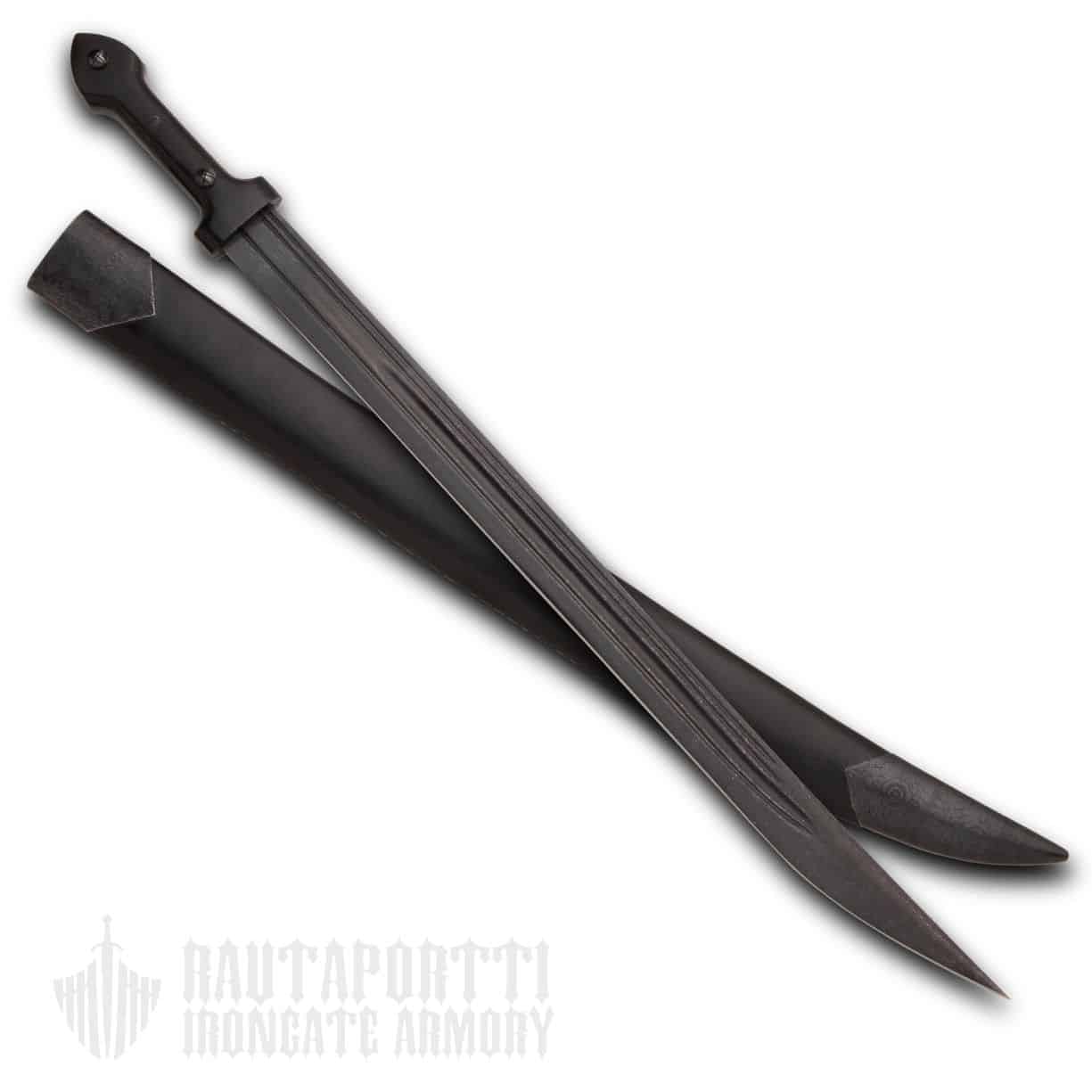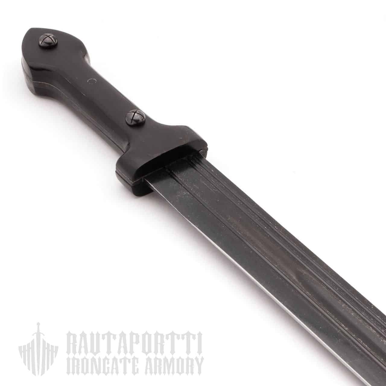 The blade is forged from 1065 high carbon steel with a darkened, battle-hardened finish, full tang, and tempered to a low 50's RC. The fine point endows it with superior piercing power. Multiple blood grooves and a central fuller give this short sword a light, lively feel.