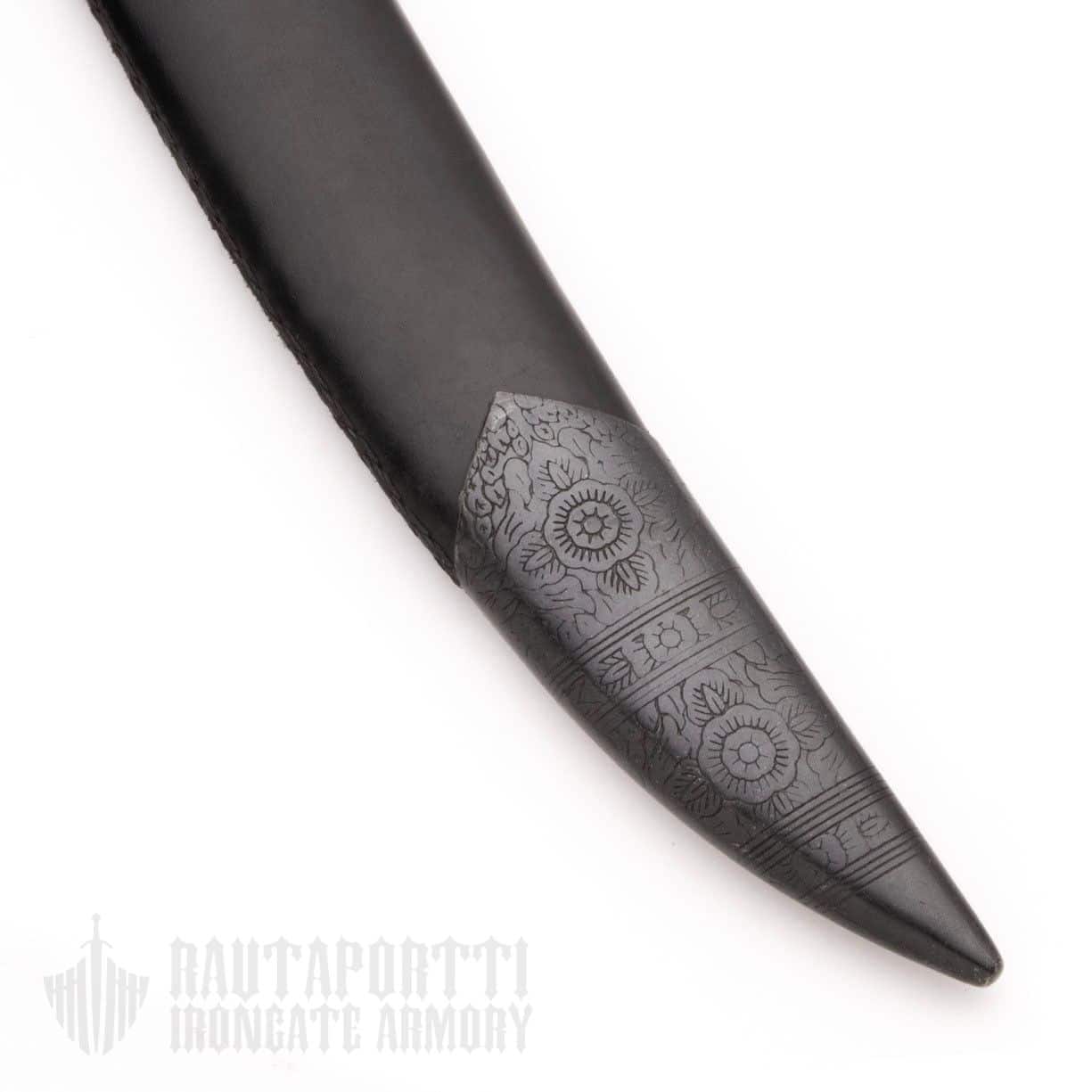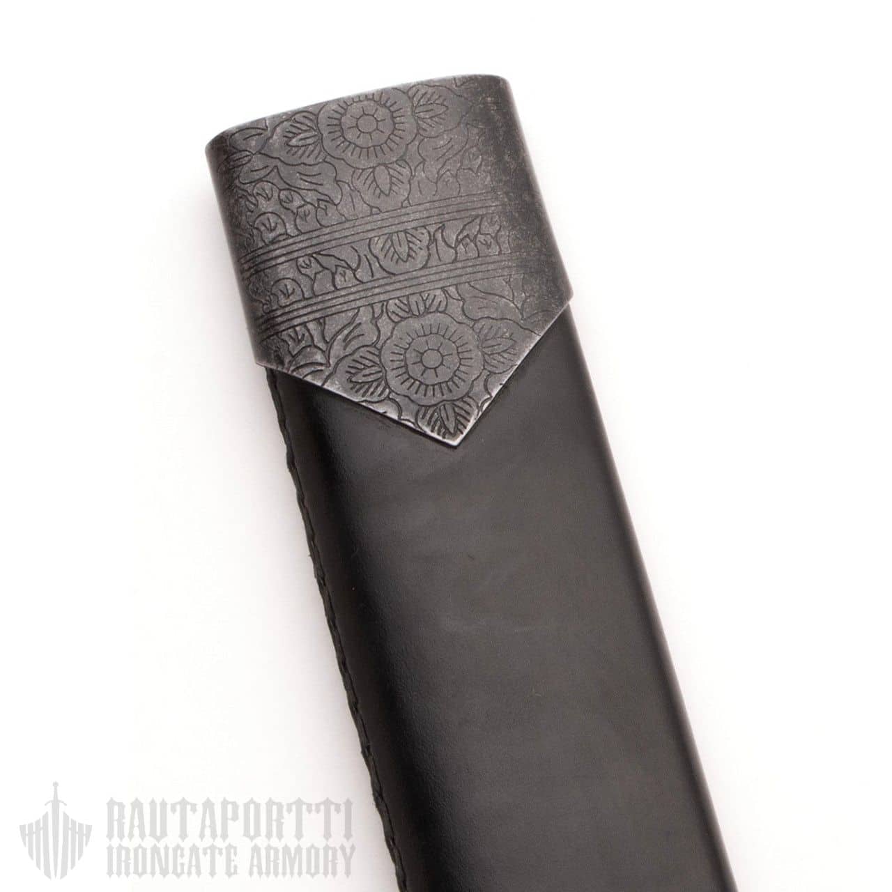 This pre-sharpened weapon has gone through rigorous testing. The hands-on nature of the manufacturing by master smiths makes this line unique. Includes a matching scabbard with belt stop, and certificate of authenticity signed by each smith that touched your blade through every step of the forging process. The leather scabbard has steel throat and chape that are engraved with a traditional floral pattern.