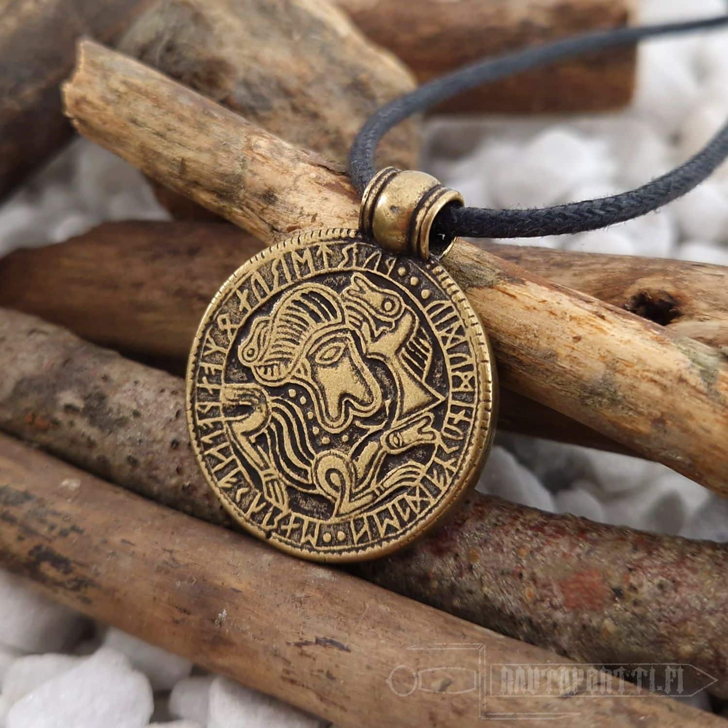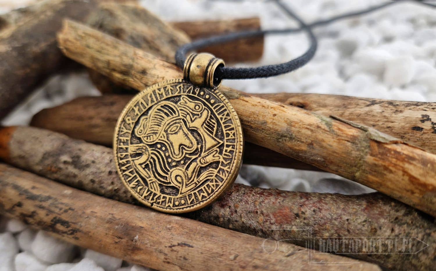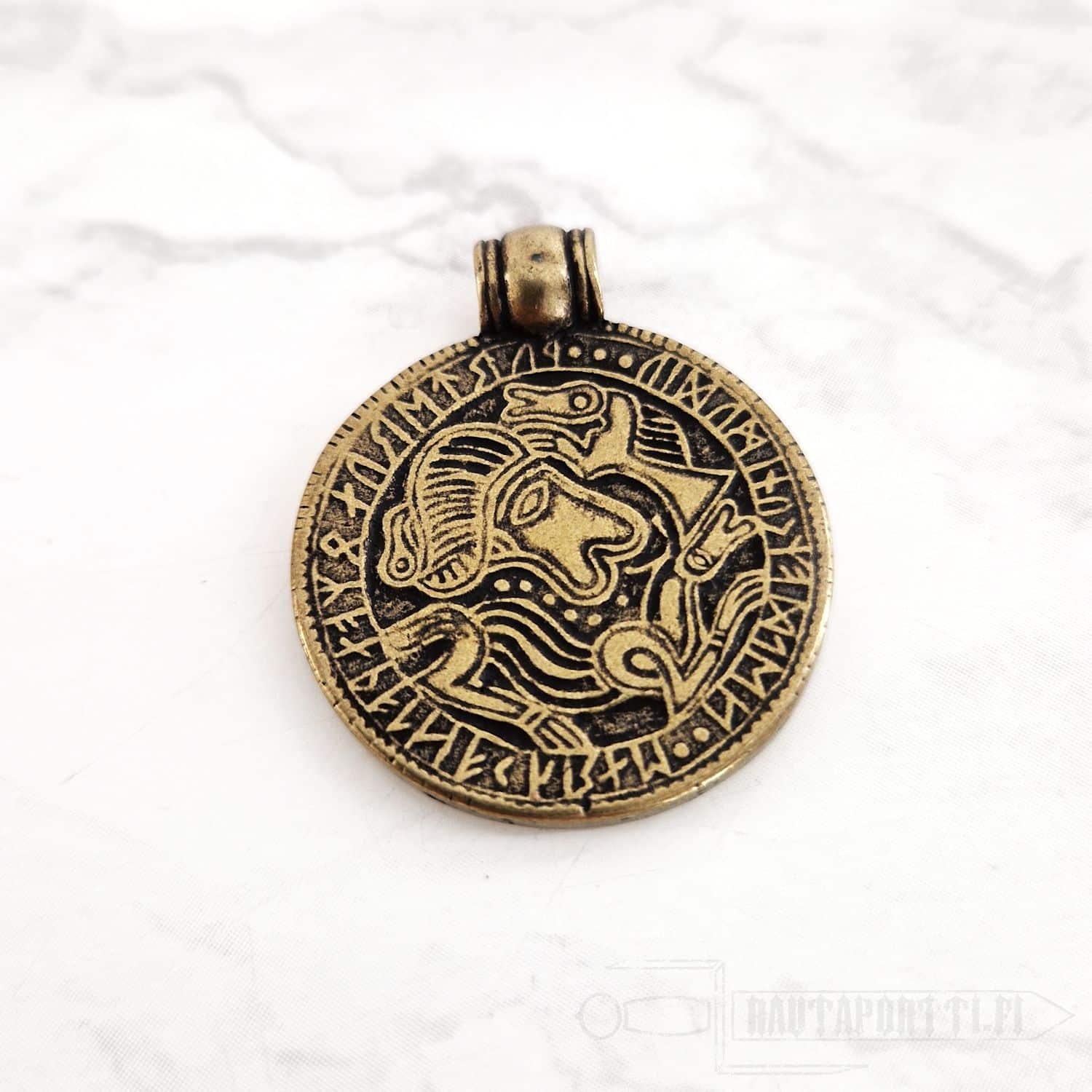 This is a replica of a Germanic bracteate found on the island of Tjurkö, in Karlskrona, Sweden. Bracteates are flat, thin, single-sided gold, silver or bronze medals, similar to coins, worn as jewelry during the migration period. In some places, like in Finland, bracteates were used up until the Viking Era, approx. 800-1000 CE. The bracteates of the Germanic tribes were modelled on Roman medallions, and were mostly worn as lucky amulets, and likely awarded deserving warriors. Medieval coins that are minted with a picture only on the other side are also called bracteates.