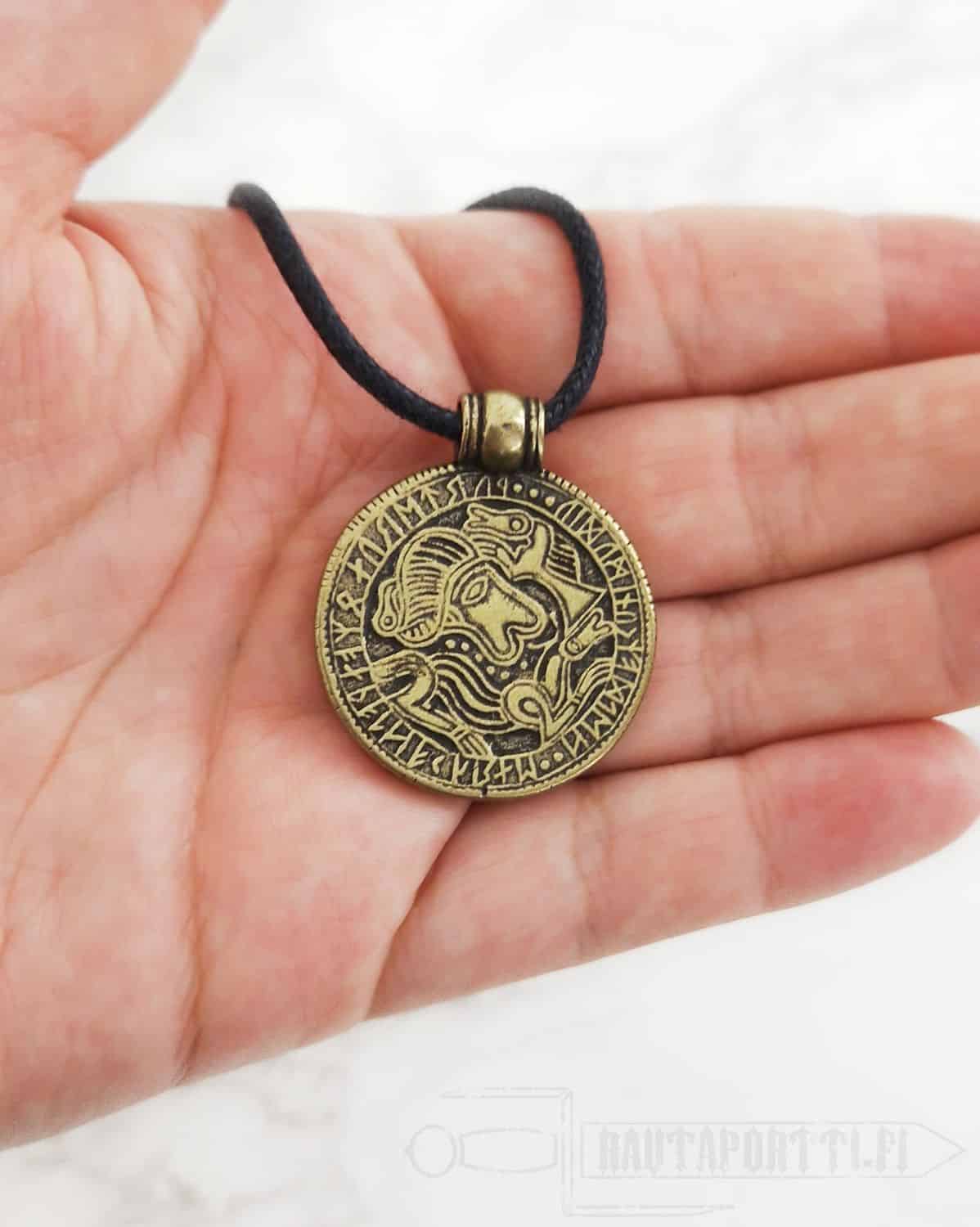 Our Tjurkö Bracteate is made of zamak. It can be worn as a perfect accessory for historical reenactment of the Iron- and Viking Ages, LARP costumes or as everyday jewelry.