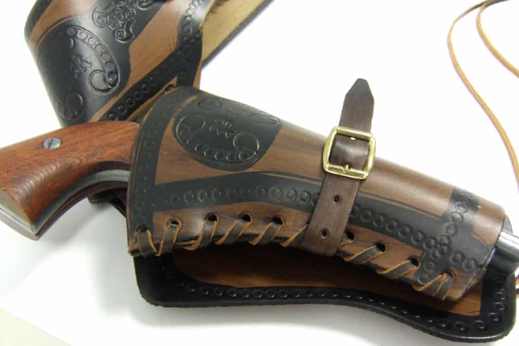 The revolver case has its own buckled leather strap on the outside, so you can tighten the case just right for your own revolver. After all you wouldn’t want your trusty six-shooter to fall out of the case when diving behind a water barrel, or for the case to be too tight and grab hold when you try to pull your revolver as quickly as possible in a duel.