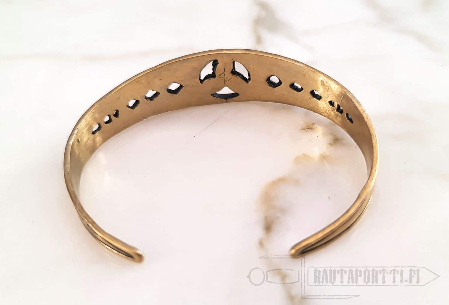 The slender bracelet is made of bronze, and is 1.5 cm wide. The material is pliable, which makes it easy to adjust the bracelet for the individual wrist circumference. It is suitable for wrists 16-19 cm in circumference.
