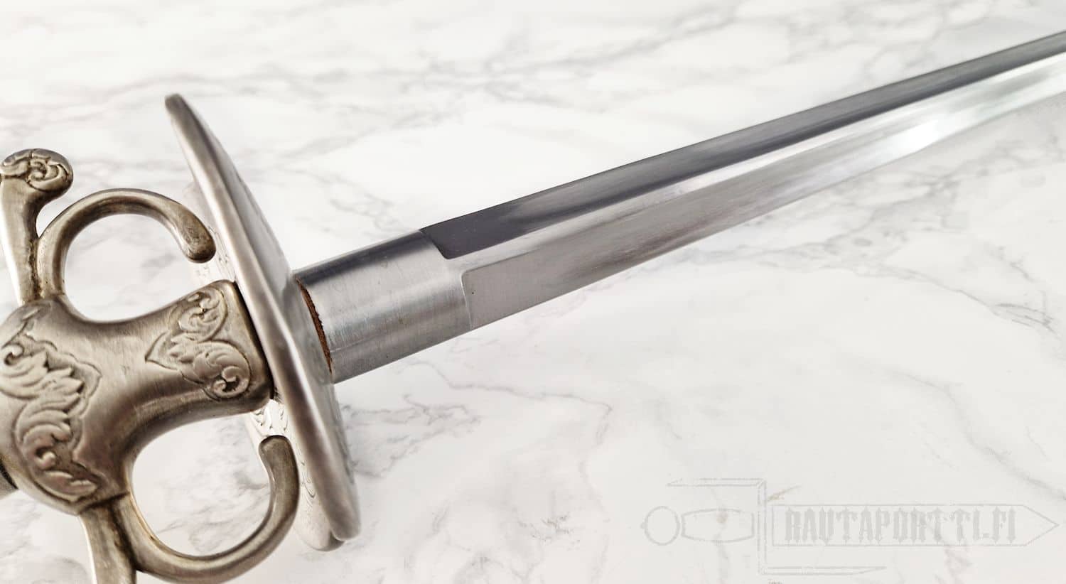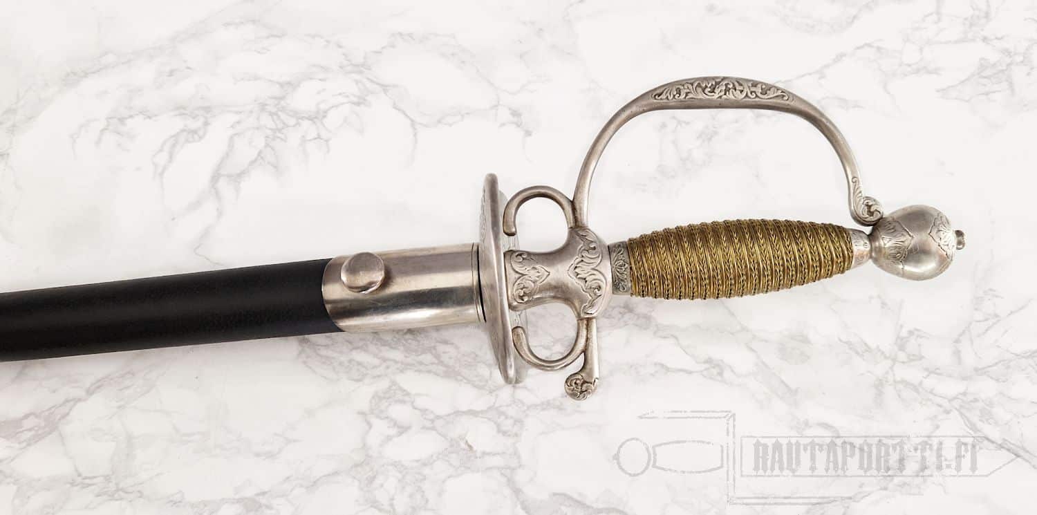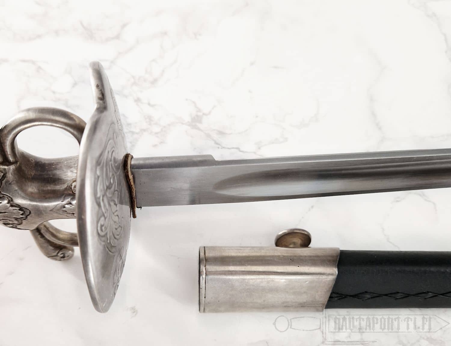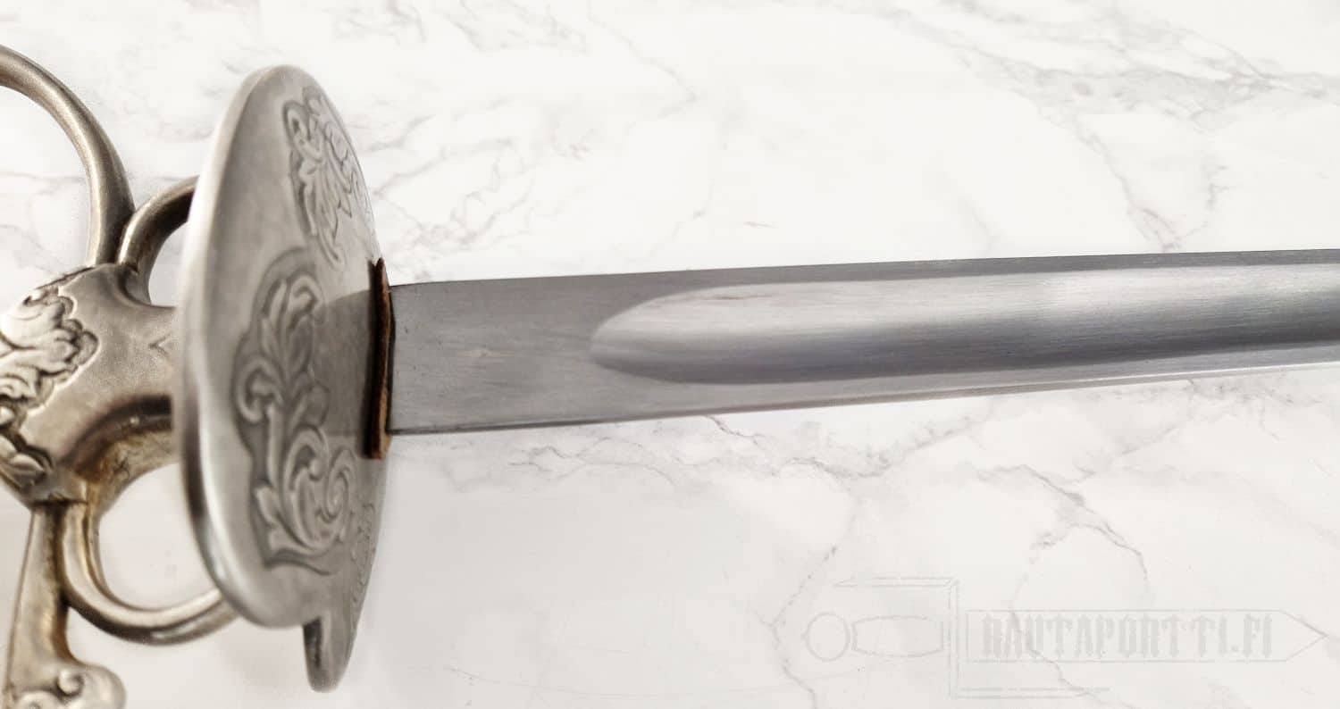 The finely chiseled silver-plated hilt and three-edged hollow ground blade exemplify the consummate skill of the swordsmiths of the period.
