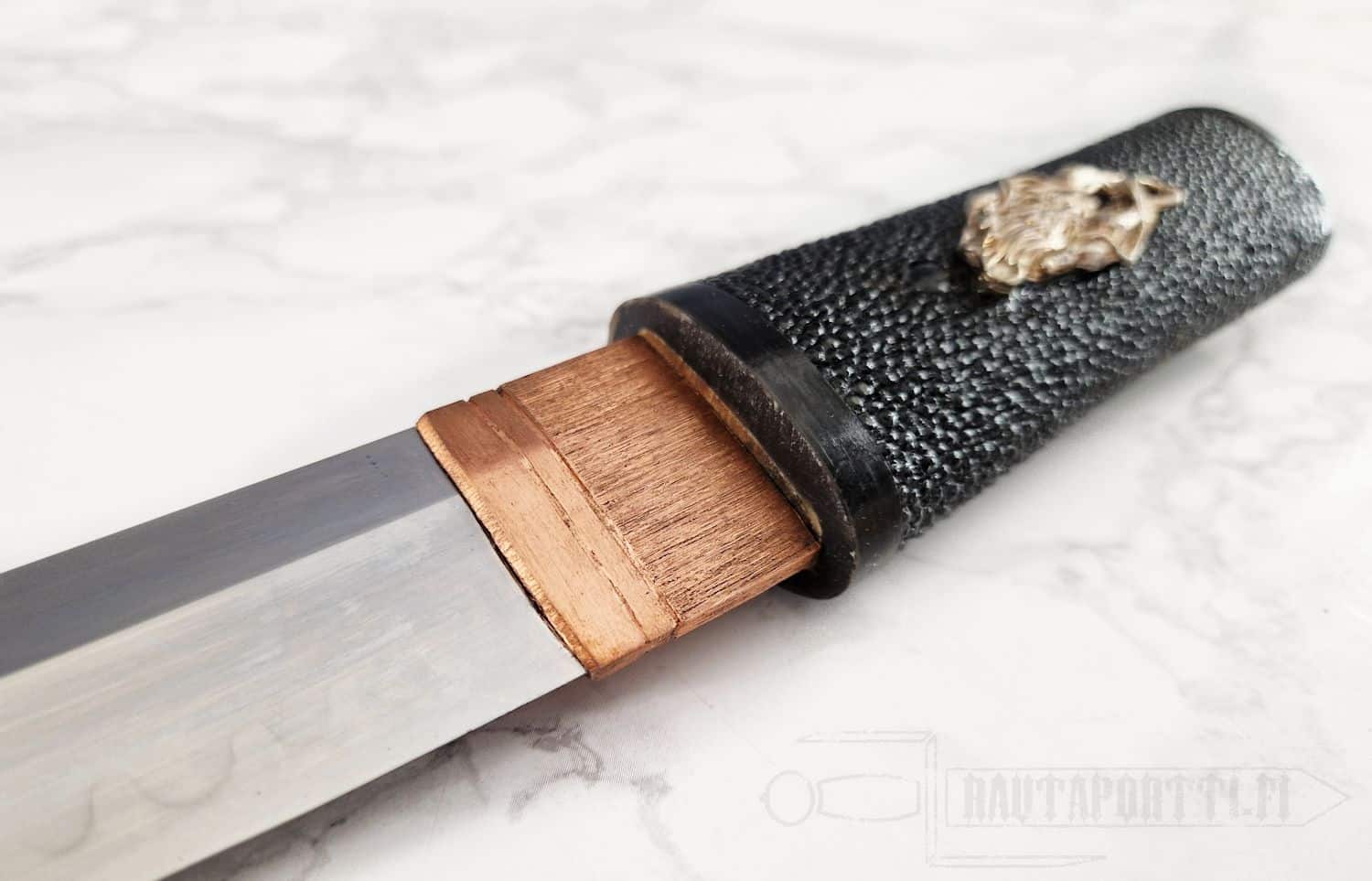All black samegava rayskin wrapped hardwood tsuka is embellished with our custom made silver menukis on both side of the handle. A custom made, and meticulously fitted copper habaki, is sure to set an impressive appearance.