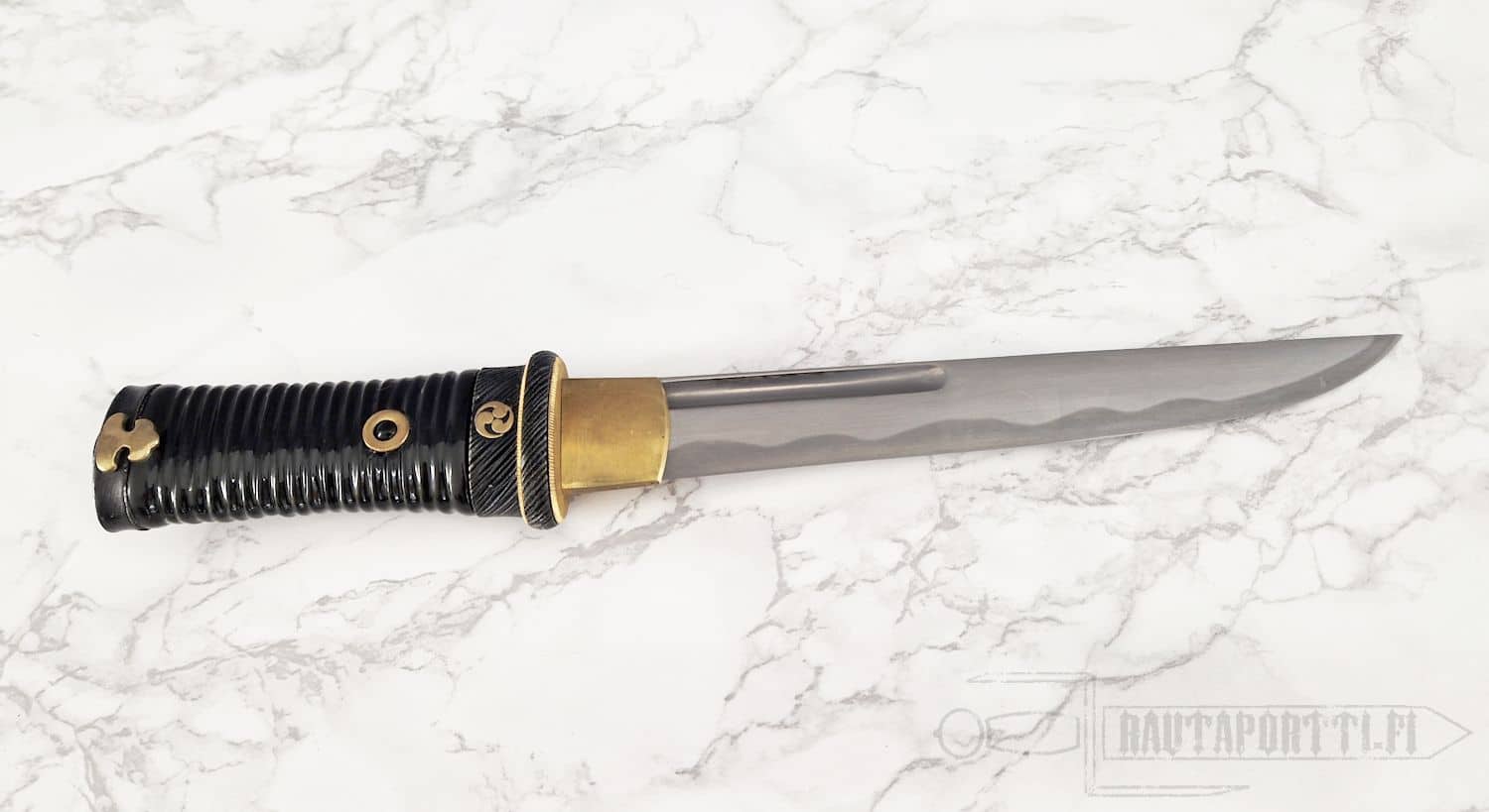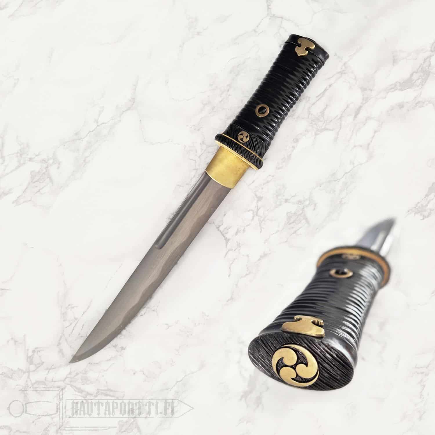 The blade on the Great Wave Tanto is hand-forged from T10 high-carbon steel featuring a long (o)kissaki and is differentially hardened to produce a distinctive hamon. The saya is deeply lacquered in black. The tsuka is made of ribbed buffalo horn. Matching Great Wave Wakizashi and Katana are also available for a complete set.