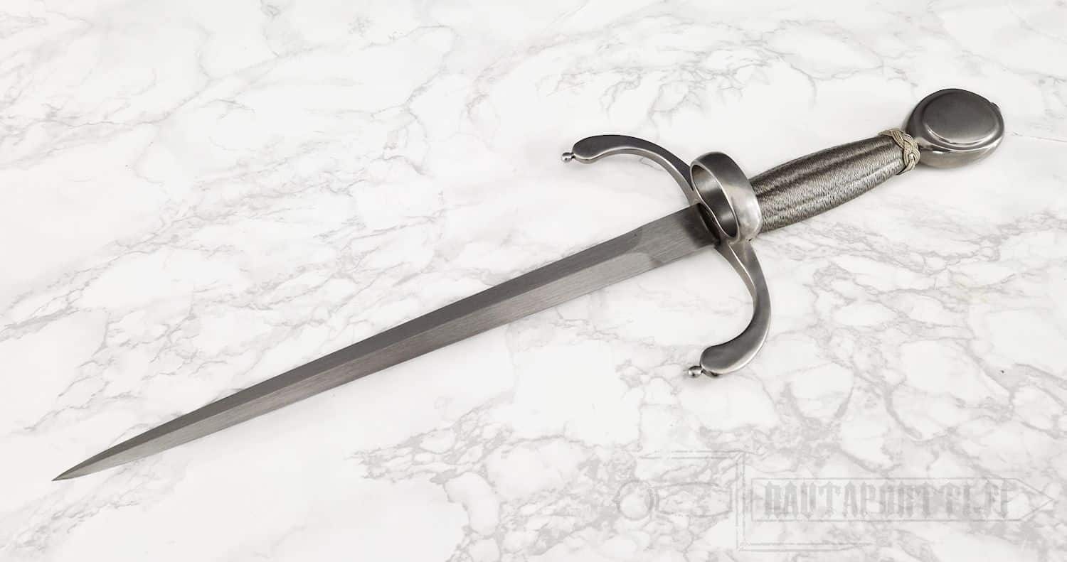 The dagger's blade is constructed of forged high carbon steel and it comes with a leather scabbard. The hilt is made from stainless steel for ease of maintenance. The guard has a beautiful design with upturned quillons to protect the hand and to wrap the fingers around in order to increase one's grip strength.