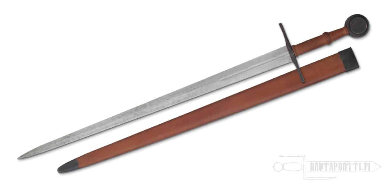 Our Hand-and-a-Half Sword crafted by Paul Chen is replicated from a sword thought to be that of Albrecht II of Austria and represents the pinnacle of beauty and balance in medieval swords. Classically simple in design with a flattened diamond-section blade and cruciform hilt, the original dates from the early part of the 15th century. The “Lion Rampant” emblem of the Habsburg dynasty is engraved in the pommel, while the Passau “Running Wolf” guild mark and a marigold maker’s mark appear on the blade fuller. Both the grip and the scabbard are leather covered over a cord wrap.