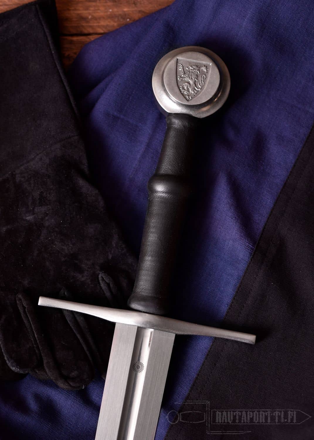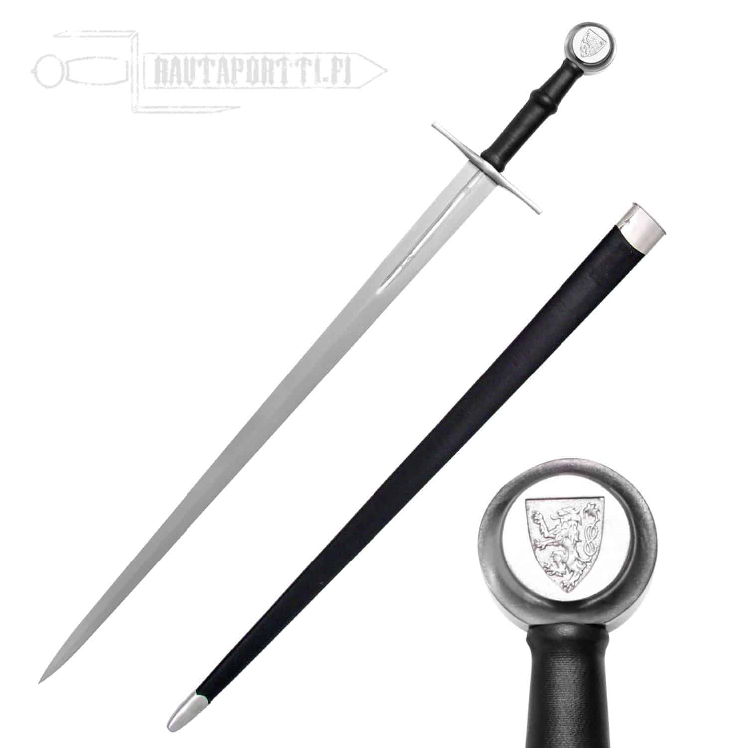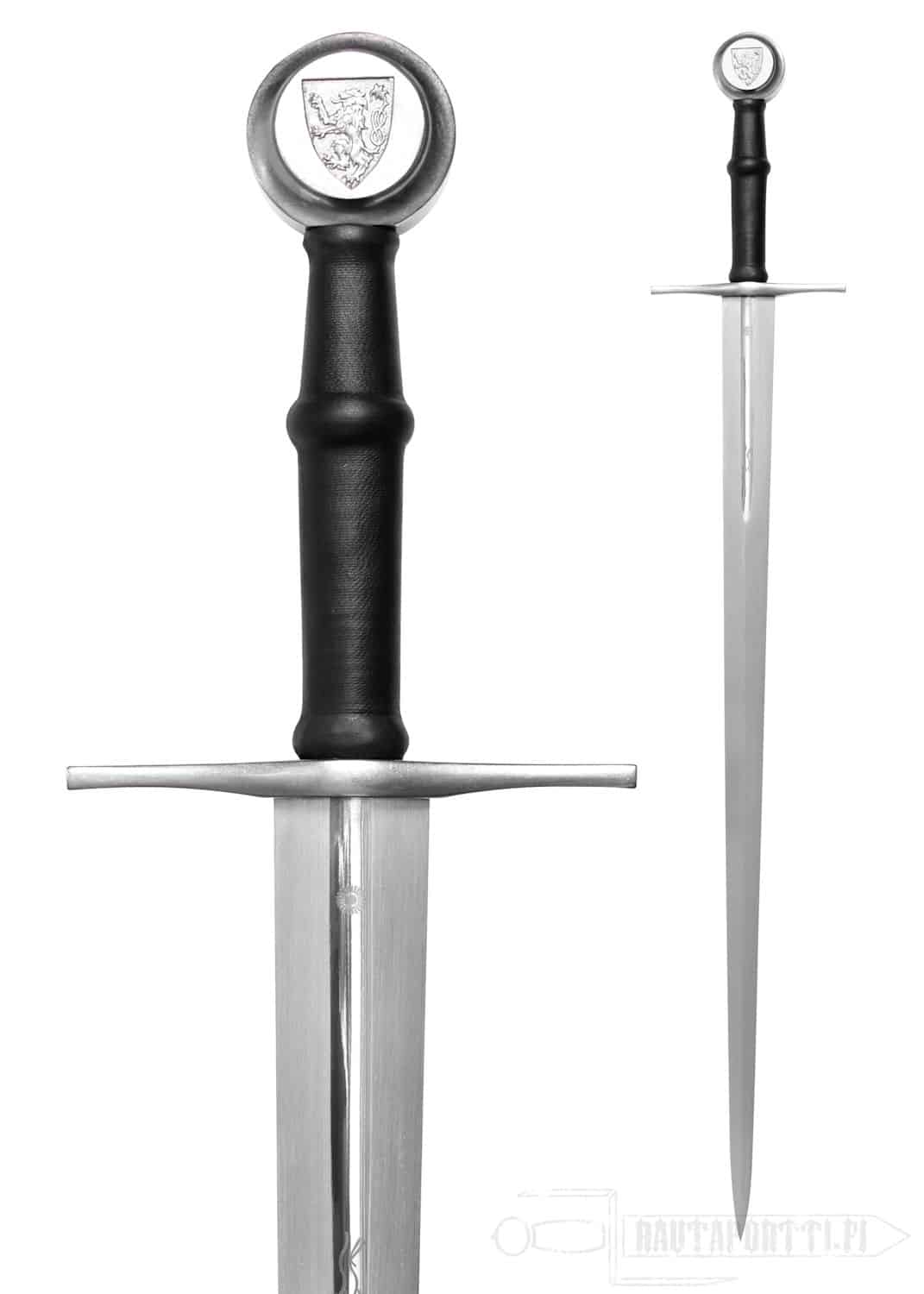 Our Hand-and-a-Half Sword crafted by Paul Chen is replicated from a sword thought to be that of Albrecht II of Austria and represents the pinnacle of beauty and balance in medieval swords. Classically simple in design with a flattened diamond-section blade and cruciform hilt, the original dates from the early part of the 15th century. The “Lion Rampant” emblem of the Habsburg dynasty is engraved in the pommel, while the Passau “Running Wolf” guild mark and a marigold maker’s mark appear on the blade fuller. Both the grip and the scabbard are leather covered over a cord wrap.