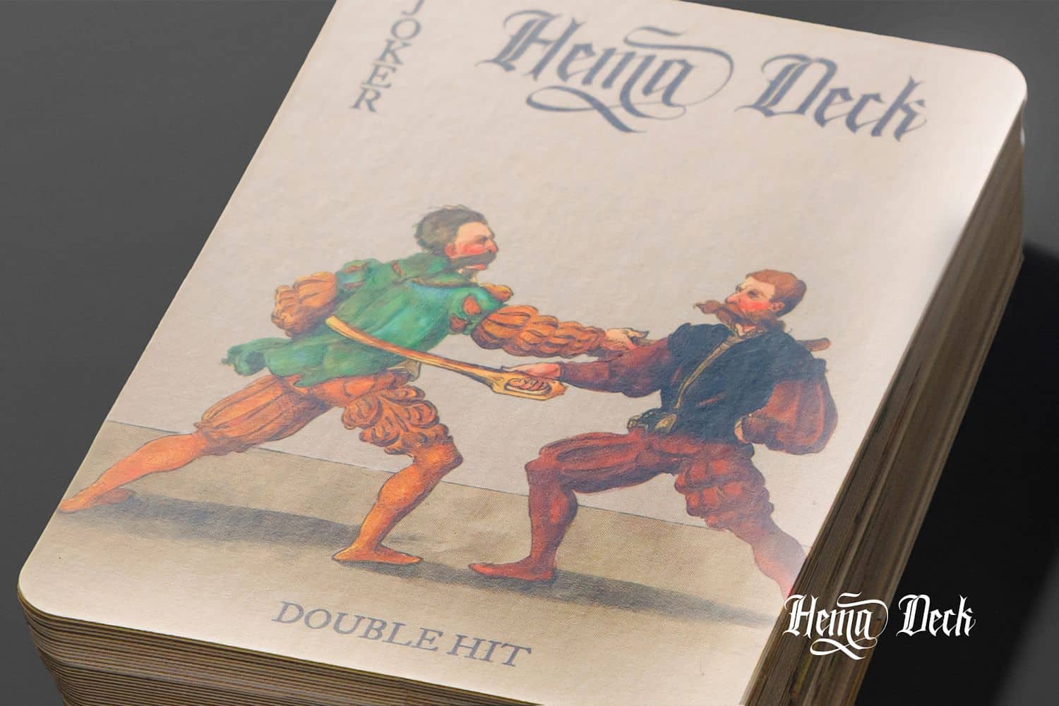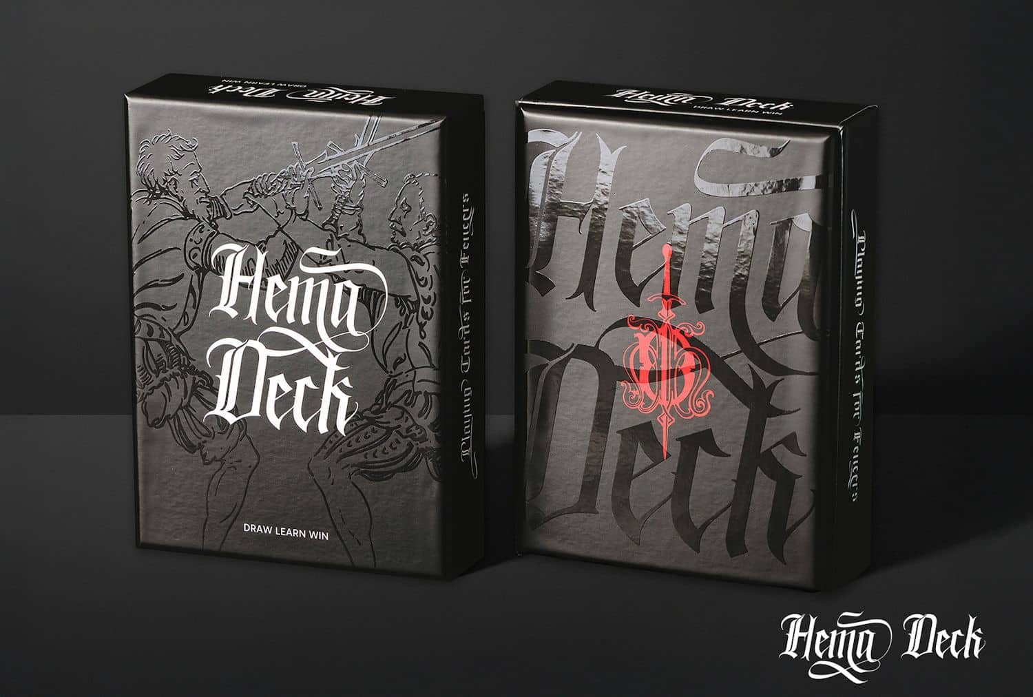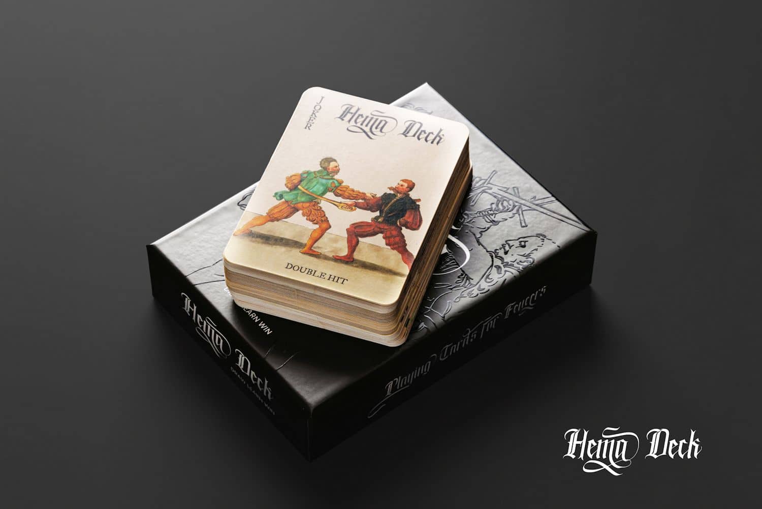 The HEMA Deck follows the French-suited poker format, measuring 63 × 88 mm, and consists of 55 cards, including 3 jokers, packaged in a dedicated tuck box. The set includes a 48-page booklet measuring 88 × 115 mm, featuring detailed descriptions of the fencing positions illustrated on the cards. Everything is housed in a premium two-piece box (95 × 130 mm) with spot-UV varnish, giving the product a refined and collectible presentation.