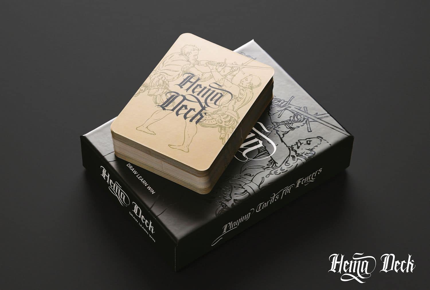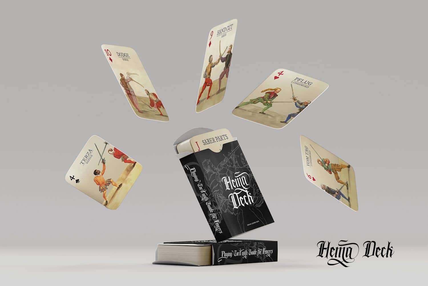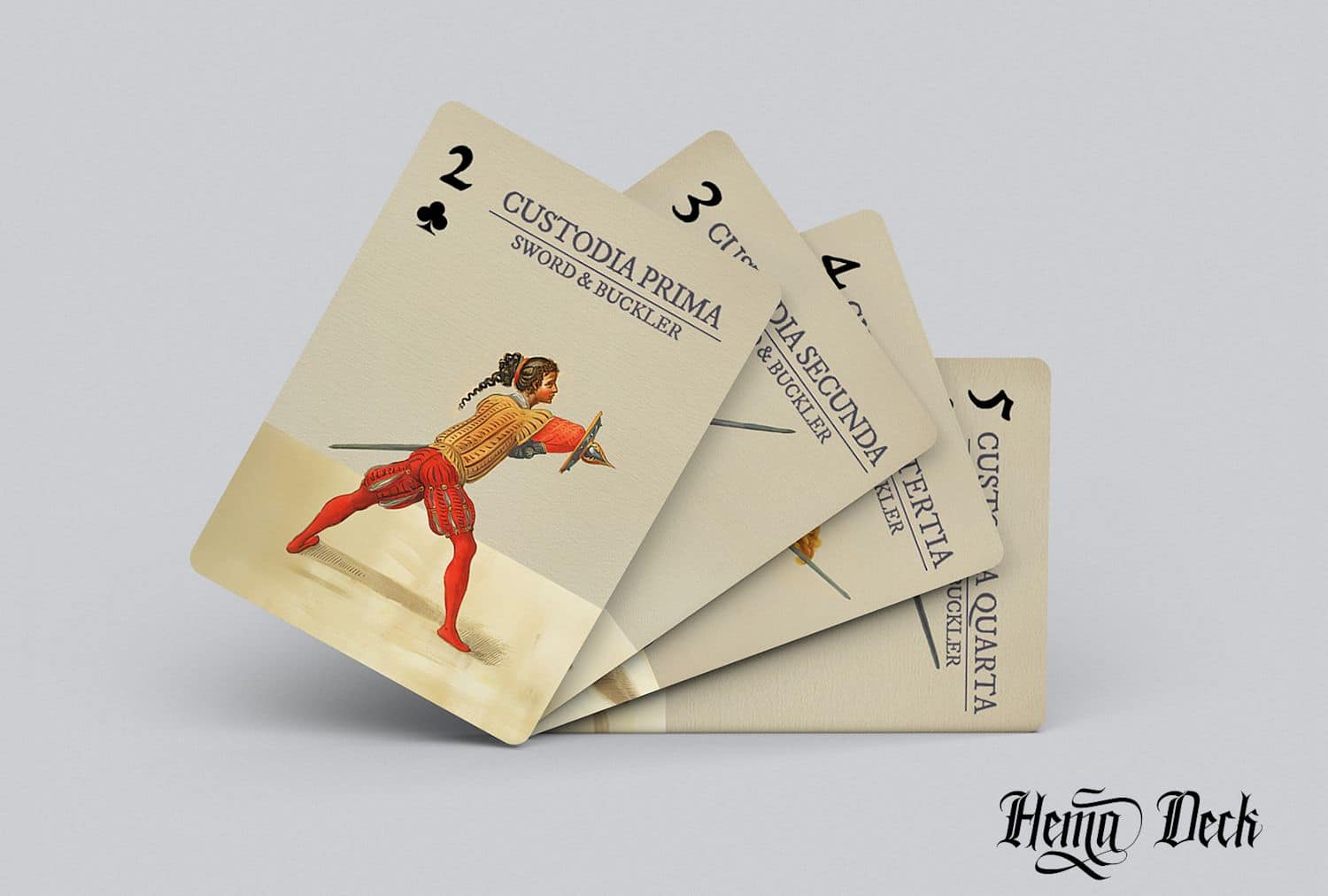 The HEMA Deck follows the French-suited poker format, measuring 63 × 88 mm, and consists of 55 cards, including 3 jokers, packaged in a dedicated tuck box. The set includes a 48-page booklet measuring 88 × 115 mm, featuring detailed descriptions of the fencing positions illustrated on the cards. Everything is housed in a premium two-piece box (95 × 130 mm) with spot-UV varnish, giving the product a refined and collectible presentation.
