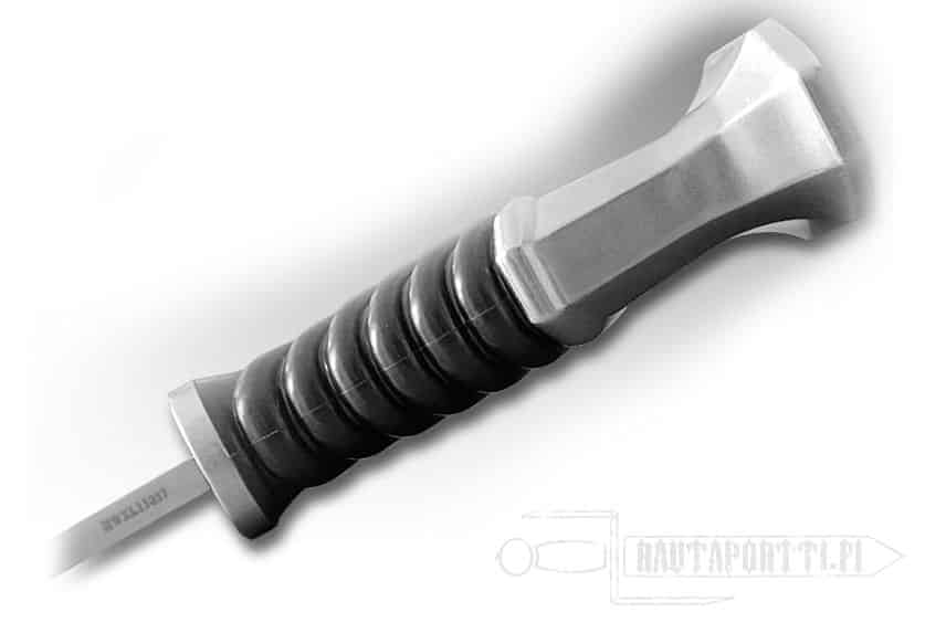 The grip is the biggest change from tradition, and the most welcome. The pommel and guard are stainless steel while the grip is injection molded into a grippy but comfortable pattern. After precise fitting of the guard, grip and pommel the substantial thru-tang is peened and welded in place, resulting in a knife that feels as if it was formed of a solid piece of steel.