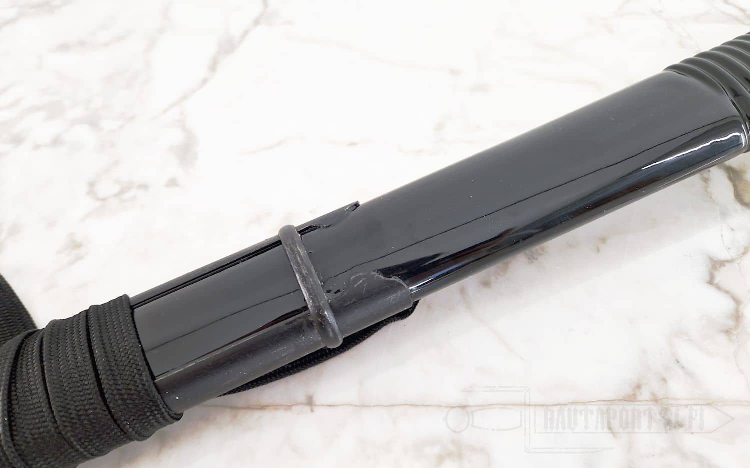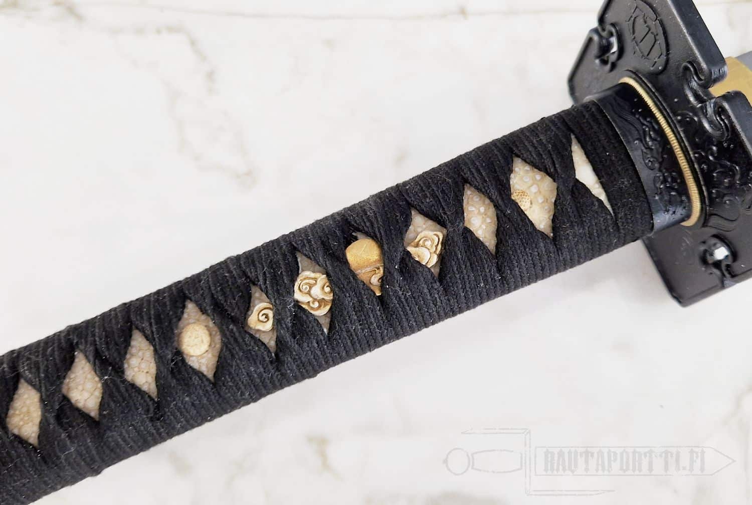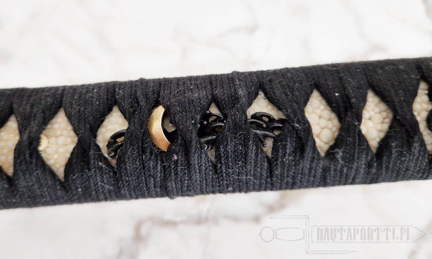 - Traditional wrap and natural white rayskin on handle