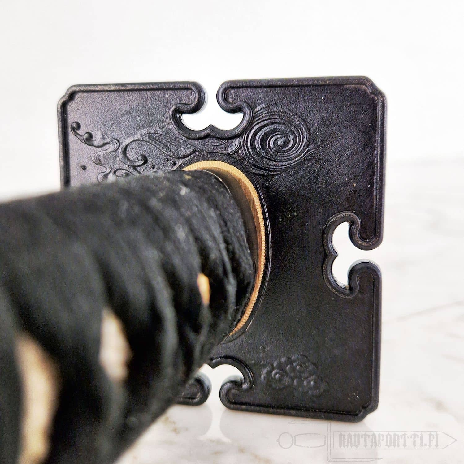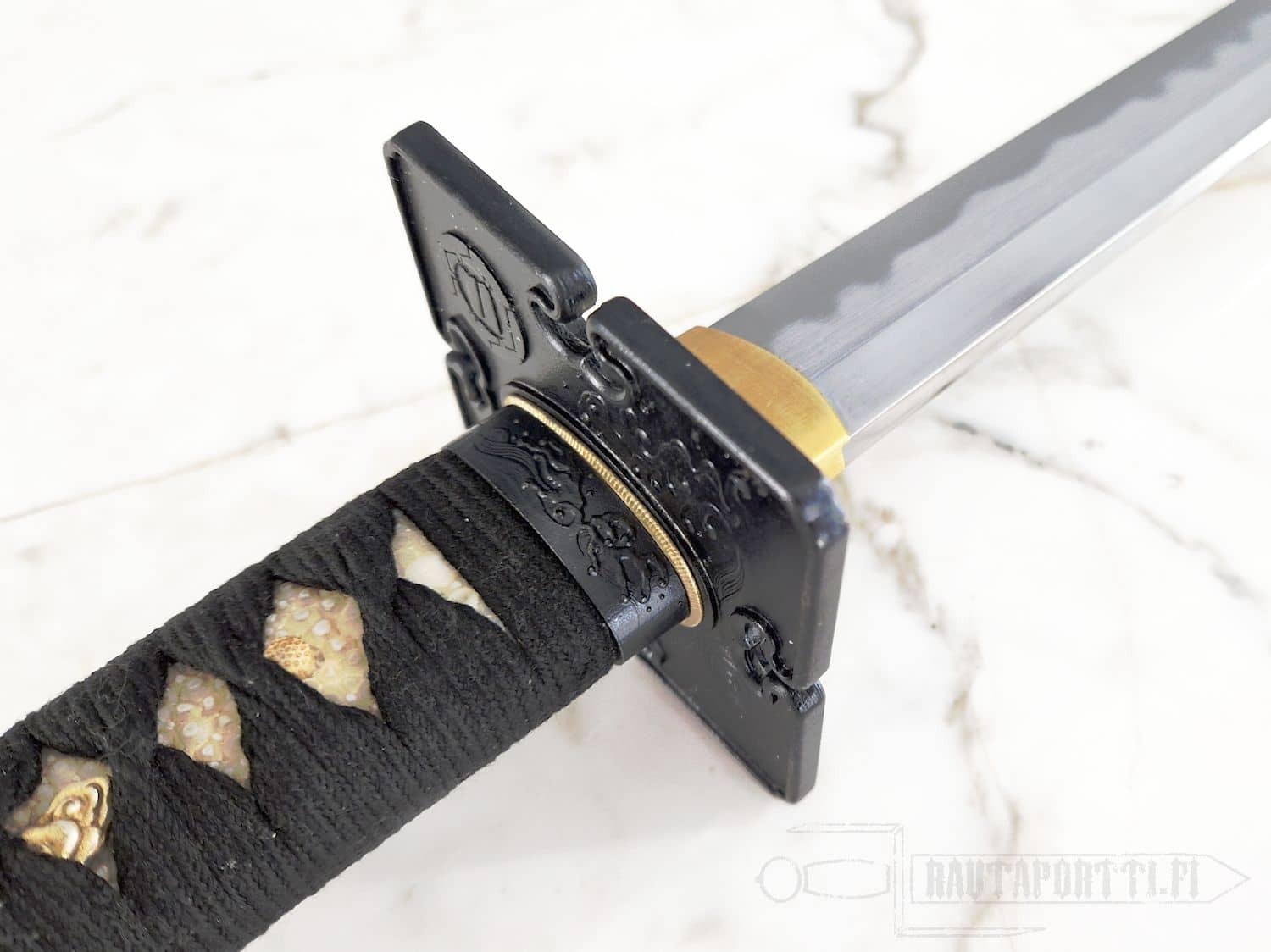The dismountable double-pegged Tsuka of the Iga Ninja-To features a traditional wrap over natural rayskin and the menuki. The menuki present Sun and bright clouds on the other side and Moon and dark water on the other side. The blackened iron fittings include a Tsuba displaying the Iga Mon (emblem of the Iga clan) and a wave motif, both repeated on the Fuchi/Kashira. The Saya features a partial rattan wrap and a heavily reinforced spike. The Iga features a forged high carbon blade, differentially quenched to an edge hardness of 60 HRc. Essential tool for the Ninjutsu practitioner.
