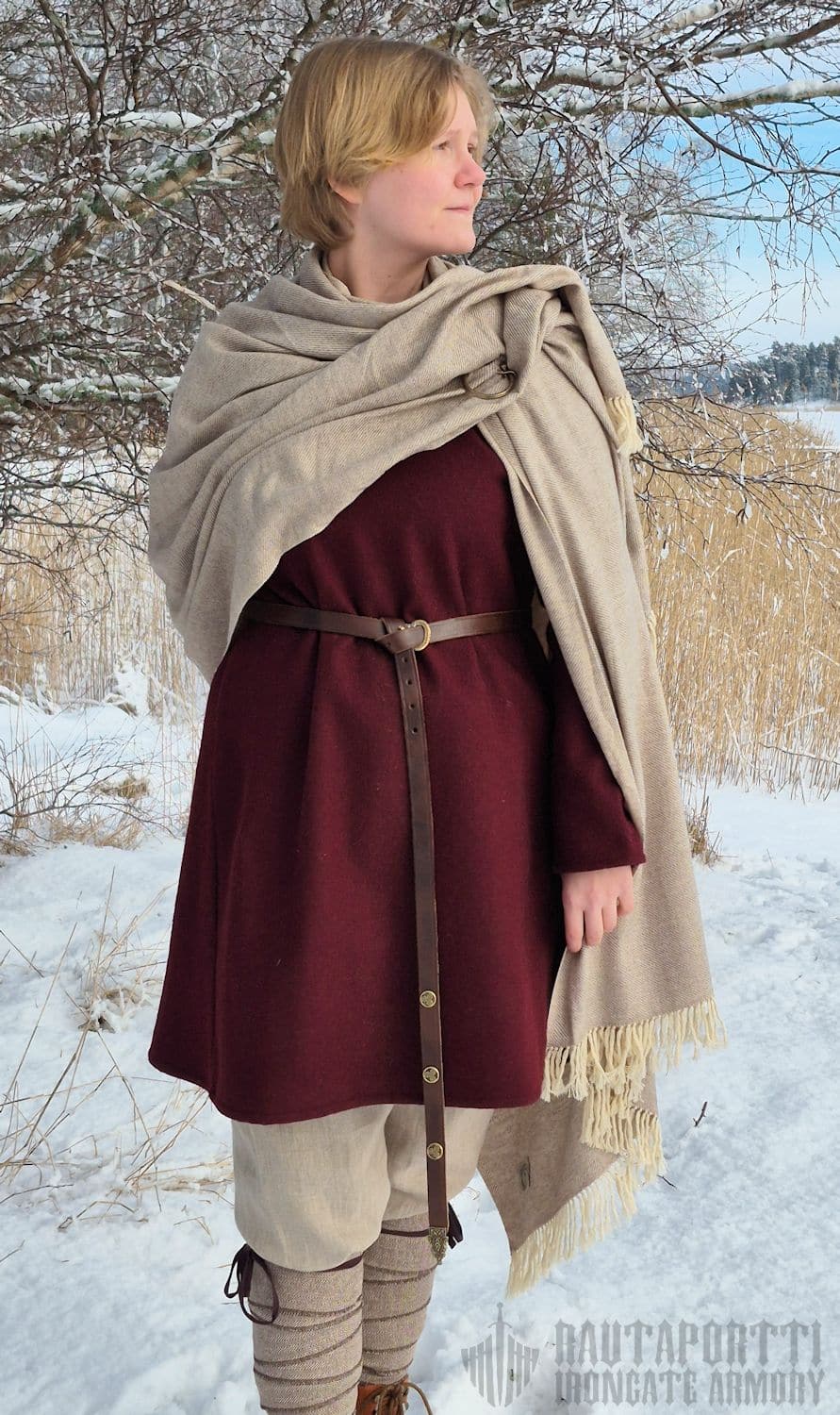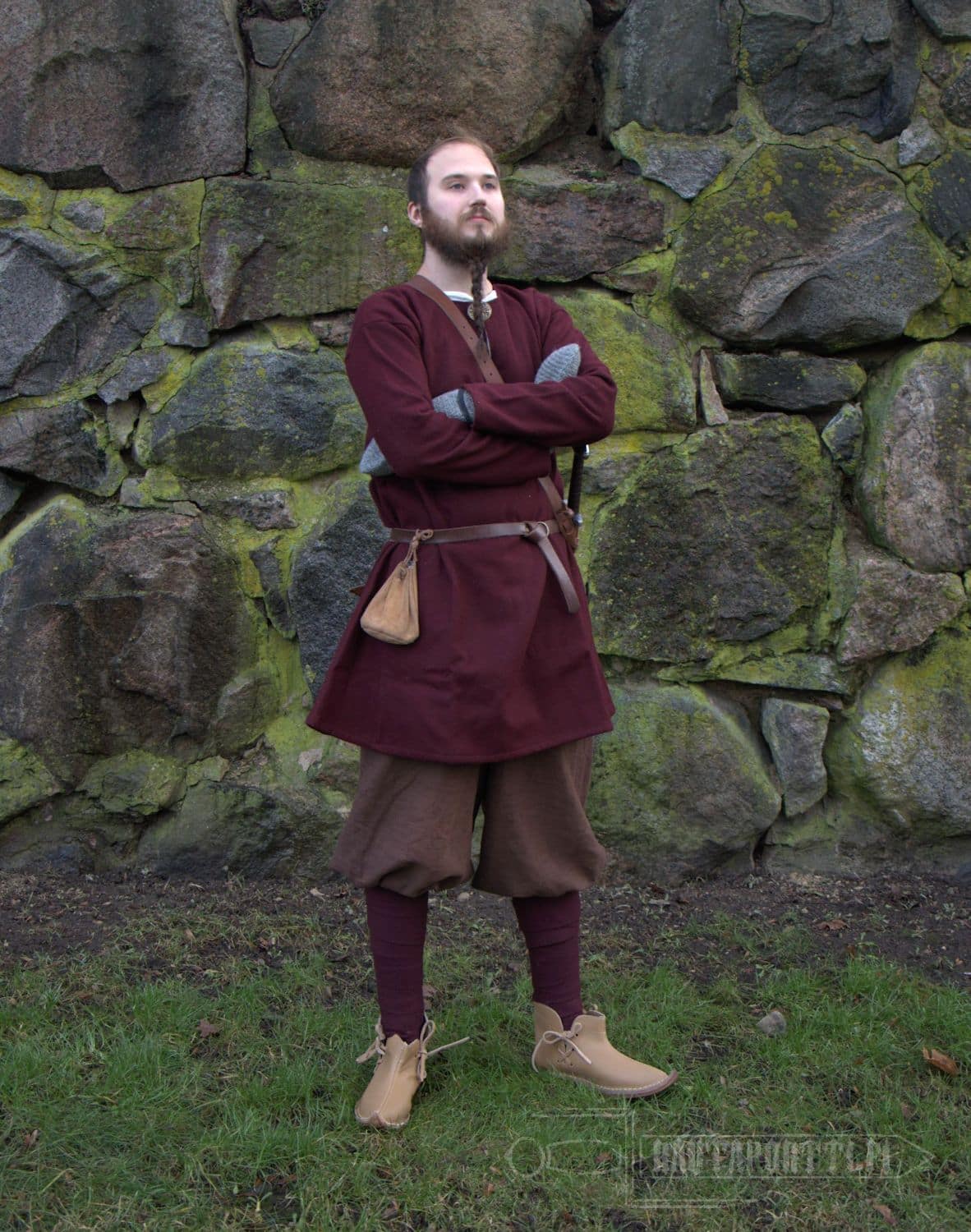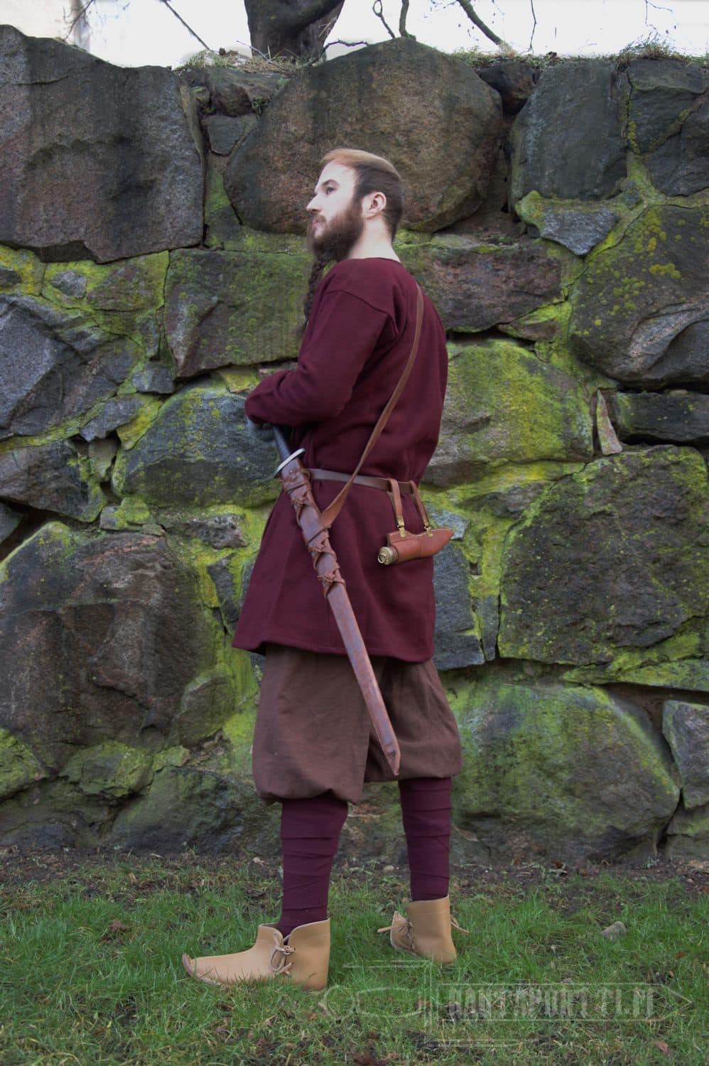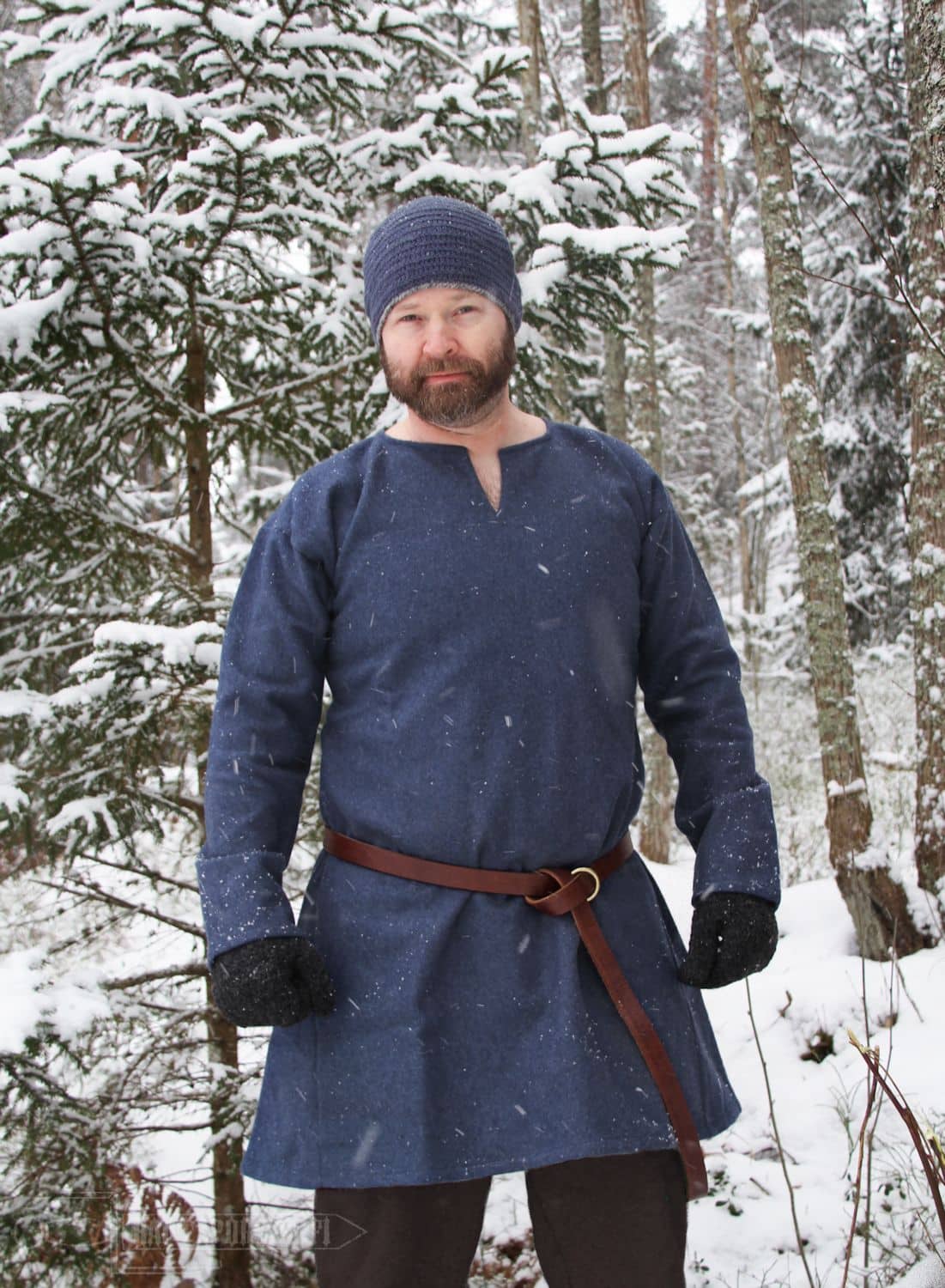 In northern Europe the changes were slow, and although the tunic model is from the iron age, it would not have looked out of place on an early modern farm either. The tunic has been left simple and unadorned so it can be used by anyone irrespective of their social status, be they a wealthy merchant or a warrior, and naturally it will work well for everyday tasks at the home farm. The wool tunic will keep the adventurer warm when crossing the North Sea or the Baltic. The natural quality of felted sheep wool means that the tunic is naturally somewhat waterproof, so it will not get soaked if you encounter light drizzle on your journeys, making it ideal for adventures in the autumn and winter time.