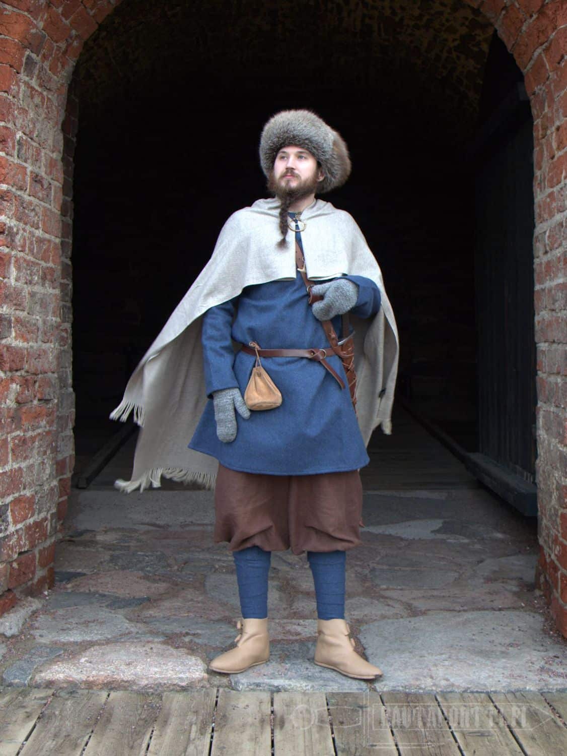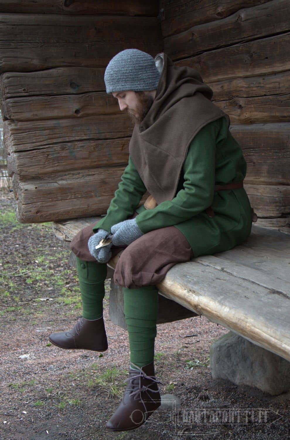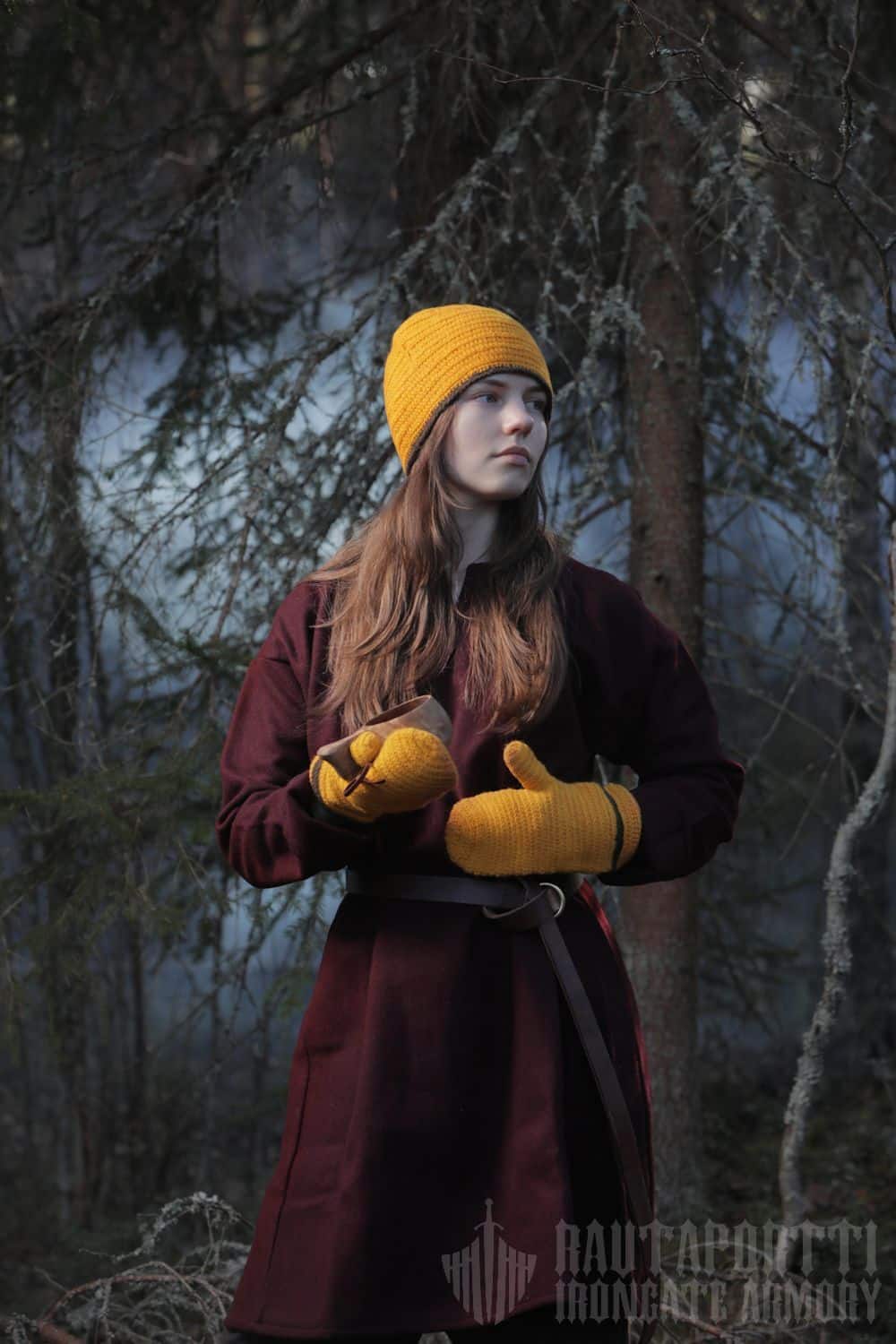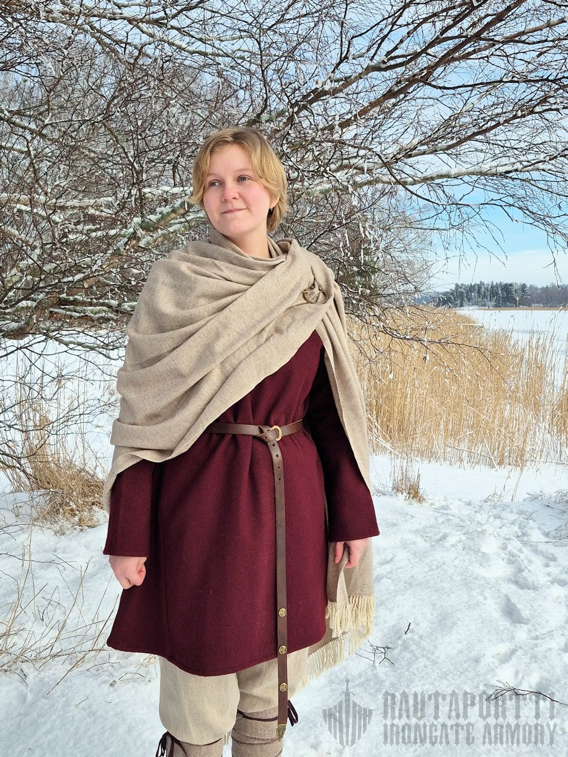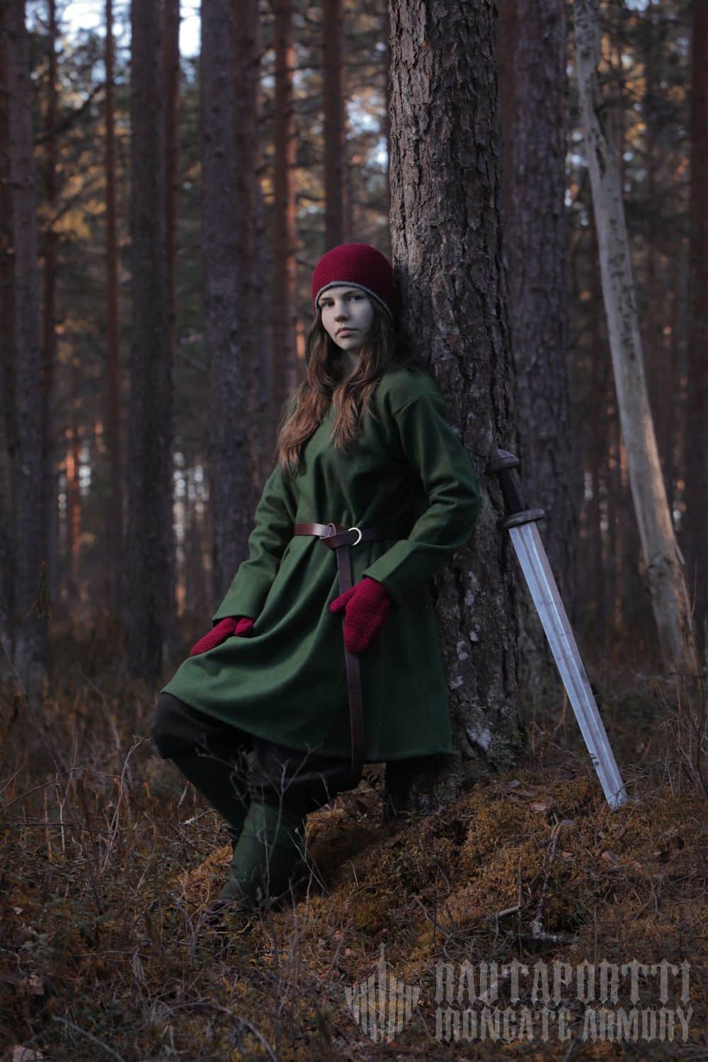 In northern Europe the changes were slow, and although the tunic model is from the iron age, it would not have looked out of place on an early modern farm either. The tunic has been left simple and unadorned so it can be used by anyone irrespective of their social status, be they a wealthy merchant or a warrior, and naturally it will work well for everyday tasks at the home farm. The wool tunic will keep the adventurer warm when crossing the North Sea or the Baltic. The natural quality of felted sheep wool means that the tunic is naturally somewhat waterproof, so it will not get soaked if you encounter light drizzle on your journeys, making it ideal for adventures in the autumn and winter time.