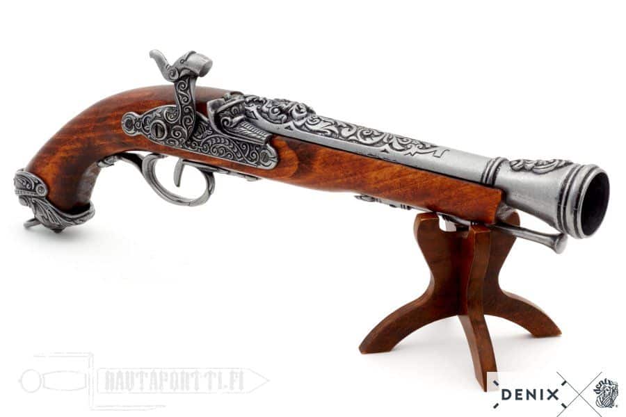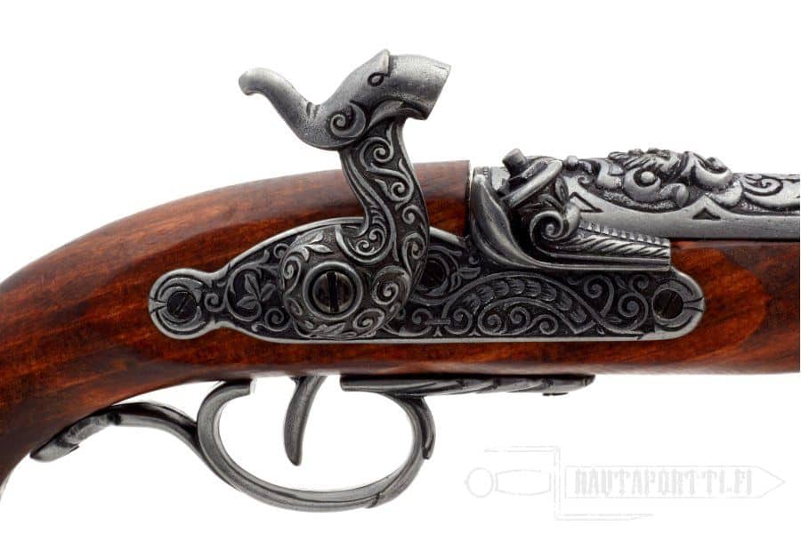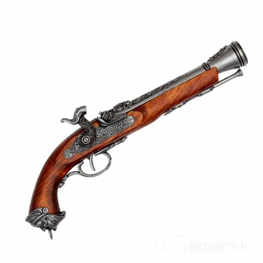 A pistol sized blunderbuss was called a βdragon.β Early short-barreled guns used by cavalry were commonly decorated with a dragon to give an illusion of a fire-breathing dragon.Β For this reason, cavalry troops began to be called dragoons. A dragoon had only one free hand to use the weapon with, so the firearm had to be small in order to be used effectively. Pirates and marines also used these guns because they were effective in close combat when attacking ships, and loading a wide-mouthed weapon on a swaying and slippery deck was relatively easy. Thanks to their small size, the weapons were also easy to handle in the cramped spaces of the ship.