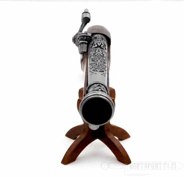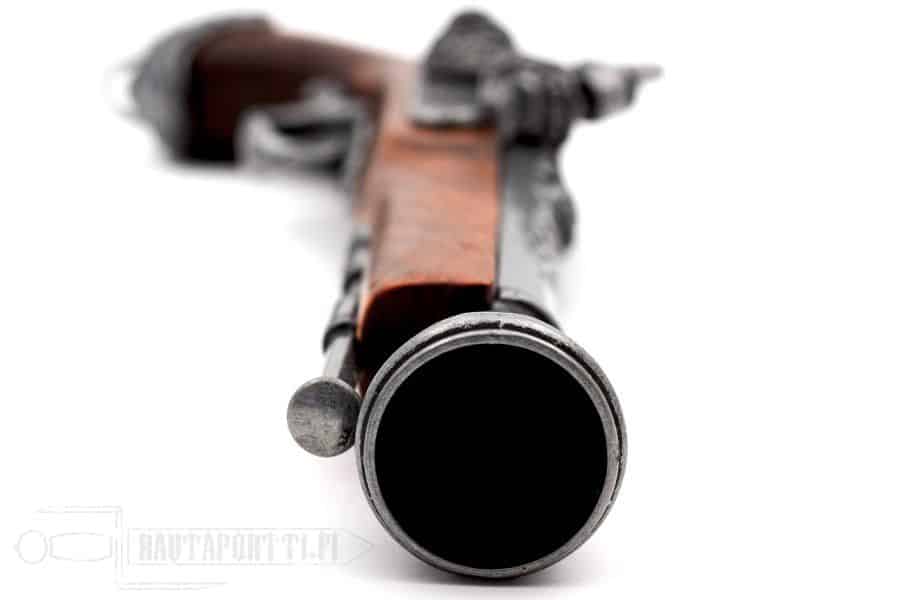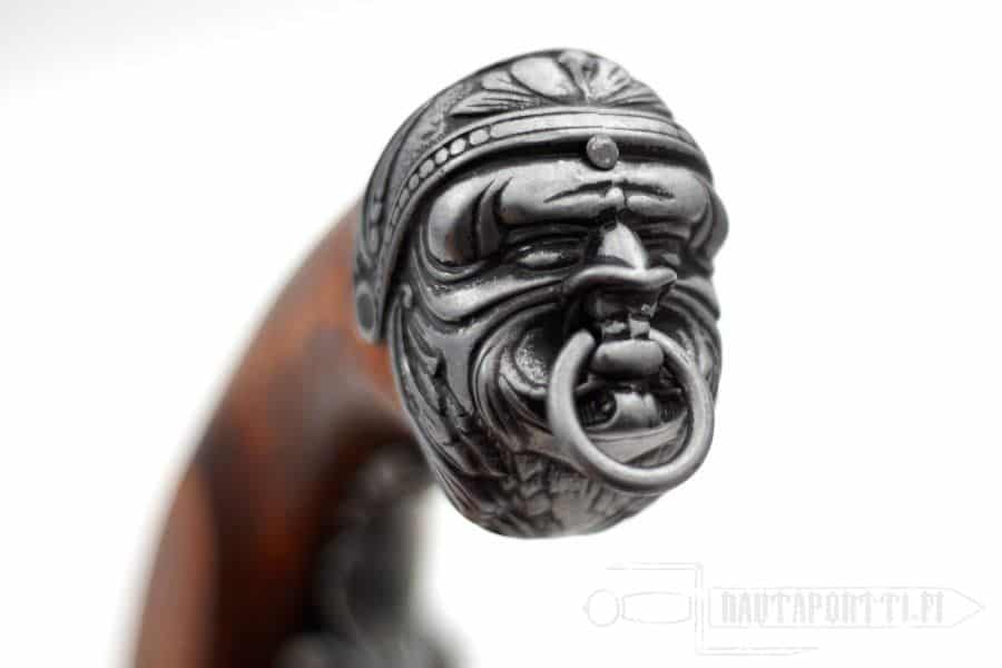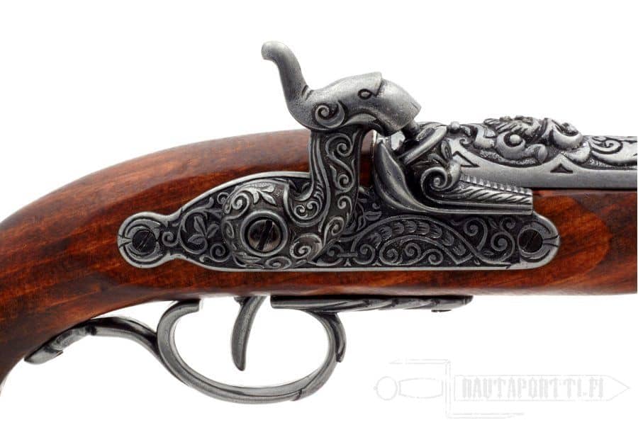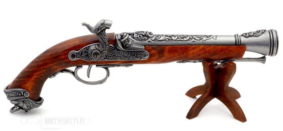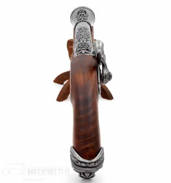 This percussion pistol has a gorgeous hardwood stock, and the butt is decorated with a metal pirate ornament. The ancient gray barrel has magnificent carvings.