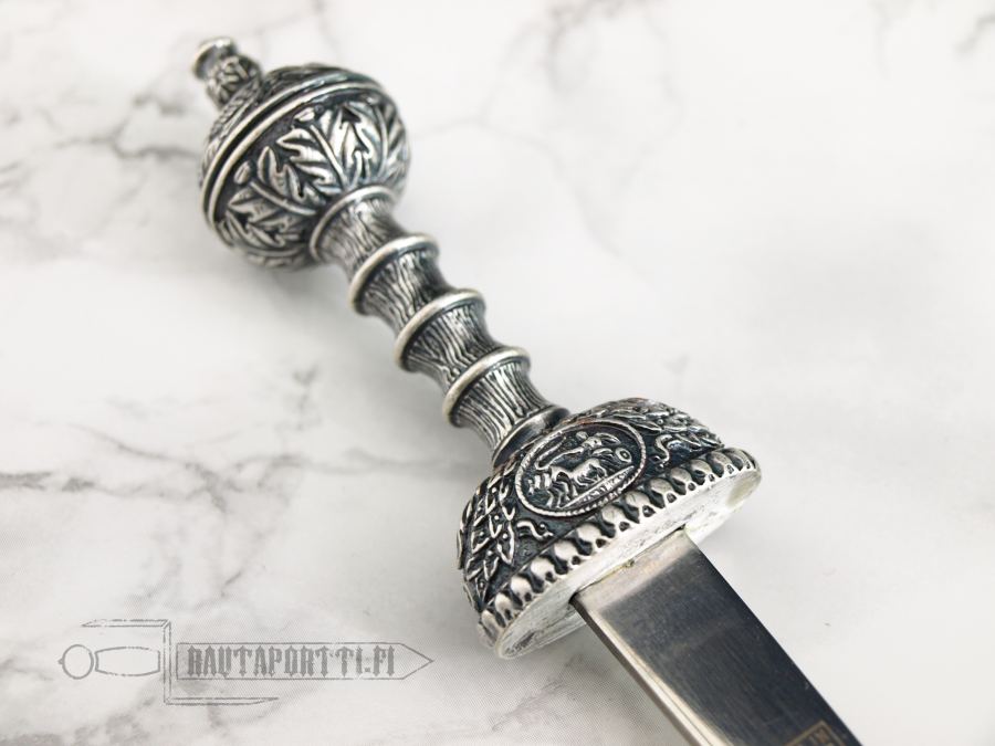 The Roman gladius had a long point that combined cutting power and stabbing ability in one handy weapon, and was used among others by Caesars legionaries during their conquests. The guard and pommel is ornamented with figures sculpted in relief.
