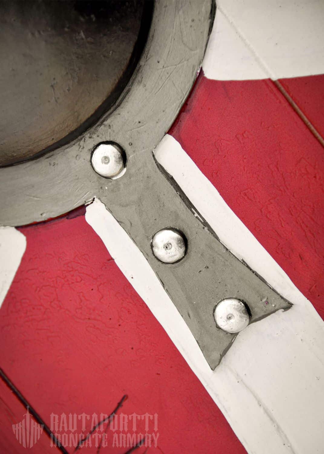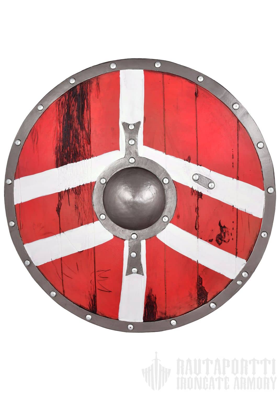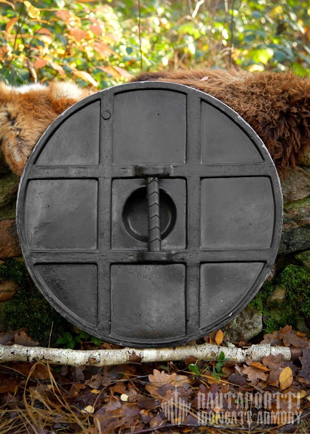 This shield has a diameter of approx 60 cm and a thickness of approx. 2 cm. Despite its sturdy appearance, it weighs only around 1.8 kg, with PU-foam reinforcements on the back providing additional stability. It is the ideal choice for combat, being light enough for quick movements. It blends seamlessly into a wide range of roles and costumes, making it an excellent prop for theatre, cosplay, or reenactment.