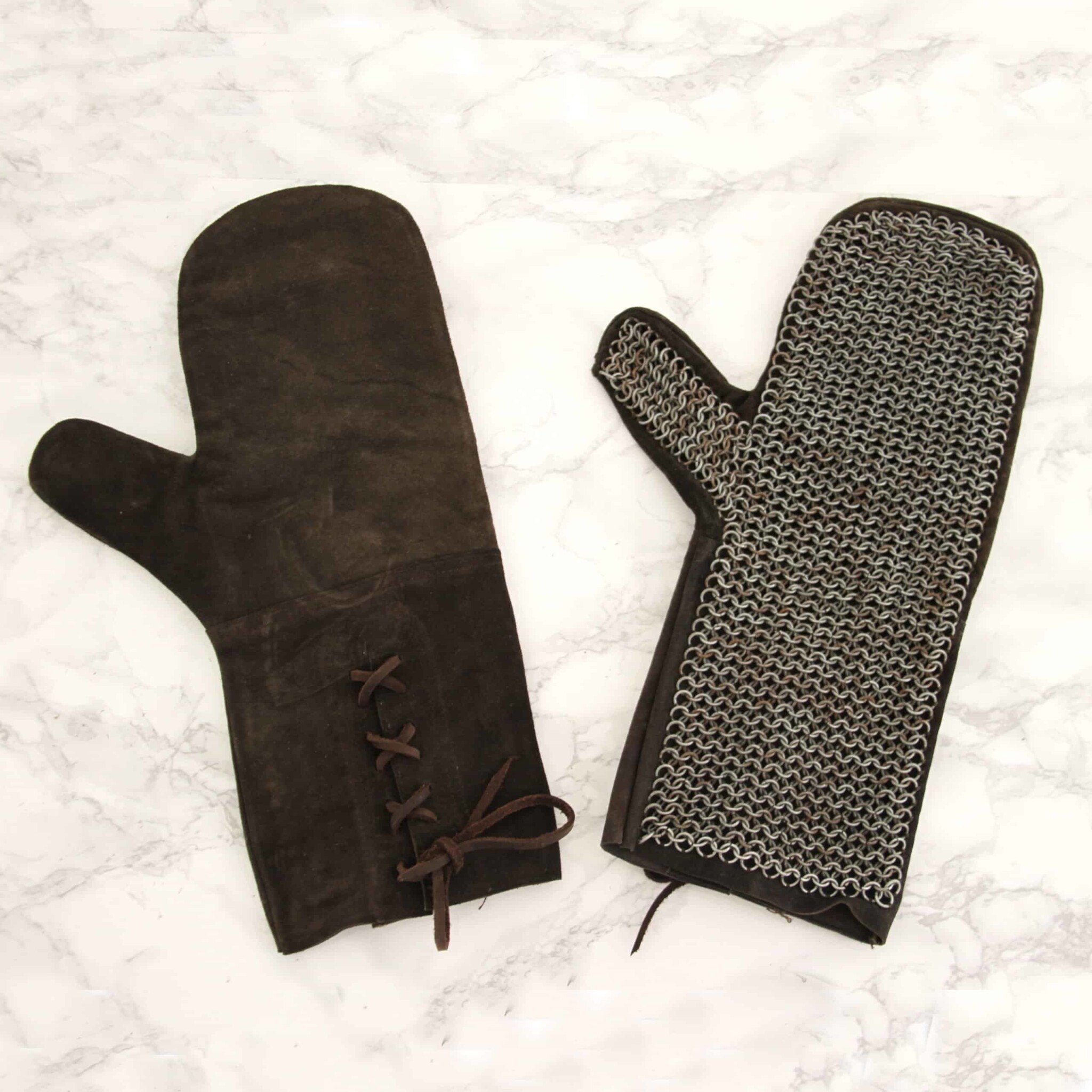 These mittens are made of durable brown suede leather and have mail and light padding on the back of the hand. The woolen padding gives little extra protection to the back of your hand and fingers with the leather and mail.