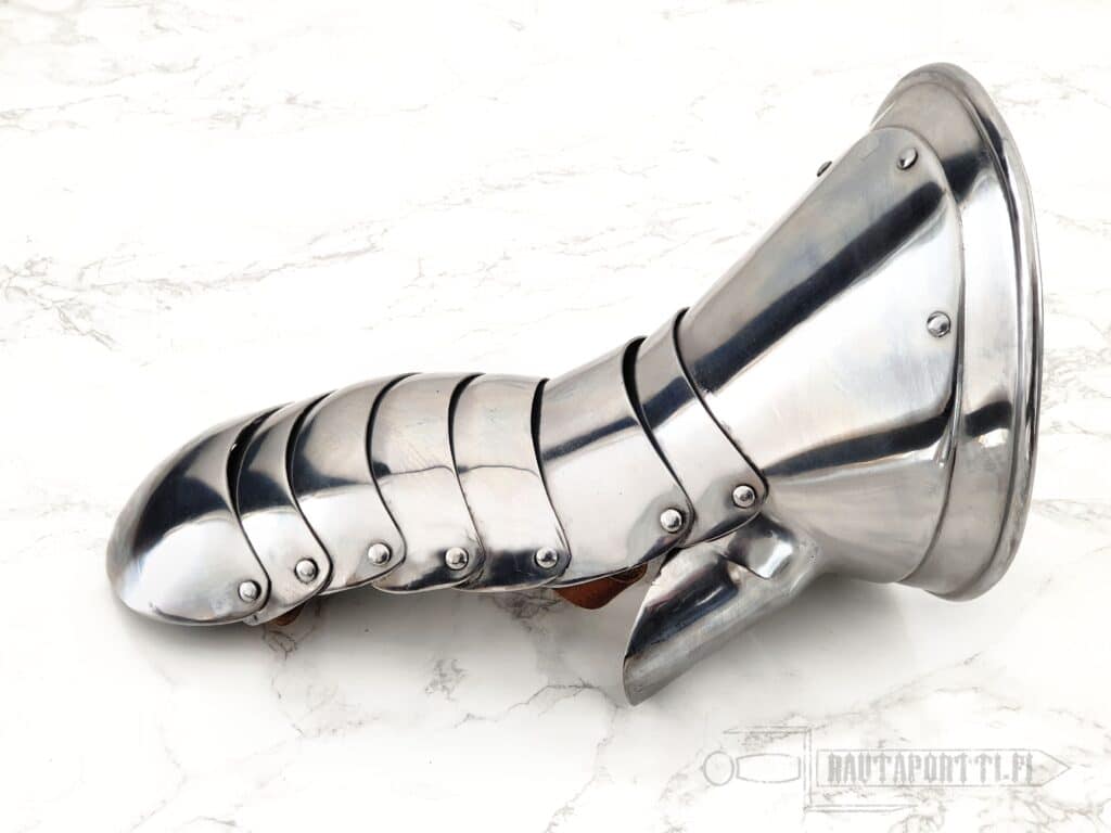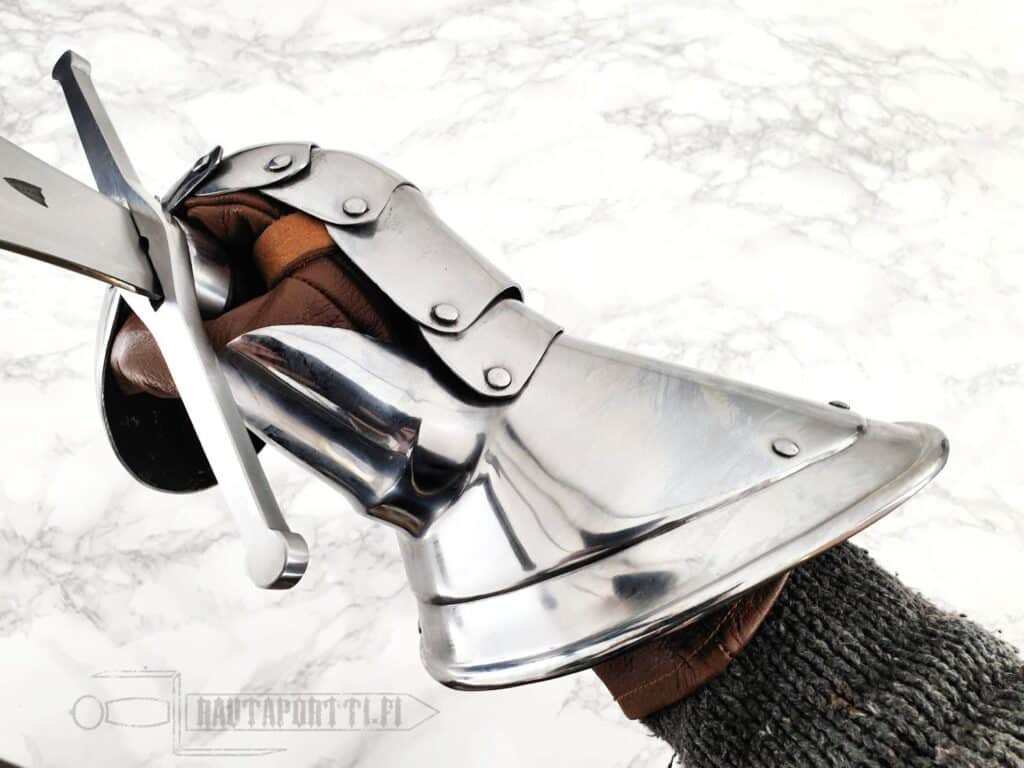 The name "Lobster Tail" refers to the distinctive shape of the glove, which resembled the segmented tail of a lobster. The gauntlet consists of articulated plates that seamlessly cover the fingers, knuckles, and back of the hand. Cuff extends over the wrist and flares out in hourglass-shape allowing good mobility to the wrist.