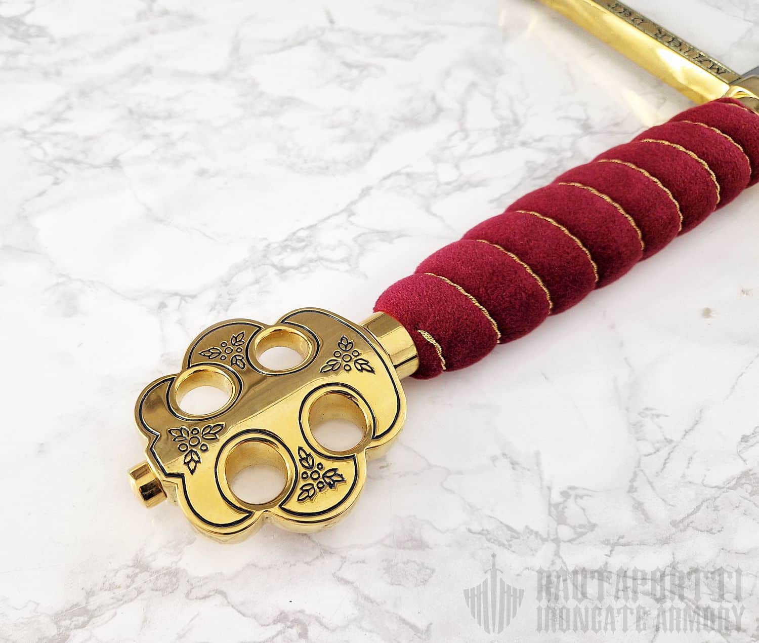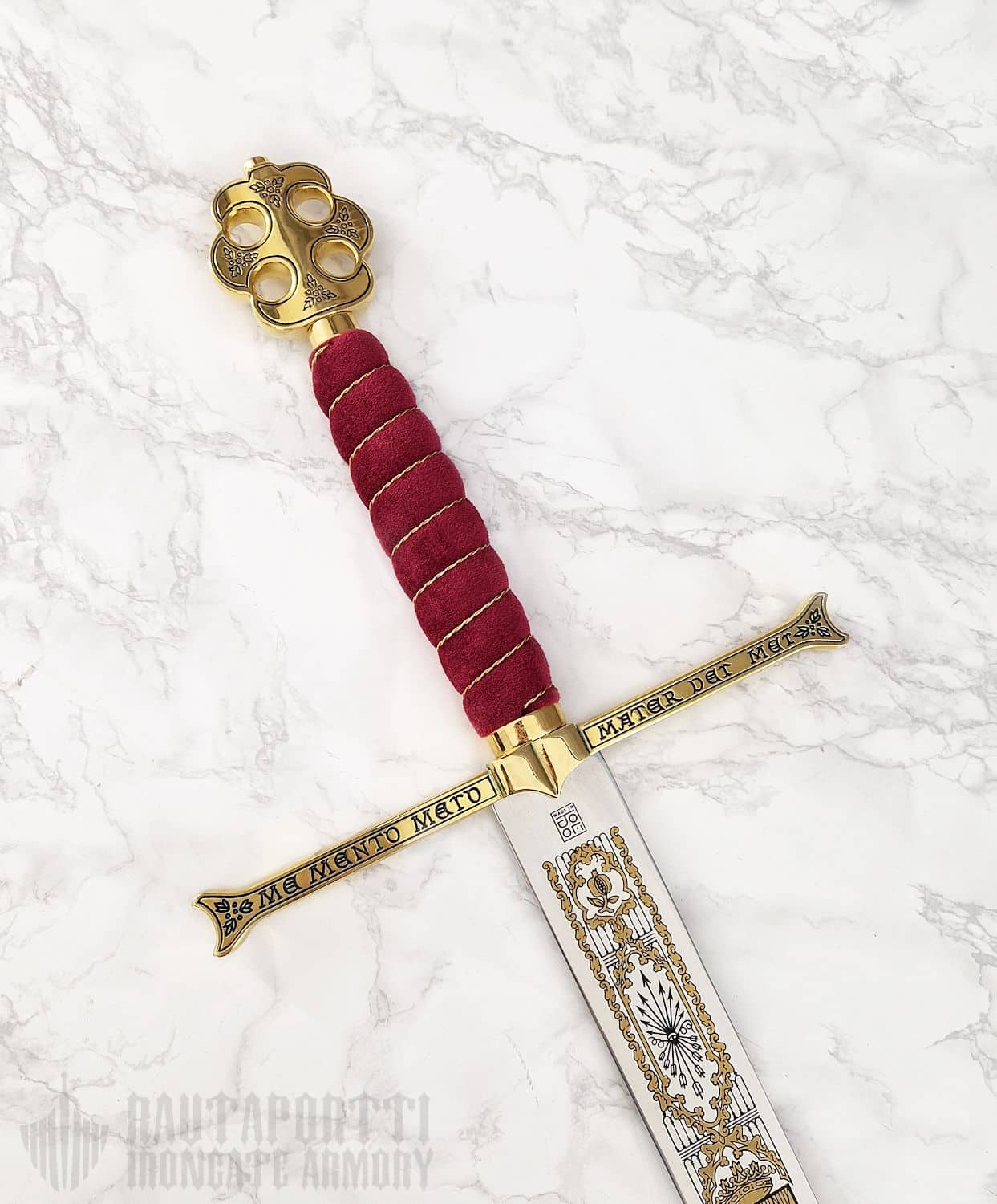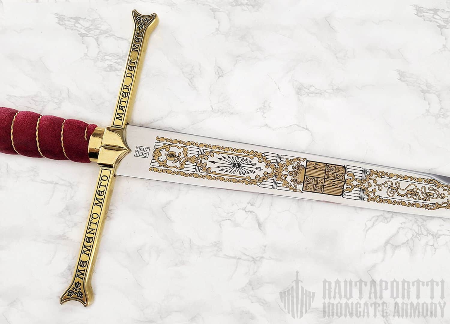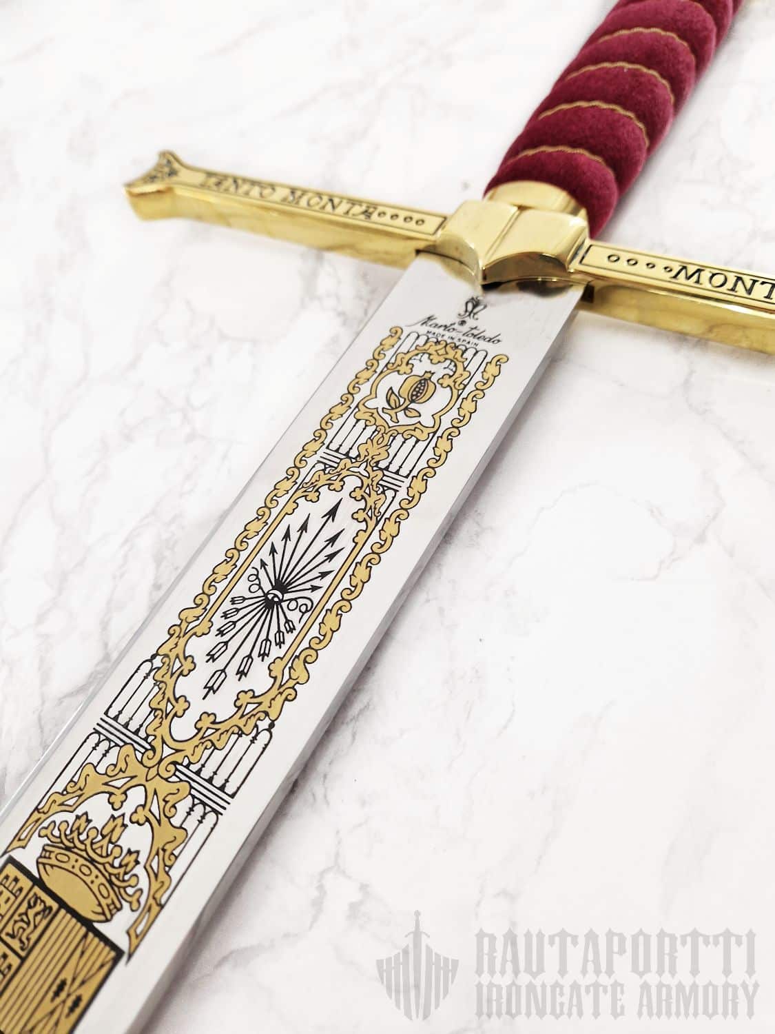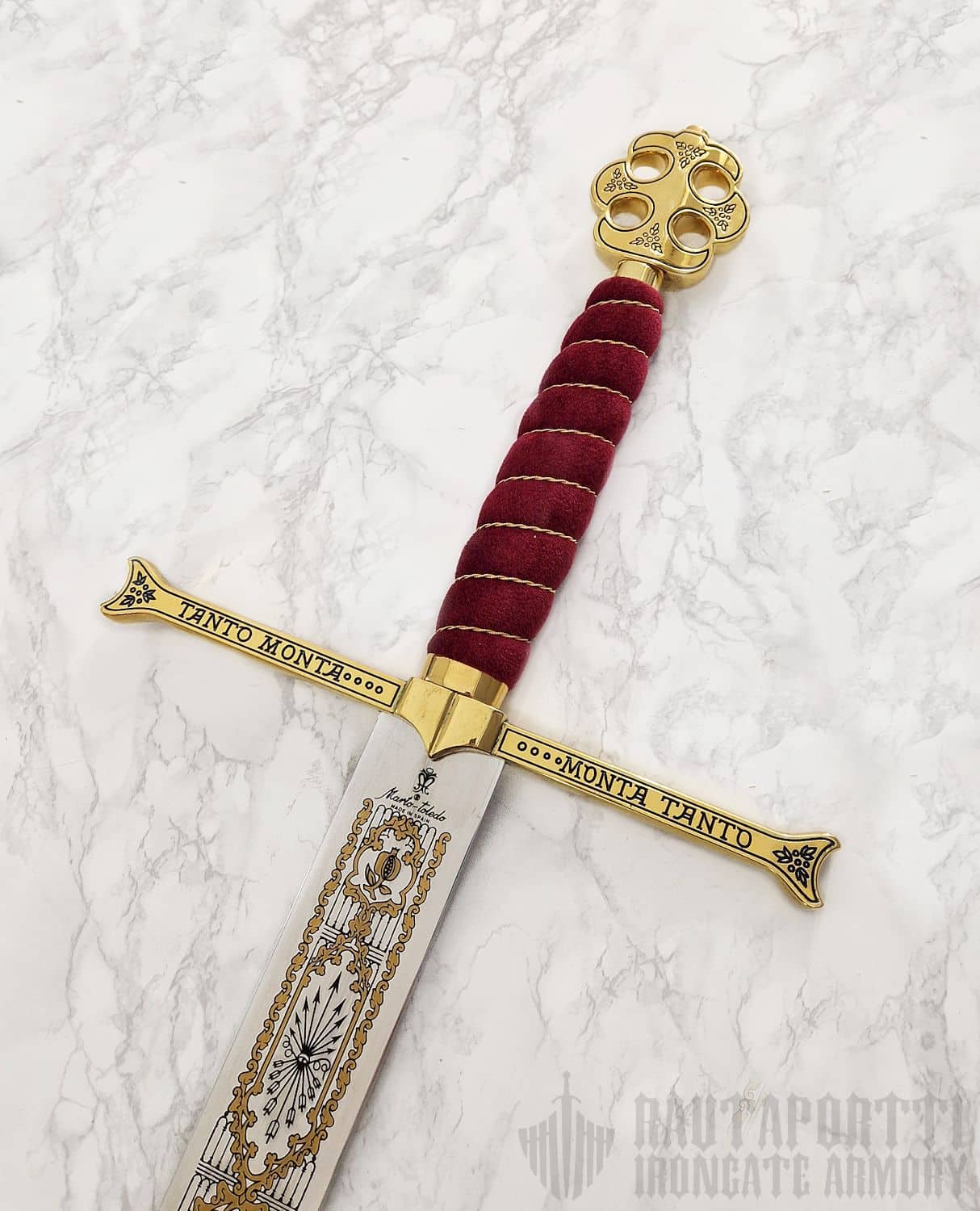 The original of this ceremonial great sword of the Catholic Monarchs is in the Royal Armory in Madrid.  With this sword, Isabella and Ferdinand knighted Christopher Columbus on his return from his first voyage to America, and it was used as the symbol of royal power in solemn court occasions up until the 18th century. The pommel has four holes that give it a cruciform appearance.  On the guard is inscribed the motto of Isabella and Ferdinand: "Tanto monta, monta tanto", "As much as the one is worth, so too is the other." This sword is quite special among swords that claim famous historical roots, in that the sword has been in continuous royal inventory since the days of the successor of the Catholic Monarchs, Charles V.