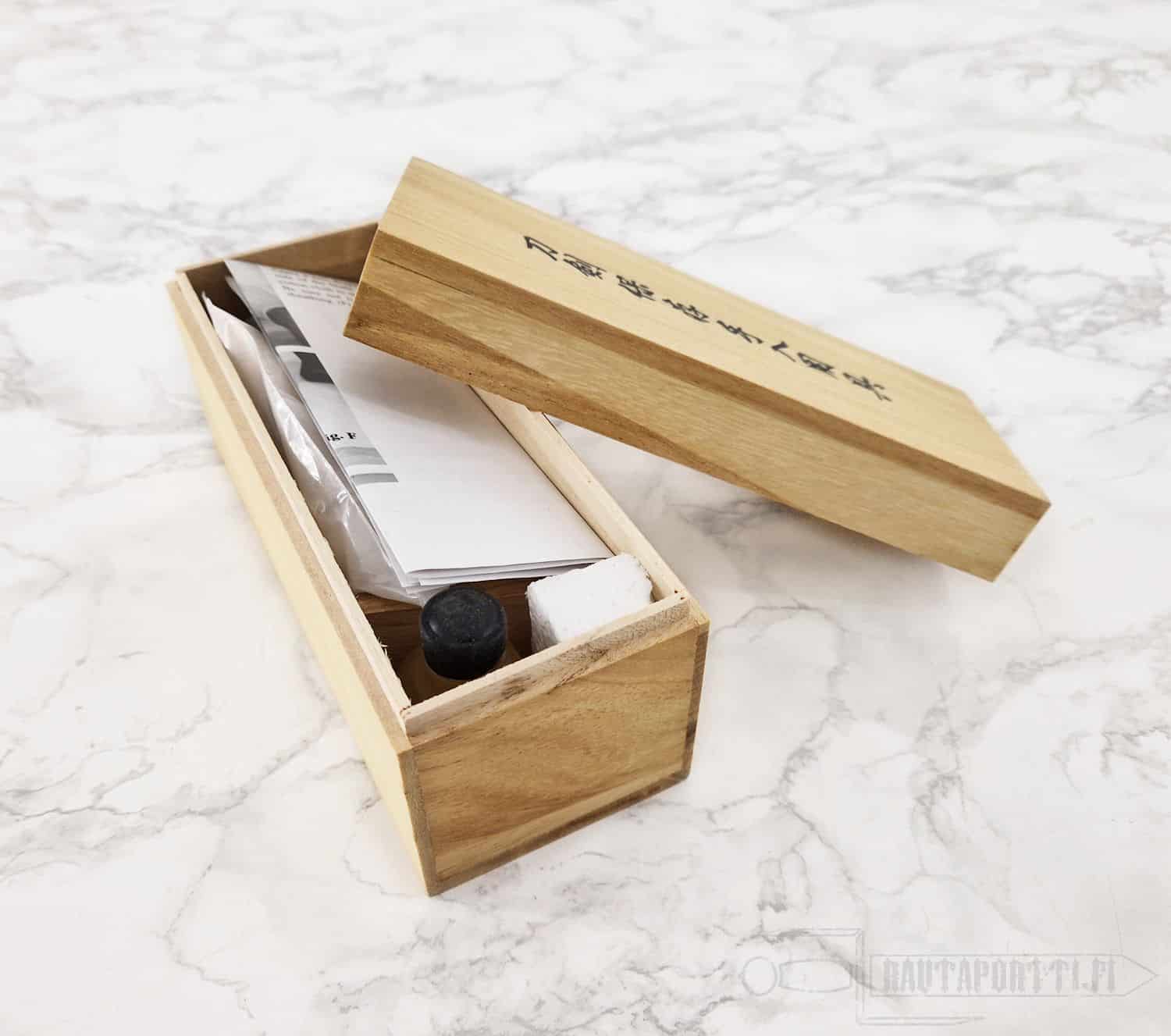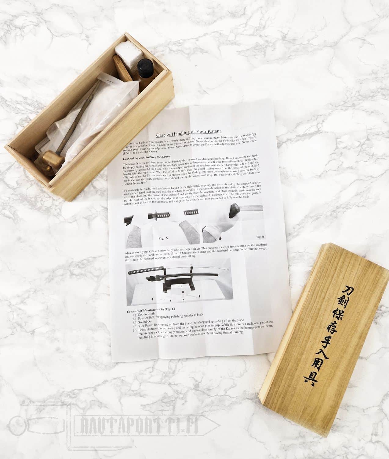 This traditional Japanese Sword maintenance kit is ideal for taking care of your katana. The kit contains blade oil (traditional choji oil that is made of mineral and clove oil), rice papers (nuguigami), an oiling cloth, a powder ball (uchiko) for blade polishing, a brass awl and hammer (mekuginuki) that is used if one wishes to disassemble the sword, and a Saya shimming veneer to retighten the scabbard to the blade if needed. The kit comes in a fitted wooden box.