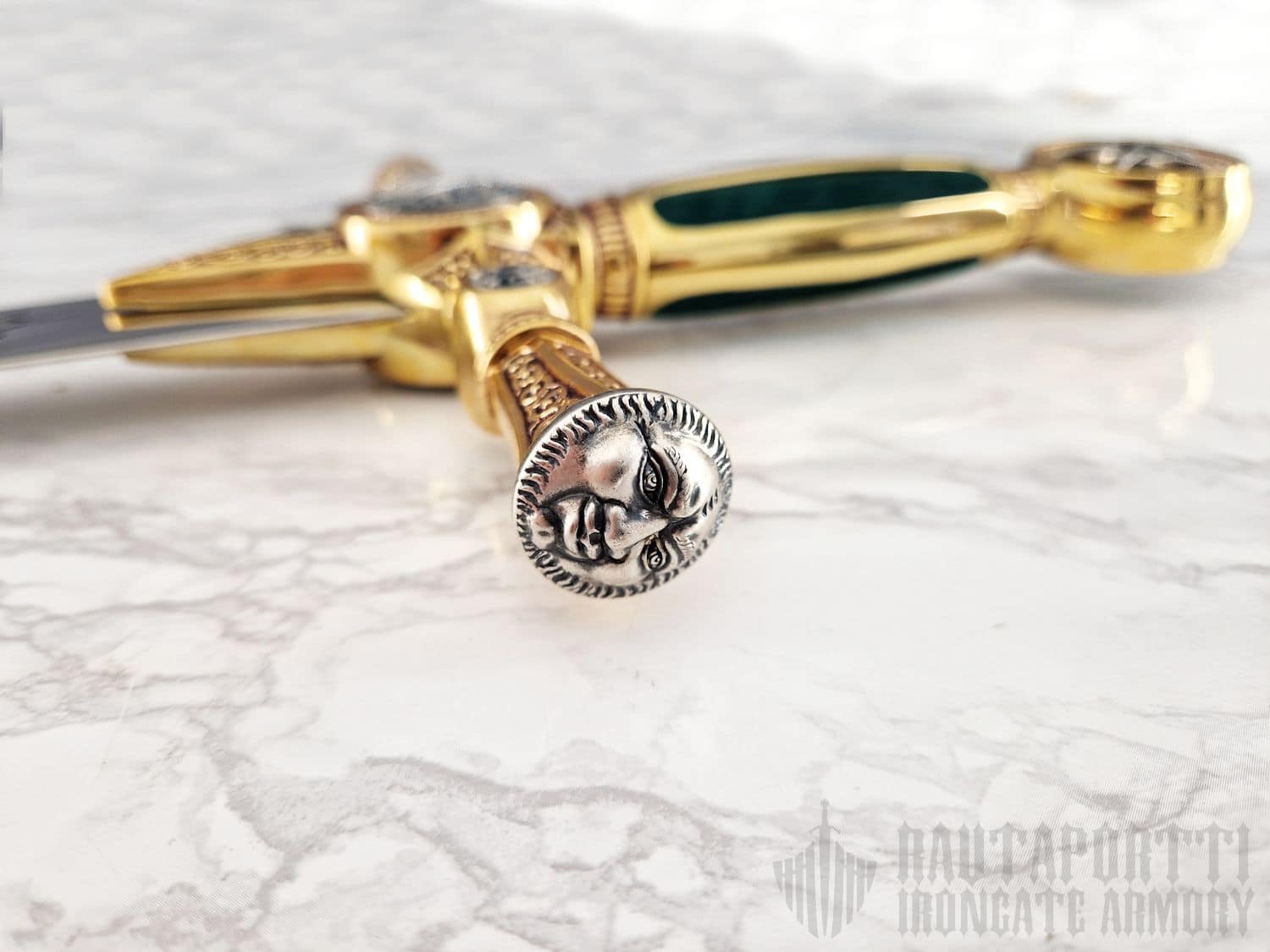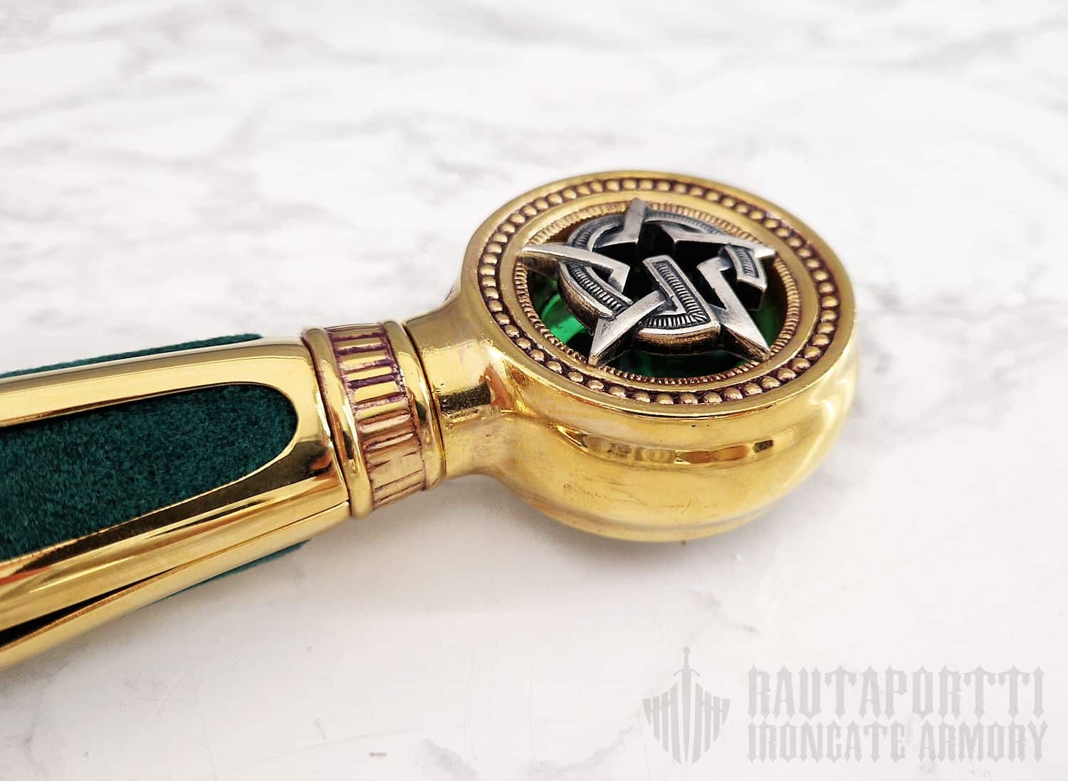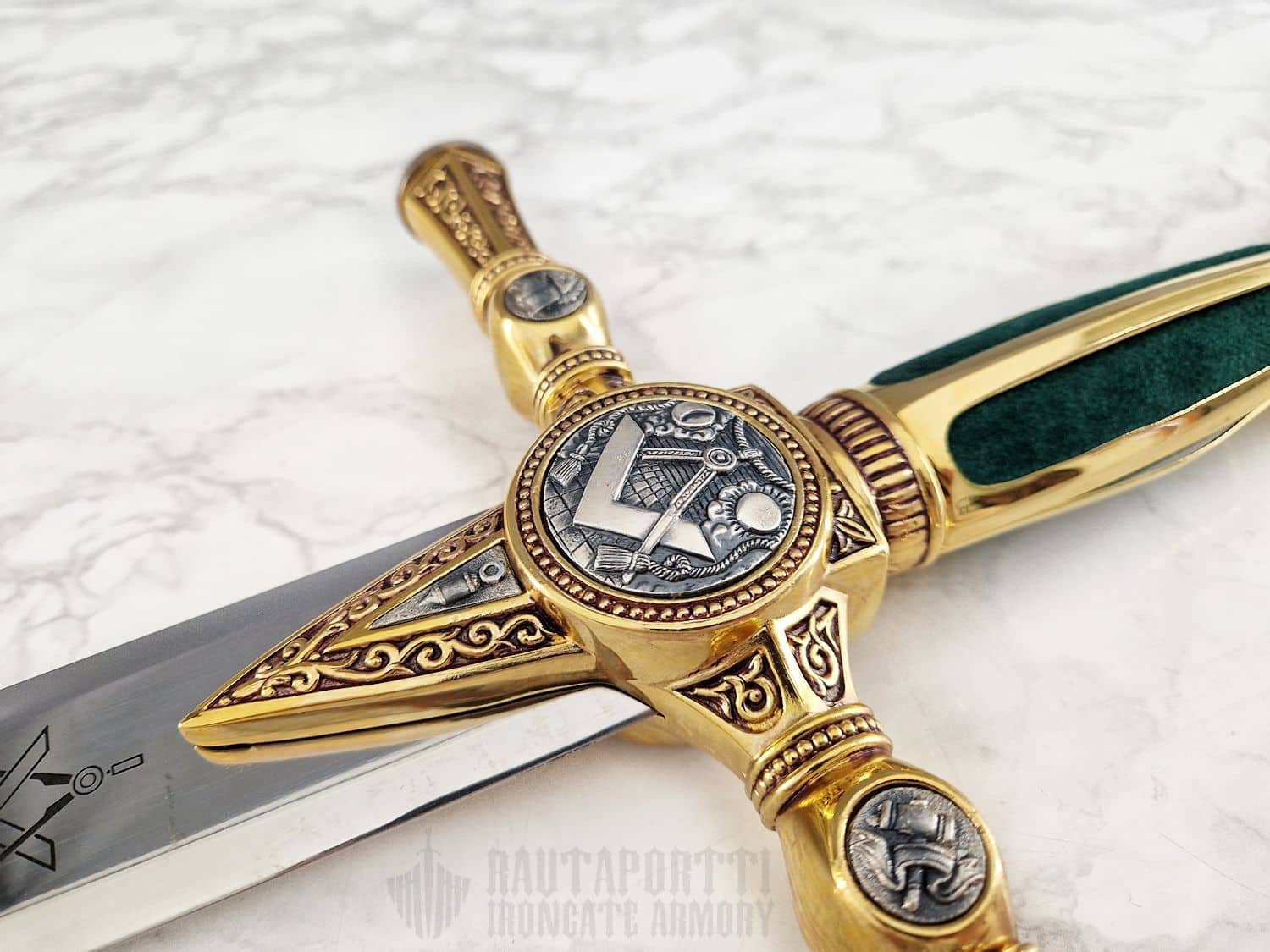 As a symbol the masonic sword represents not the typical destructive nature of a sword, but instead the pursuit of self-construction, dedication to self-improvement and understanding of the individual. The blade has deep etched decorations, and the gold-coloured hilt has silver fittings. The grip is decorated with green velvet for a luxurious feel.