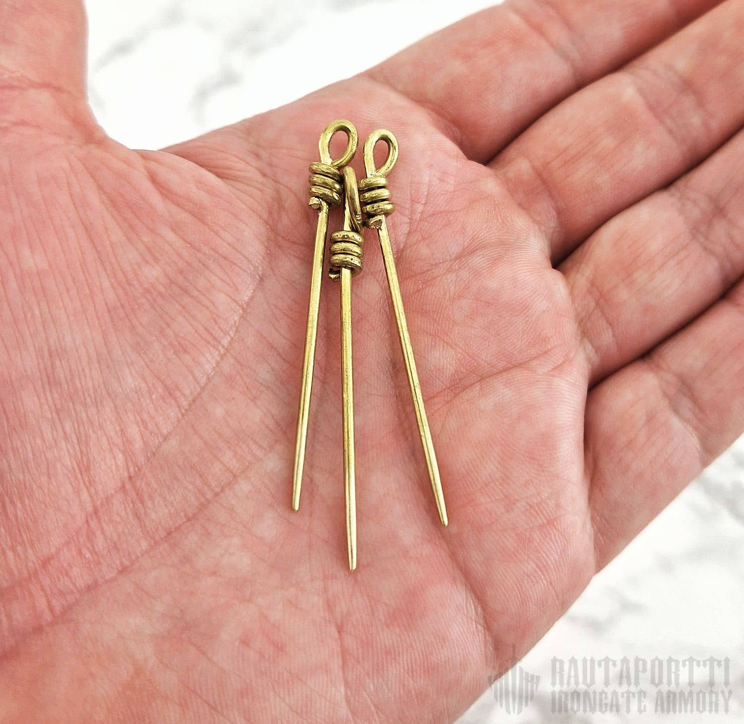 These medieval pins are made of brass. They are designed to be used as veil pins, to attach veils to an undercap, but they can also be used to bring a touch of history to modern everyday life, where ever you'd use sewing pins.