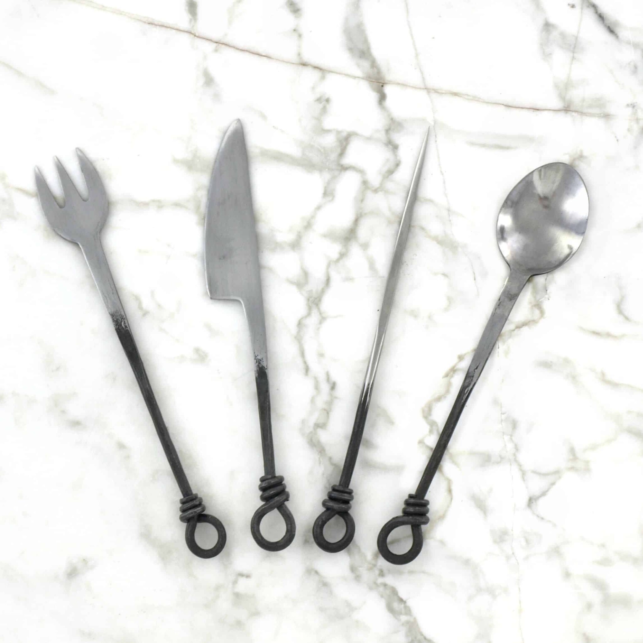 - Historical set containing hand forged eating pick, fork, knife and spoon