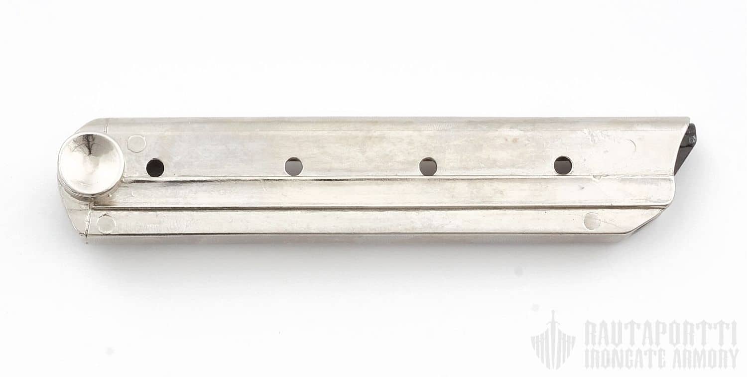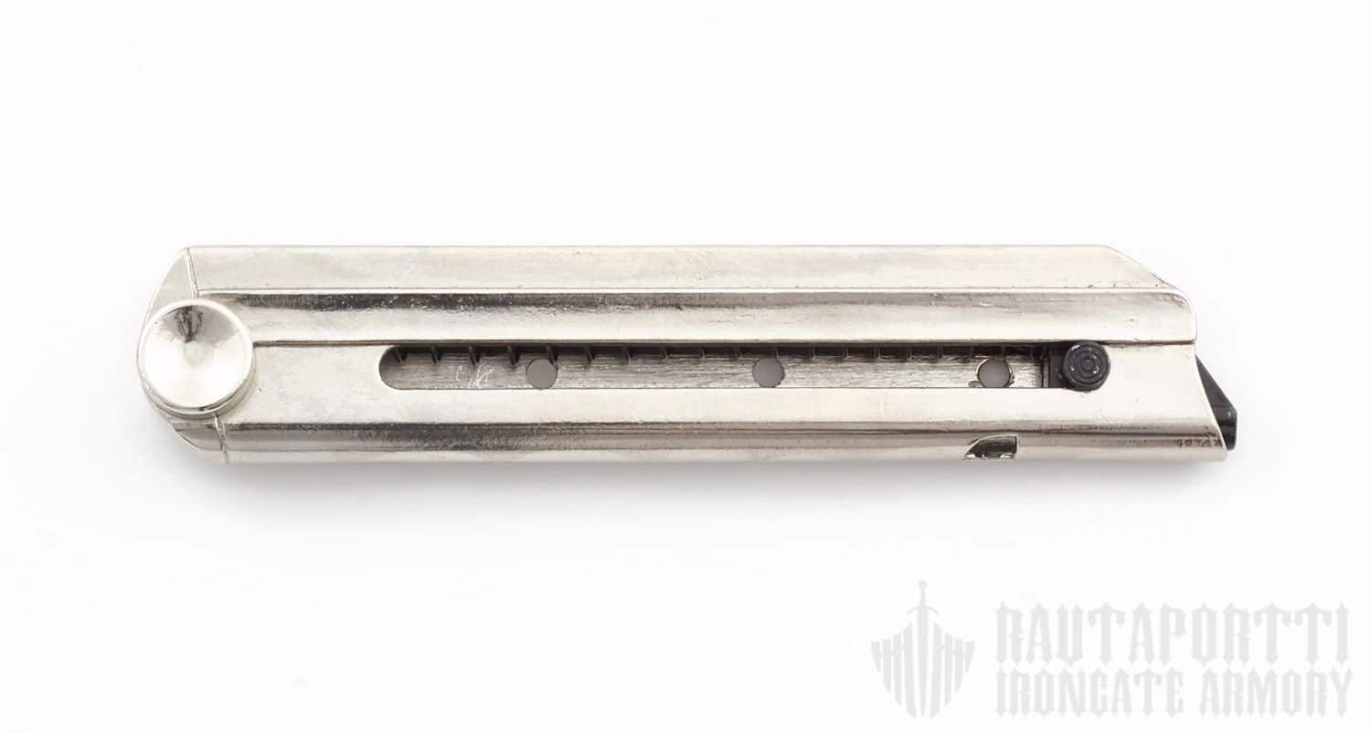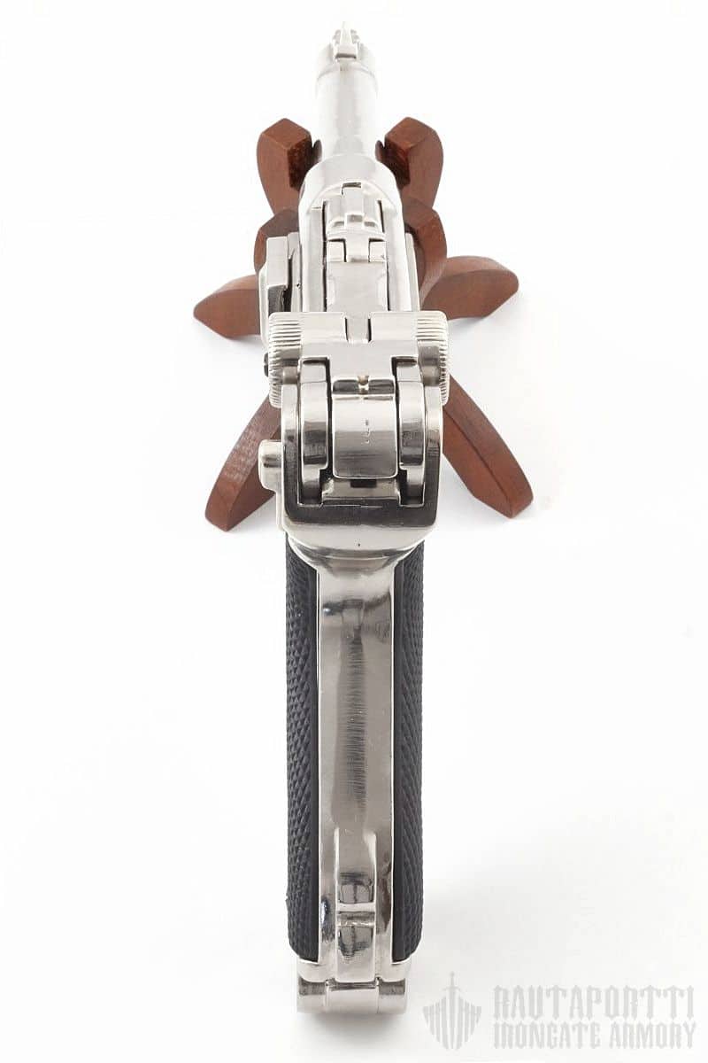 After Germany was defeated in World War I and Europe was in ruins, the manufacture of this pistol continued in Germany, albeit in a 7.65mm version, after the Treaty of Versailles banned Germany from making 9mm weapons. Between the world wars, Lugers was bought by the Netherlands, Persia, Portugal, Sweden and Finland. The 8,000 units purchased by Finland as service weapons for the Defense Forces were named the 7.65 mm Pistol m / 23, and the weapon was in very common use in Finland during the Second World War. In addition to the Defense Forces, these pistols were also purchased by the thousands before the Winter War by the White Guard and by private individuals. Lugers were sold in the 1930’s, e.g. in the sports department of the Stockmann department store. During the Winter War and the Continuation War, the Lugers were mainly at the forefront of the combat forces. In addition to officers, this pistol was a service weapon for several non-commissioned officers, armored personnel, pilots, and machine gun crews.