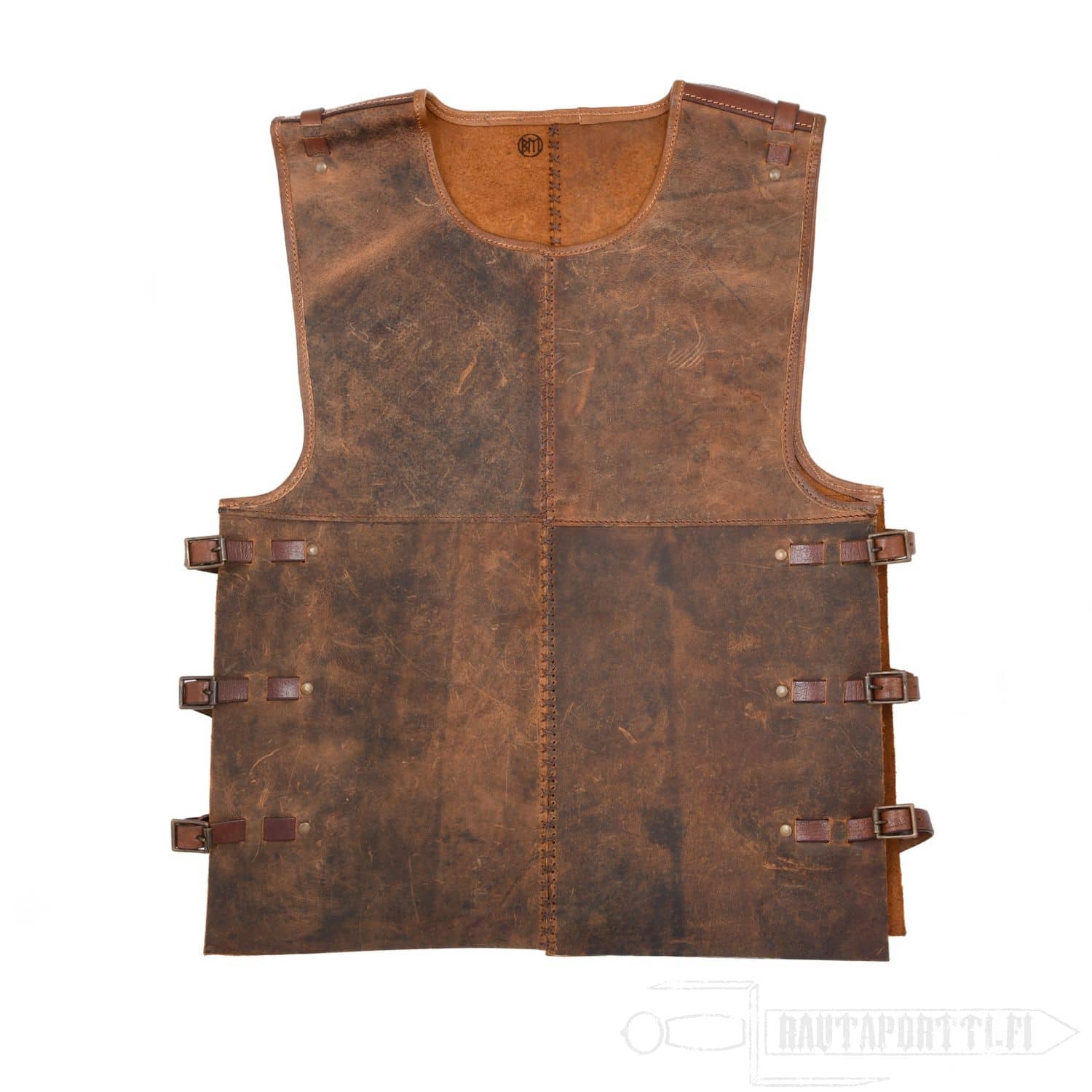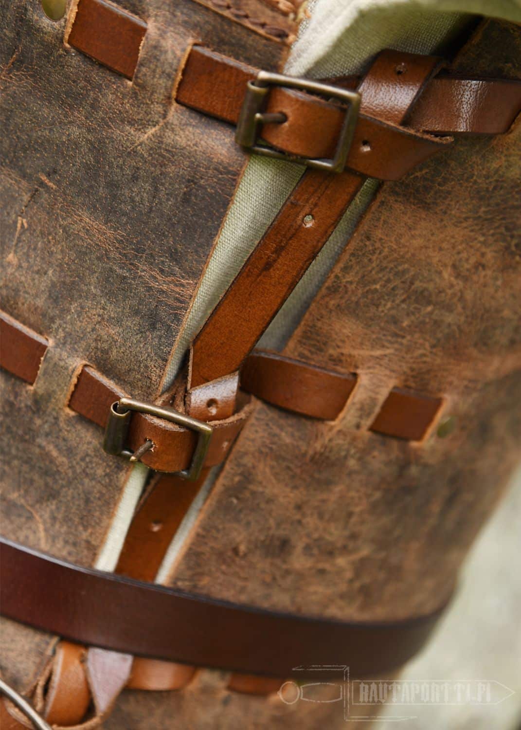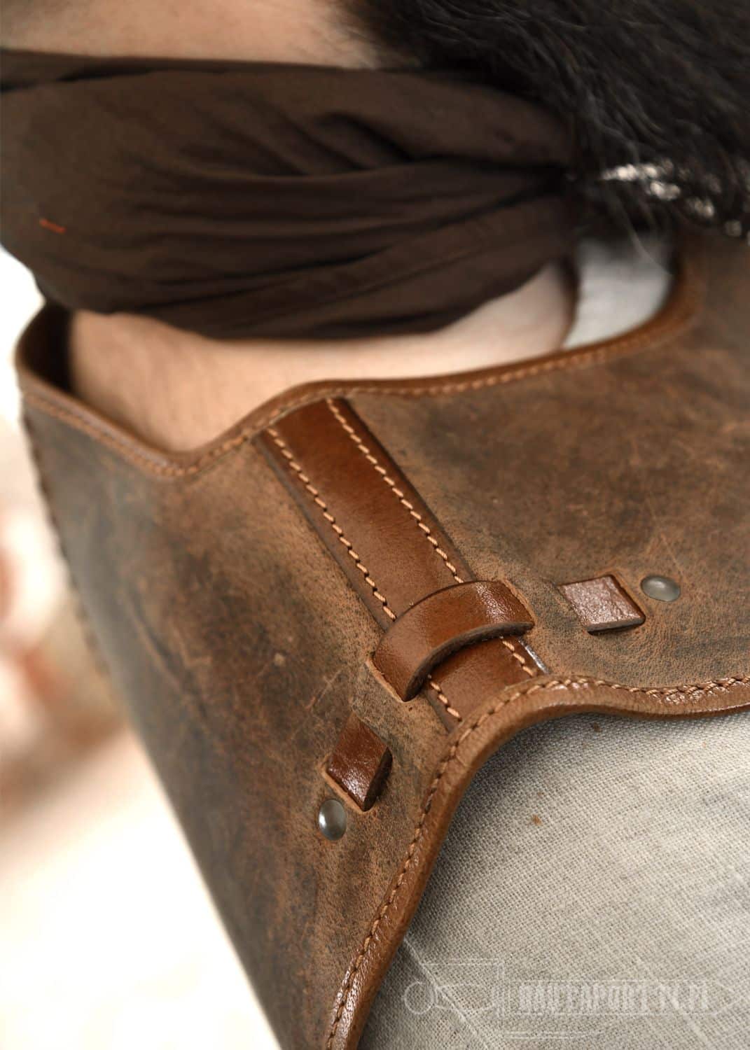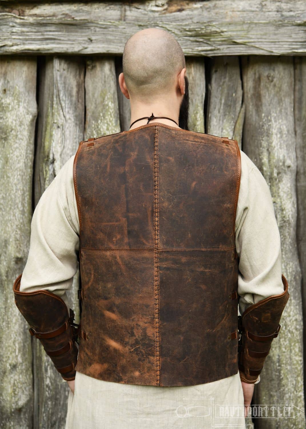 Crafted from multiple pieces of pull-up leather, this armor is assembled with hand-stitched decorative seams. Over time, the oiled leather develops a distinctive patina, giving each suit of armor a unique, rustic look. Signs of wear, such as light scratches, enhance its beautiful used look. Oiled leather is very soft and flexible, so the armor remains comfortable to wear even for long periods, such as at a medieval market.