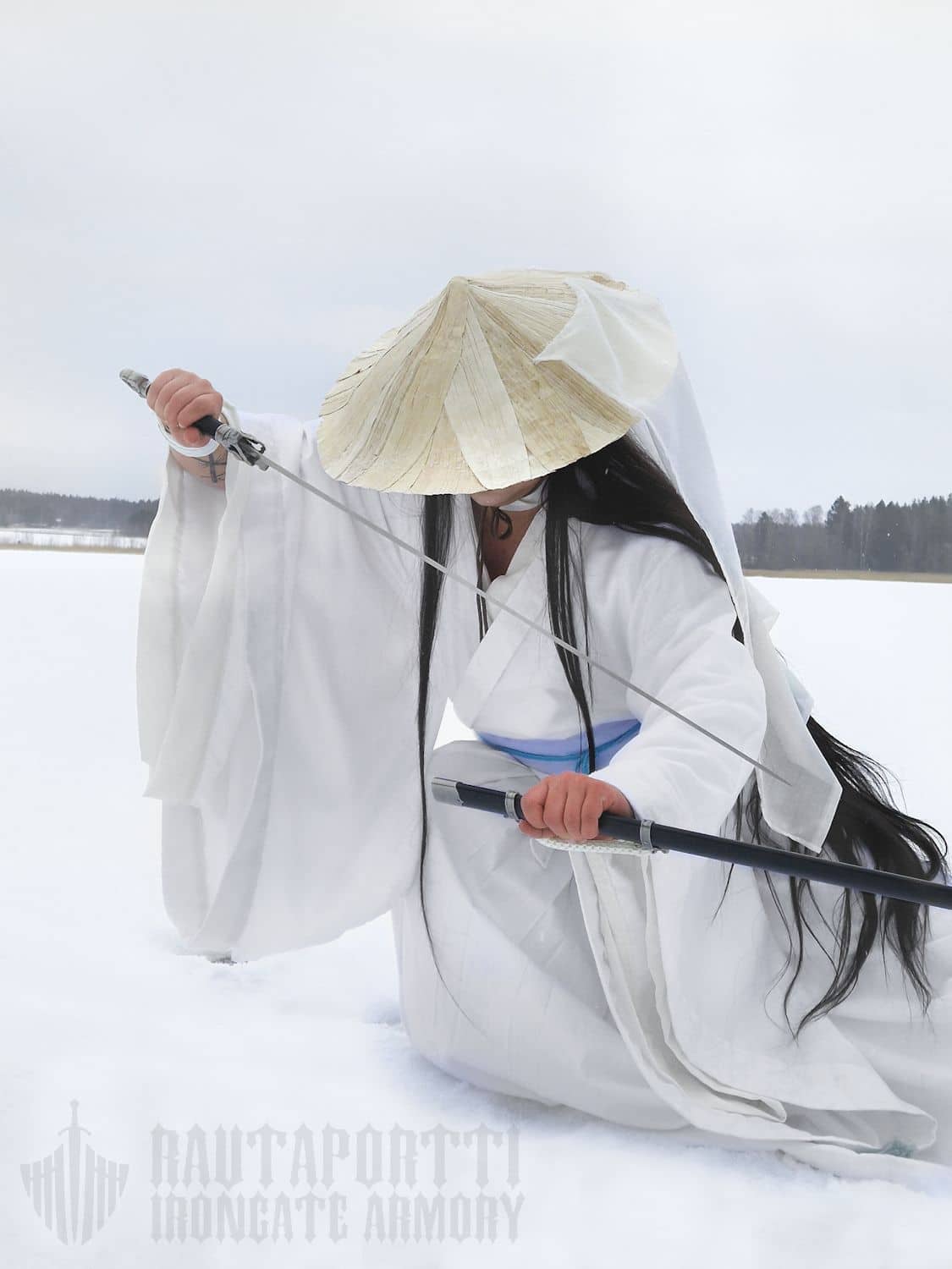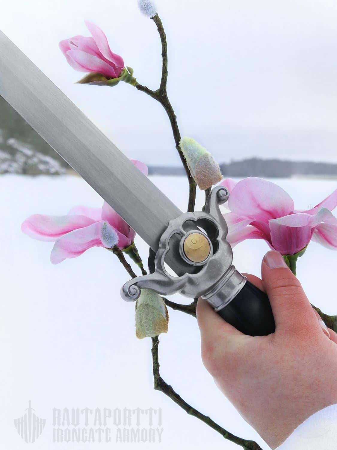 Featuring a steel guard and pommel, the swords are correctly balanced. The blades are crafted in fully tempered high-carbon steel. The flattened-diamond blade section produces a blade that is moderately stiff, while still allowing for some flexibility.
