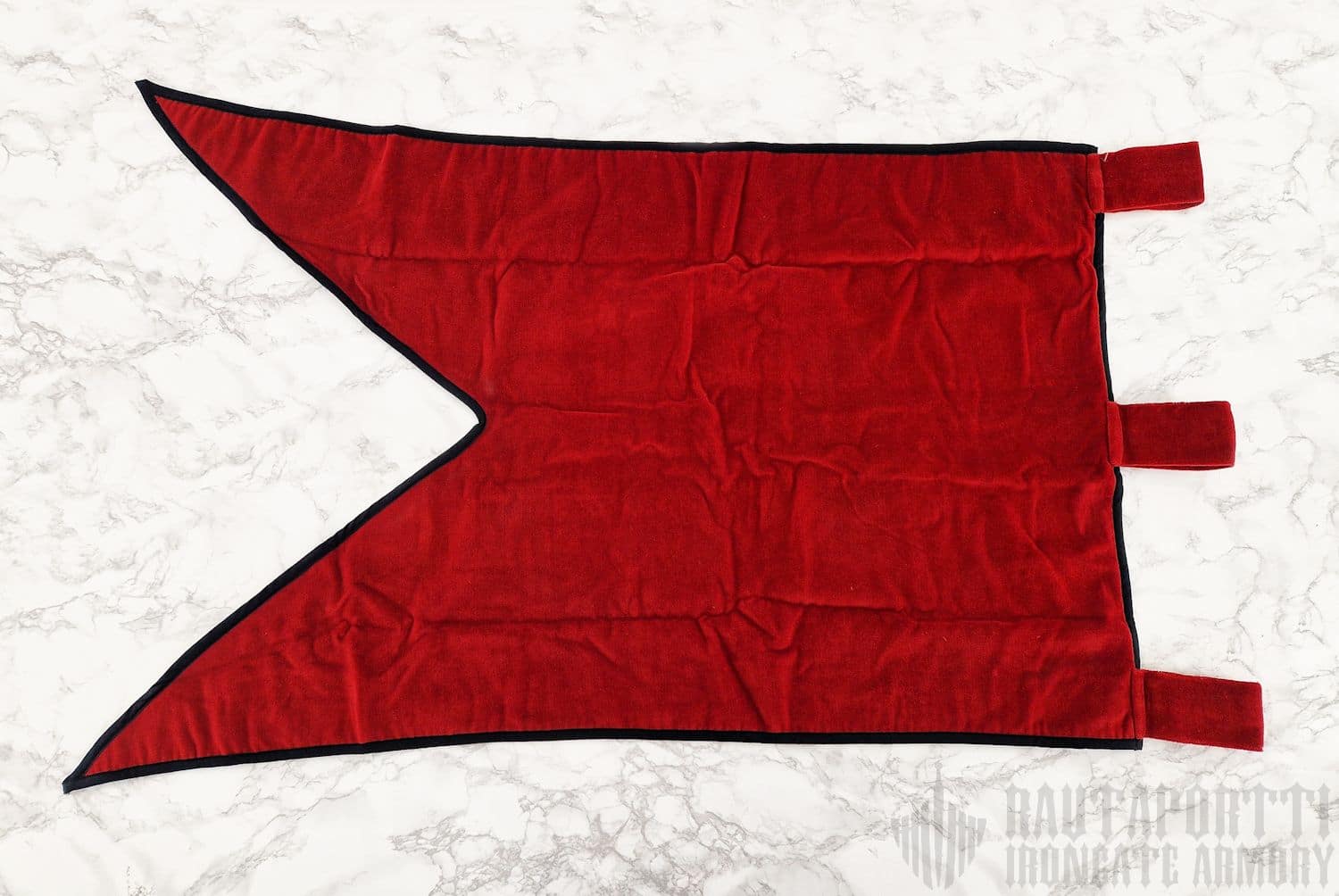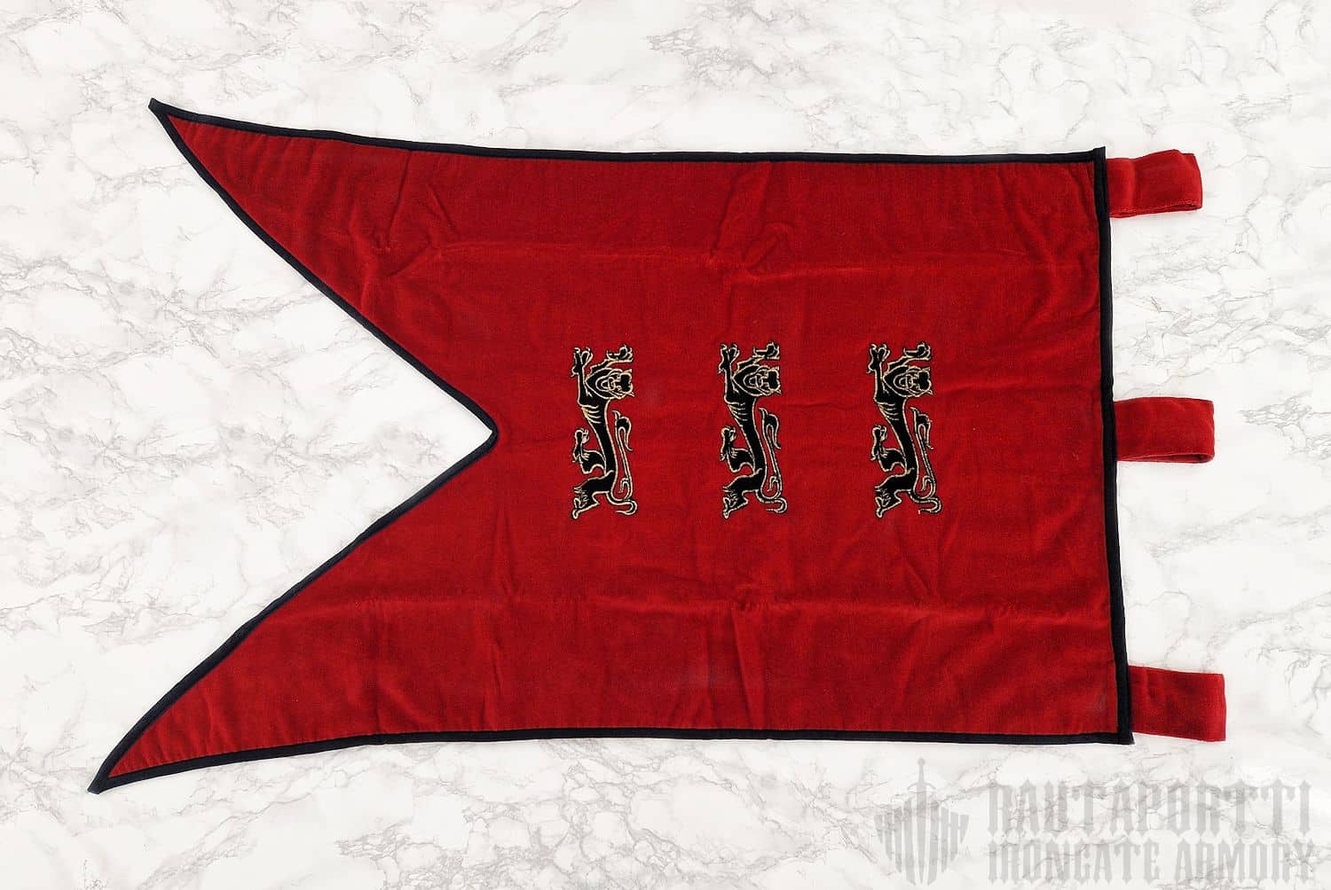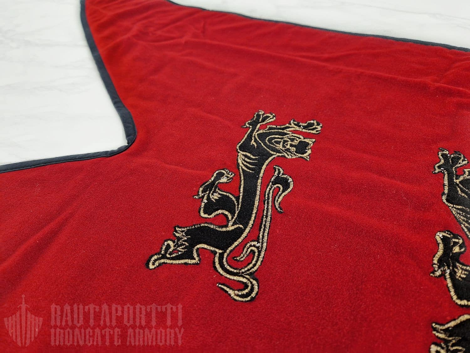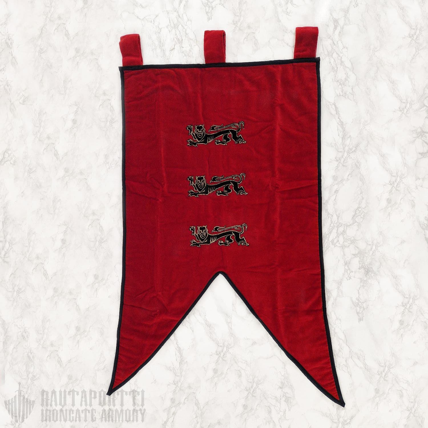 This luxurious banner is made with thick red velvet, and the three lions are embroidered to the front. The banner has three fabric loops for either hanging it on your heralds trumpet, or simply on a curtain rod or a pole for adding a touch of medieval charm to your home decor.