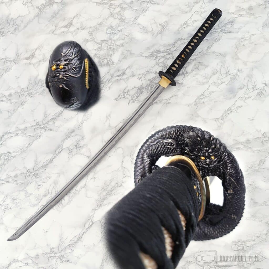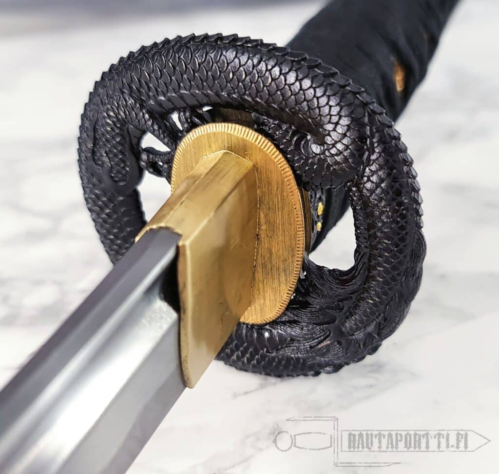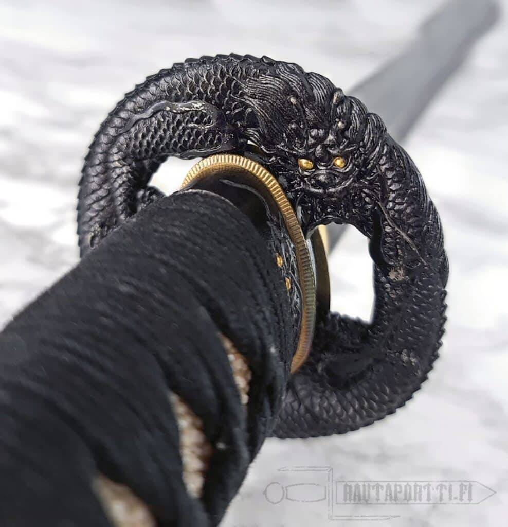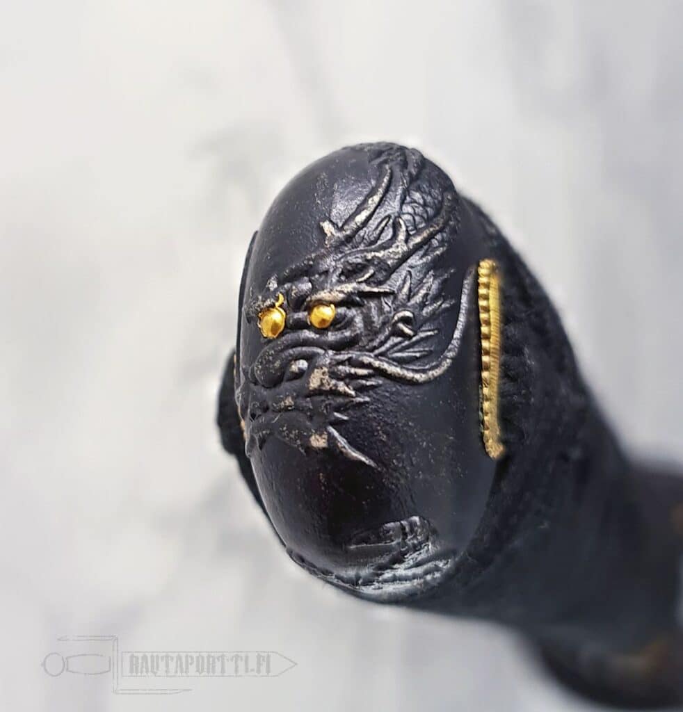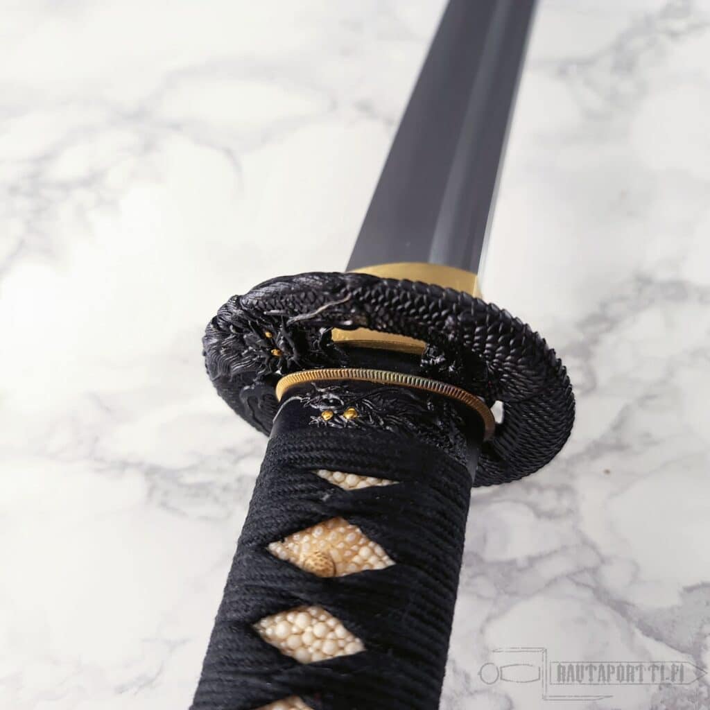 - Mythical dragon depicted on the tsuba and kashira with golden accents