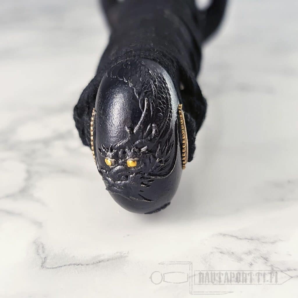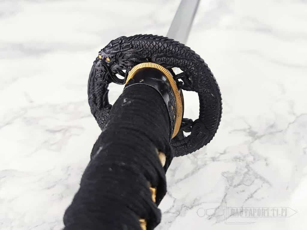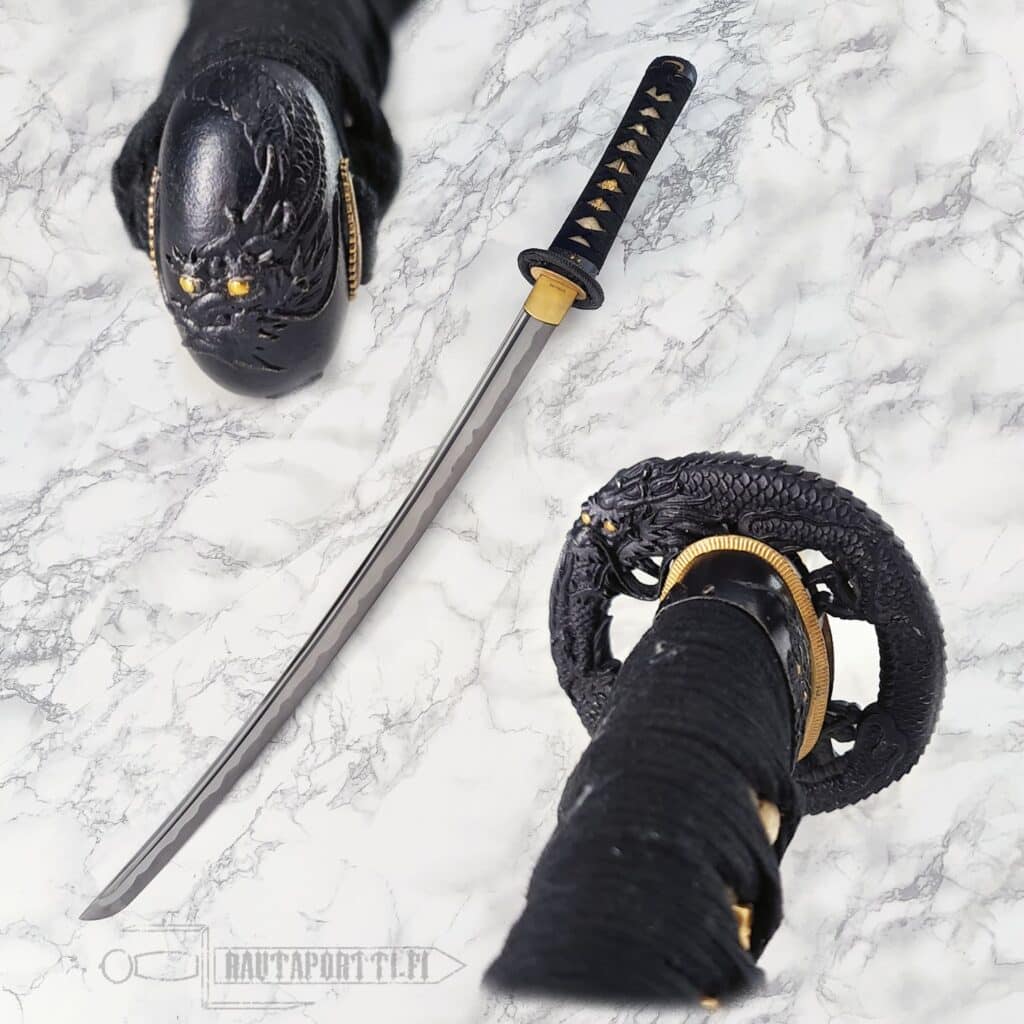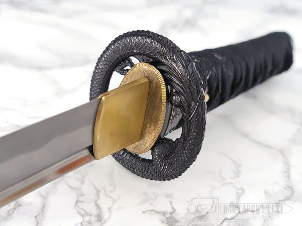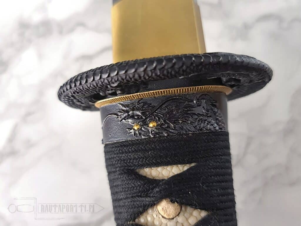 - Mythical dragon depicted on the tsuba and kashira with golden accents