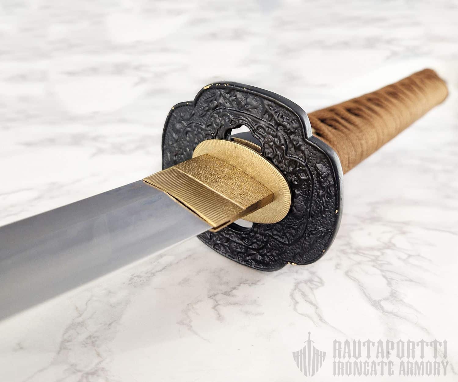 The gorgeous beaver-tail shaped saya is carefully curved to match the sori of the katana. The wood for the saya has been carefully chosen to best withstand time, as well as changes in temperature and humidity, without any additional laquer or paint required. It truly takes a master swordsmith to be able to bring this kind of a design to life, as it takes years of practice to master shaping wood in this manner. The fuchi, kashira and tsuba are made of blackened iron, while the new habaki and seppa plates are brass. They are simplified to create contrast as well as highlight the sophisticated color scheme, and to give the details the attention they demand.