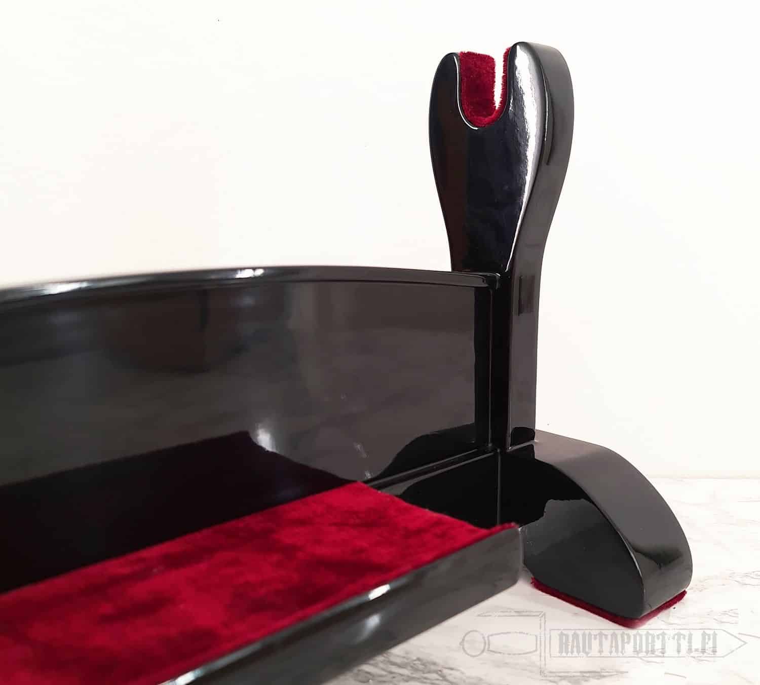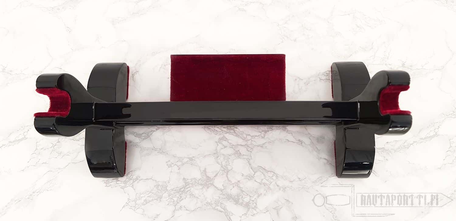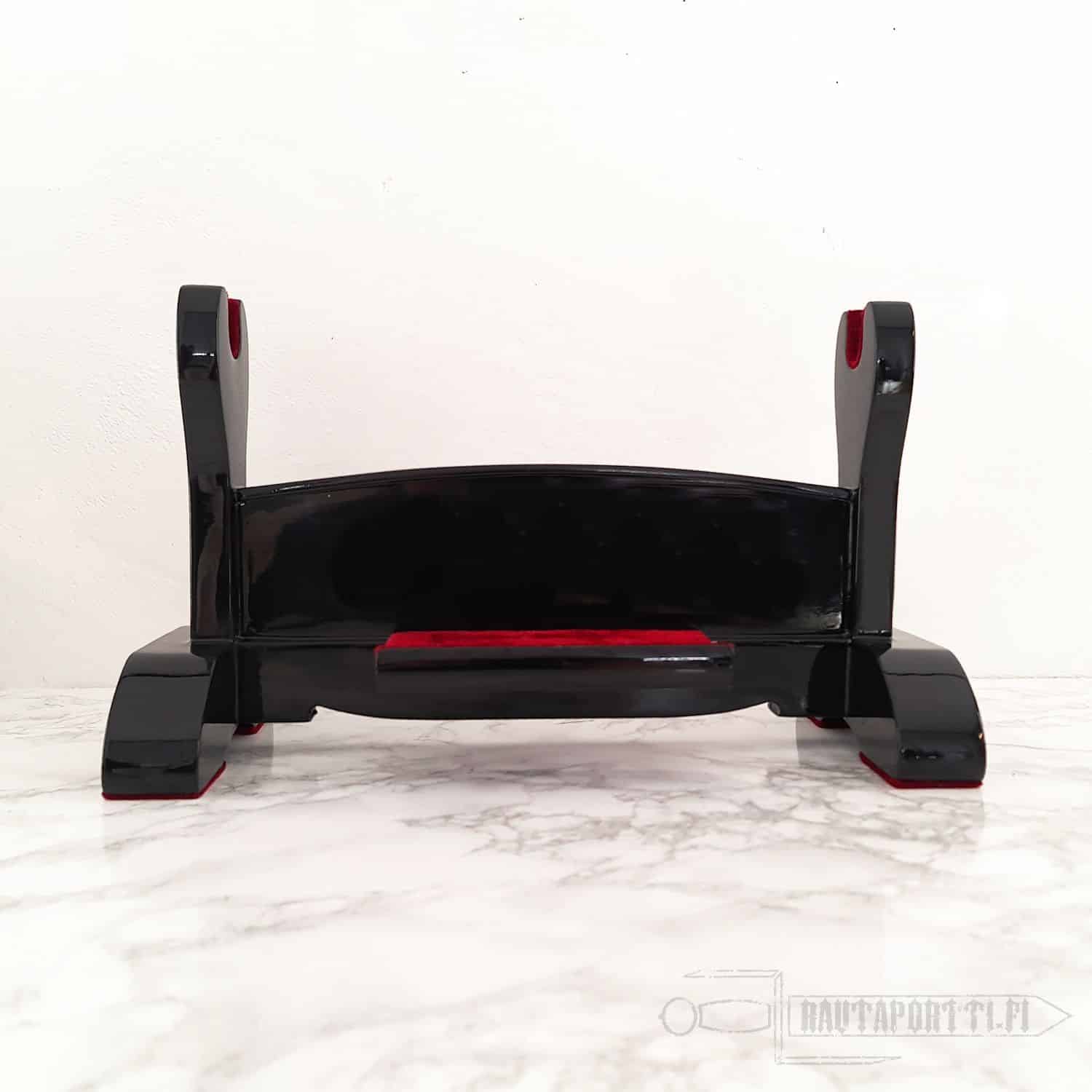 This stand for single sword is hand made of high quality oak and is lacquered black and polished. Stand features a padded shelf for a Tanto or maintenance kit.