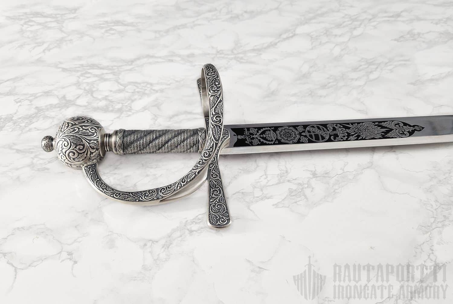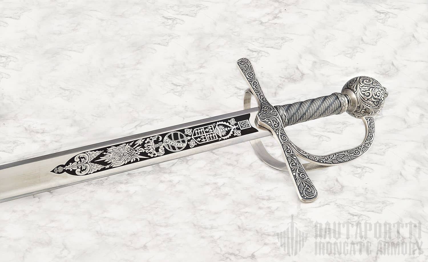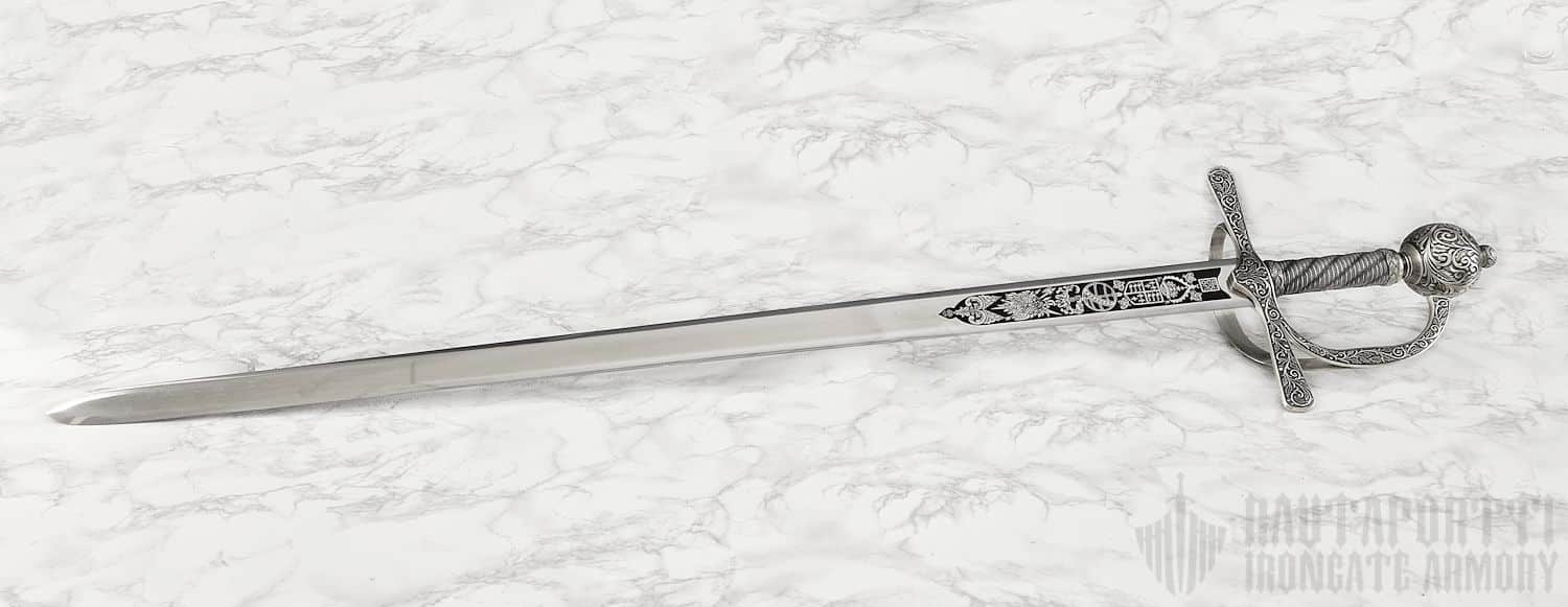 The engravings on the blade show a Royal Crown, a Tudor Rose, and an astrolabe, which symbolizes his circumnavigation of the world. The hilt, guards and pommel are decorated with oak leaves and acorns.