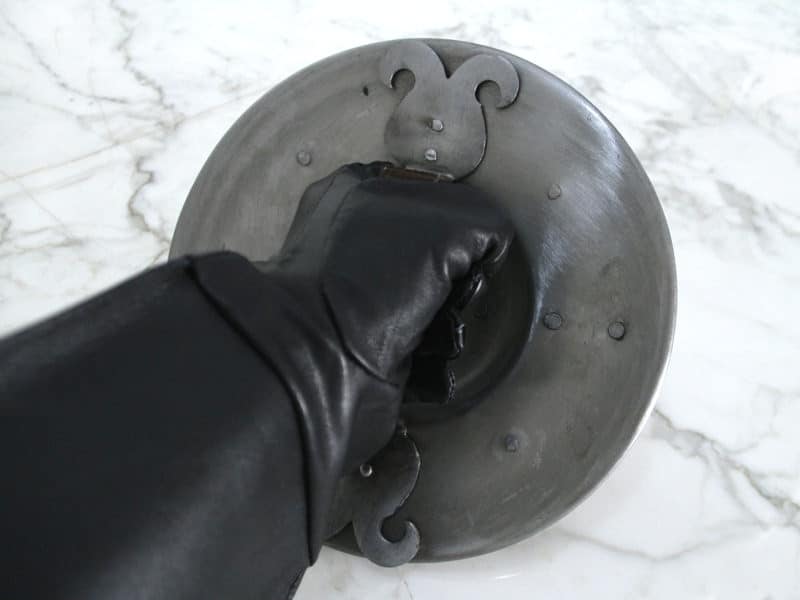 Bucklers, shields gripped with the fist, were frequently used in combination with single-handed swords from the High Middle Ages to the Renaissance. They are useful for shielding from, as well as giving out blows. The handle is riveted firmly to the shield and wrapped in leather for comfort and to cushion shocks.
