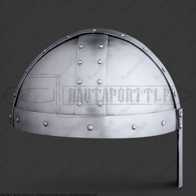 The spangen-framework and noseguard are made of 2,5 mm steel and the the metal plates forming the bowl are made of 1,6 mm thick steel. Comes with natural canvas lining/padding. Steel thickness may vary due to the handcraft methods used in manufacturing.