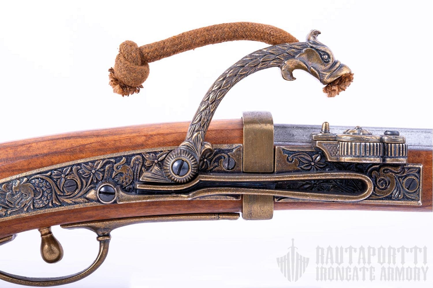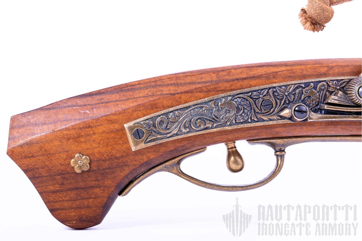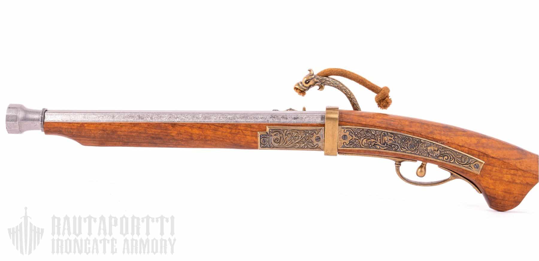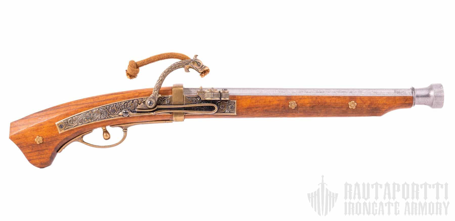 I am very pleased with the purchase, and I warmly recommend for Iron Gate Armory buyers to buy this matclock “pistol”. It is very nicely done gun with an opening priming pan and functional mechanism for dry firing. It is not actually a pistol but what Japanese called Bajo-zutsu (a horse riding gun), with longer gun barel ”pistol”, a longer version of a “Pistol” then tan-zutsu ( around 35 cm). The conquistadors used the similar type of gun on a horse in the Conquest of Americas. If you have issues with space, you would not make a mistake for buying a weapon which was used by mounted Samurai as a status symbol and a weapon, and was easier to load on horse back. It’s effective range according to historians and reconstruction was 10 to 15 meters or even a little bit more on a man sized target. longer then a standard flintlock pistol (which were around 35 cm in lenght) which had maximum effective range of 5 to 10 meters, if not point blank.
