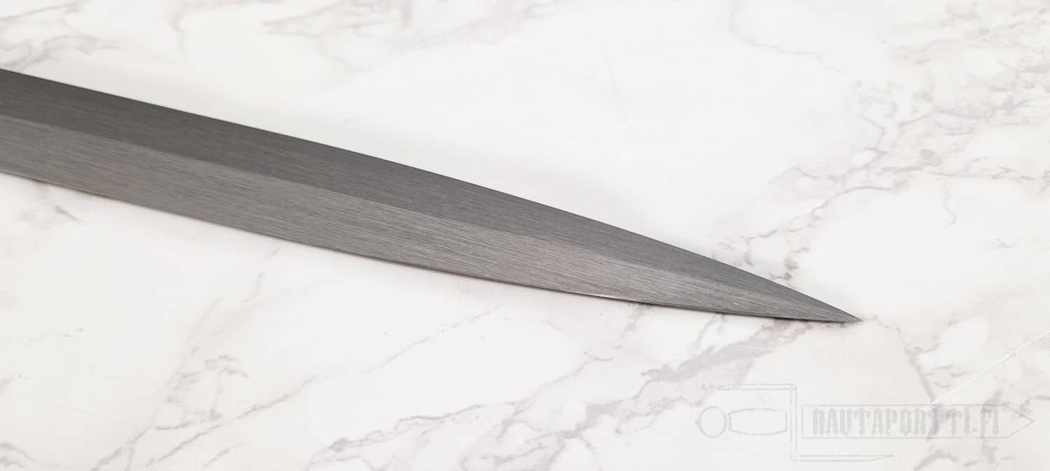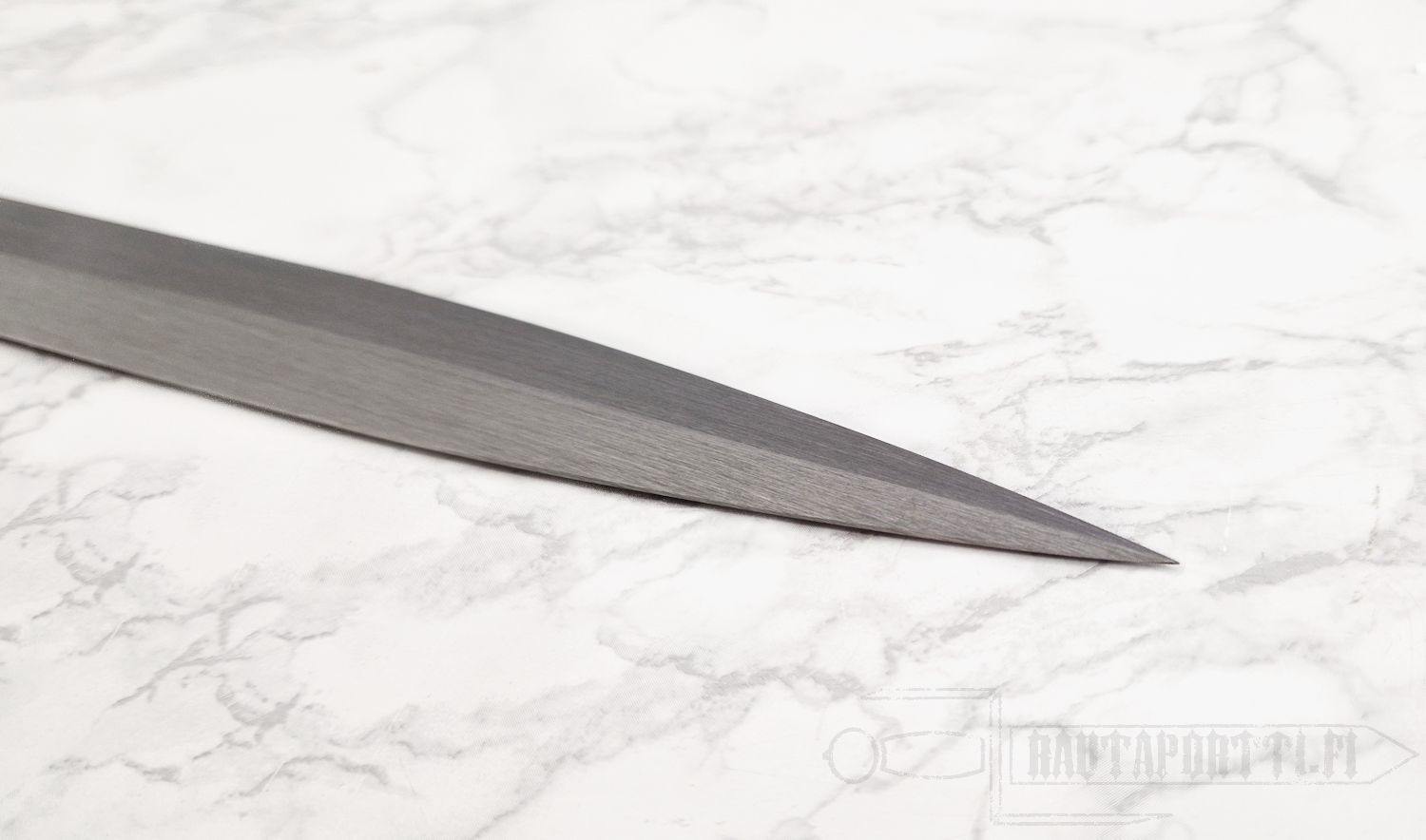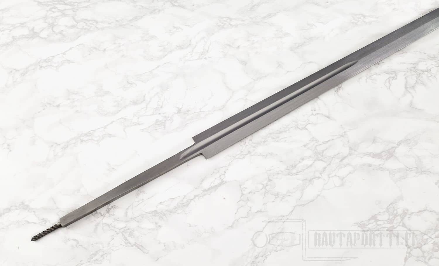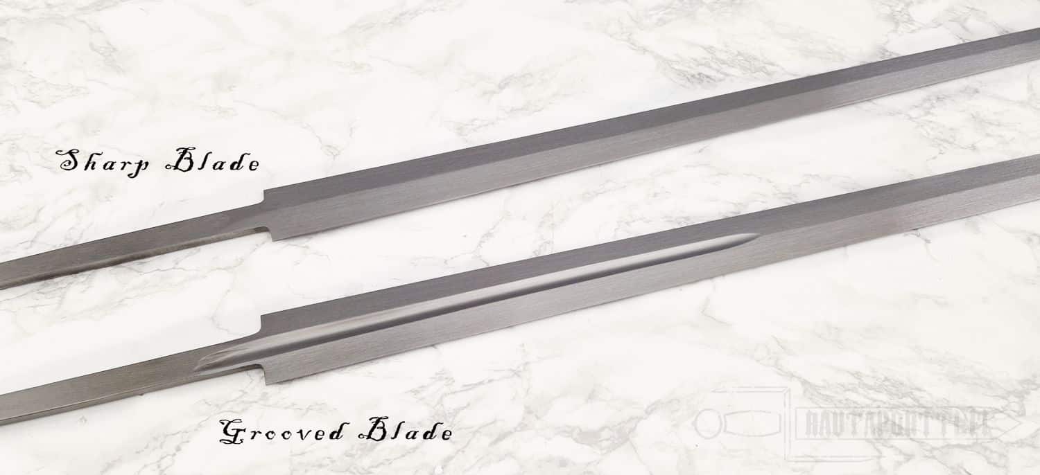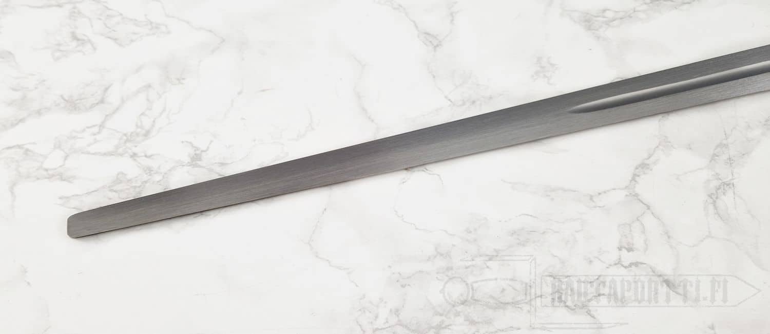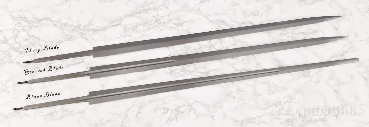 The sharp version features a blade which is diamond-sectioned throughout its length, with a strong central ridge without a fuller. The taper of the profile makes the sword lightning-fast and light, and excellent for thrusting, but also sturdy enough for cutting. The blunt trainer blade has a broad 3/4 length fuller to compensate for the required thicker edges for safe sparring practice, and a rounded tip. The third option is a sharp version with fuller, which has a different blade profile to the other sharp one.