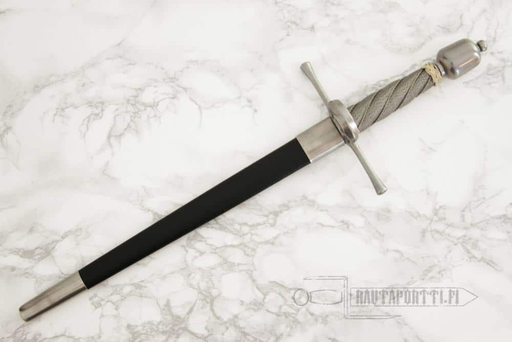 The Torino Main Gauche features a blade of high-carbon steel which has been tempered and a stainless steel hilt for reduced maintenance. The grip is wrapped in twisted wire and decorated with two Turkish knots. If needed, the blade is interchangeable with a blunt practical blade, designed for safety during sparring. Comes with a sheath with black leather wrap and steel accents.