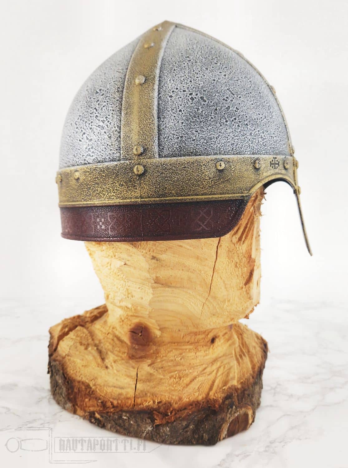 A Spangenhelm consists of the spangen, or metal strips, which form the framework of the helmet. This simple design was used all the way from antiquity through to the Early Middle Ages. By the 6th century it was the most common helmet design in Europe, since it was an effective protection that was relatively easy to produce. This type of helmet was often worn either with a mail coif or an aventail, and some helmets had separate cheek guards. Our helmet retains the nasal protection familiar from earlier helmets.The popularity of Spangenhelm lasted until the 12th Century. Eventually spangenhelms were replaced by one piece skulls, such as nasal helmets and kettle hats.