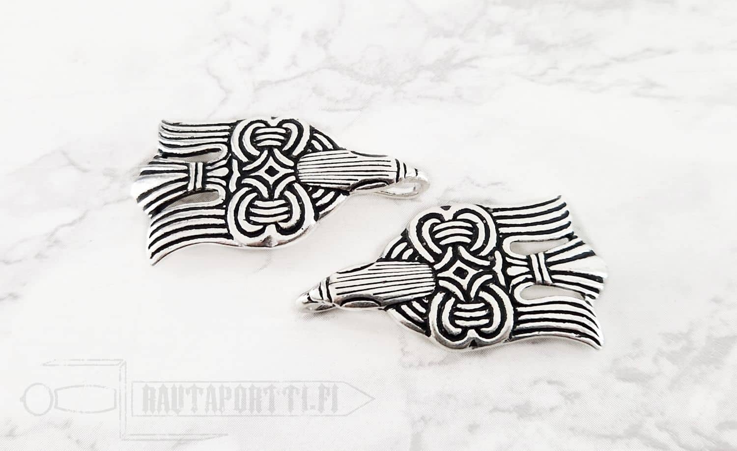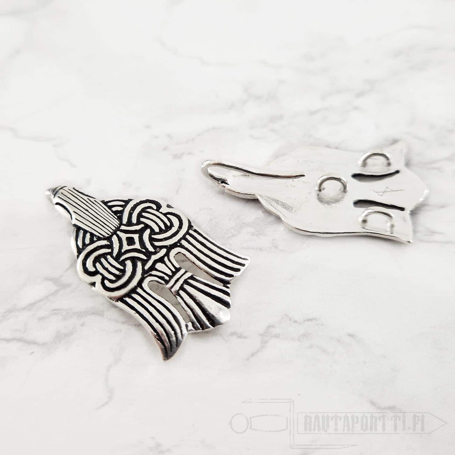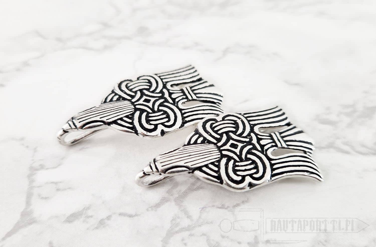 These leg wrap hooks are a replica of calf wrap hooks in the shape of two ravens found in a Viking settlement in Chernigov, Ukraine. They date to the 10th century. Almost identical raven shaped originals has also been found in Gotland, Sweden.