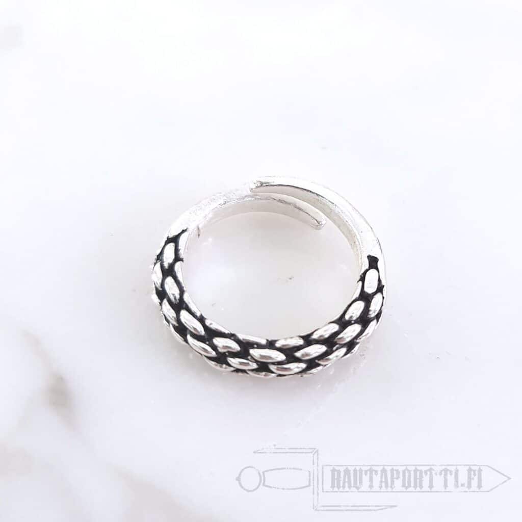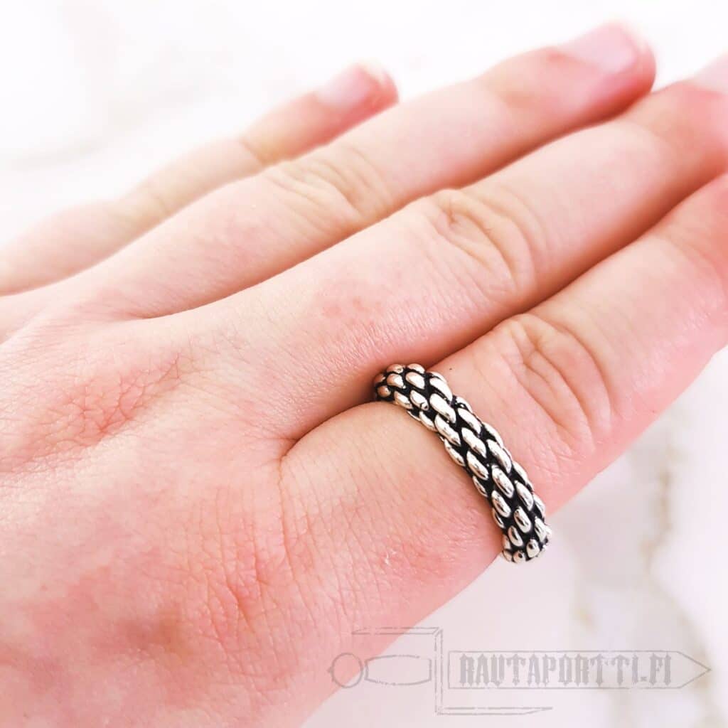 The ring is open, similarly to most rings from the Viking Age. This opening allows the Viking finger ring to adapt to a ring diameter of 17 to 21 mm. The Viking chain ring is plated with real silver, and it can be worn as a perfect accessory for historical reenactment, LARP costumes or as everyday jewelry.